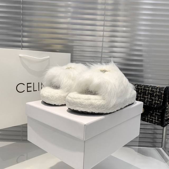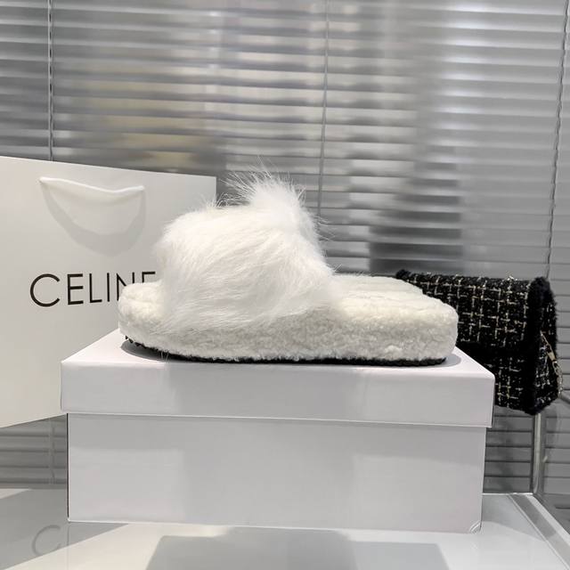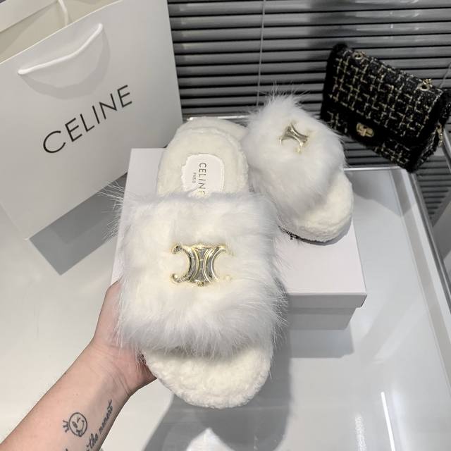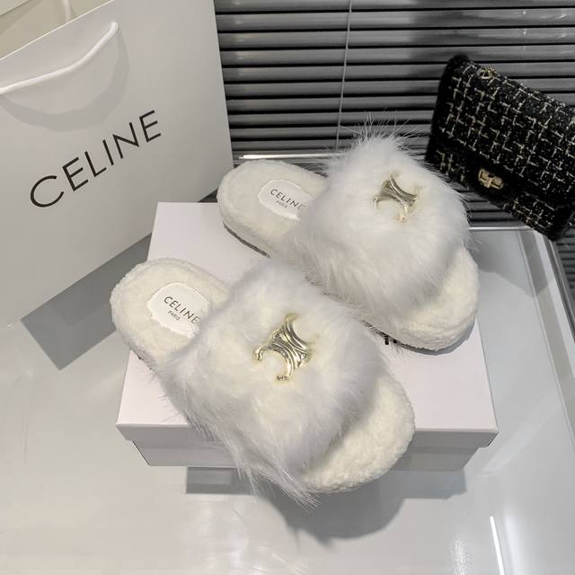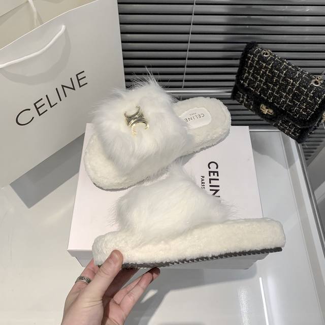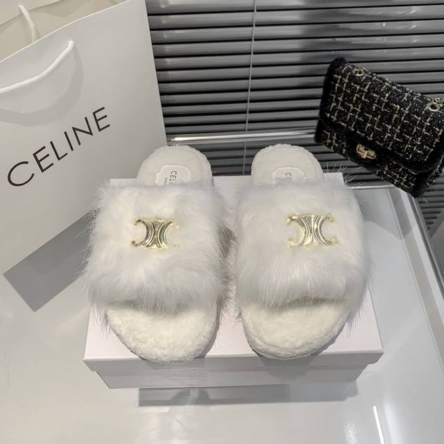 Celine 赛琳新款毛拖,新扣子搭配官网同步更新最新款版本,加量不加价新增加金属铁扣、日常休闲居家必备的一款保暖不说更加舒服防滑底设计强烈推荐 码数:35-4