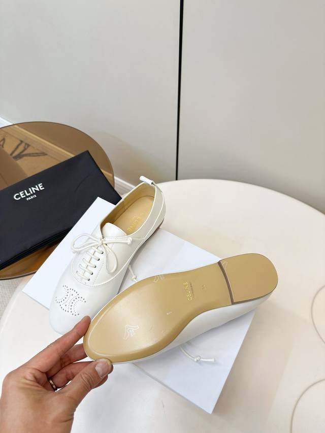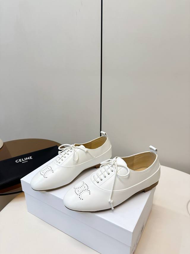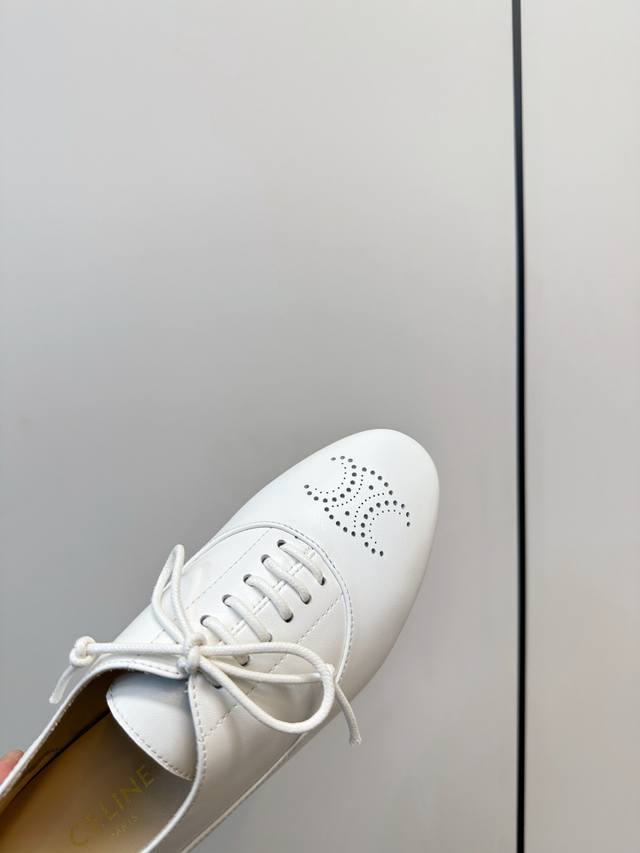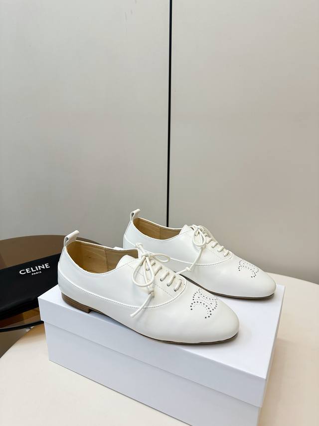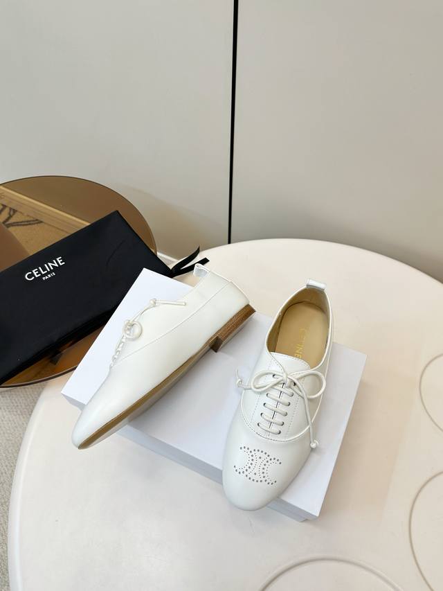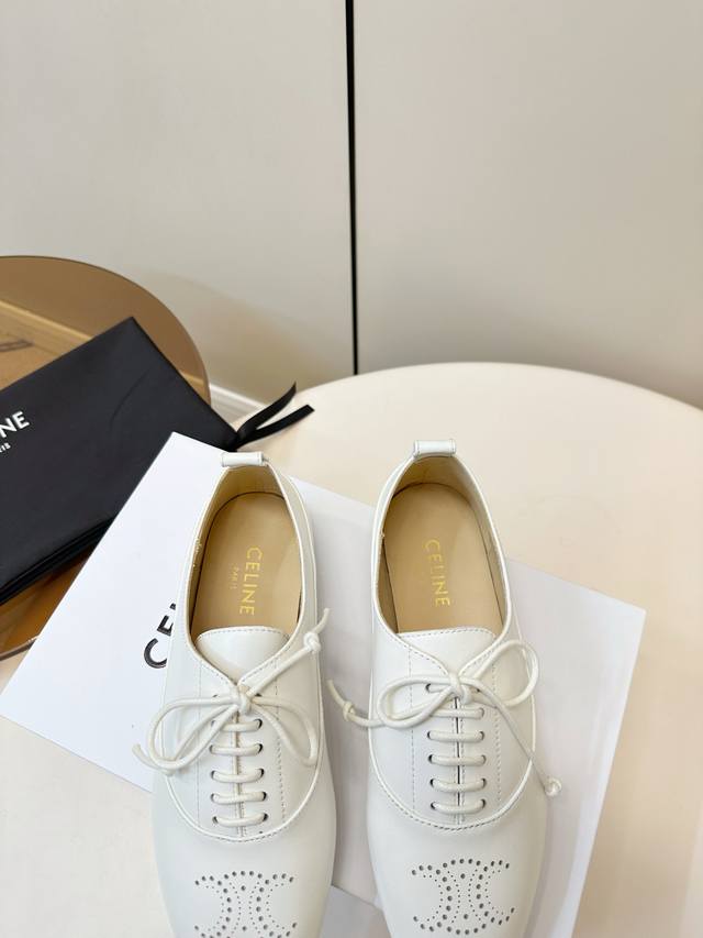 Celine 25p新品 英伦风平底乐福鞋 Celine这款乐福鞋,选用优质羊皮,鞋面简约+布洛克雕花,复古优雅气质满分 面料超级柔软细腻且有质感! 系带设计,