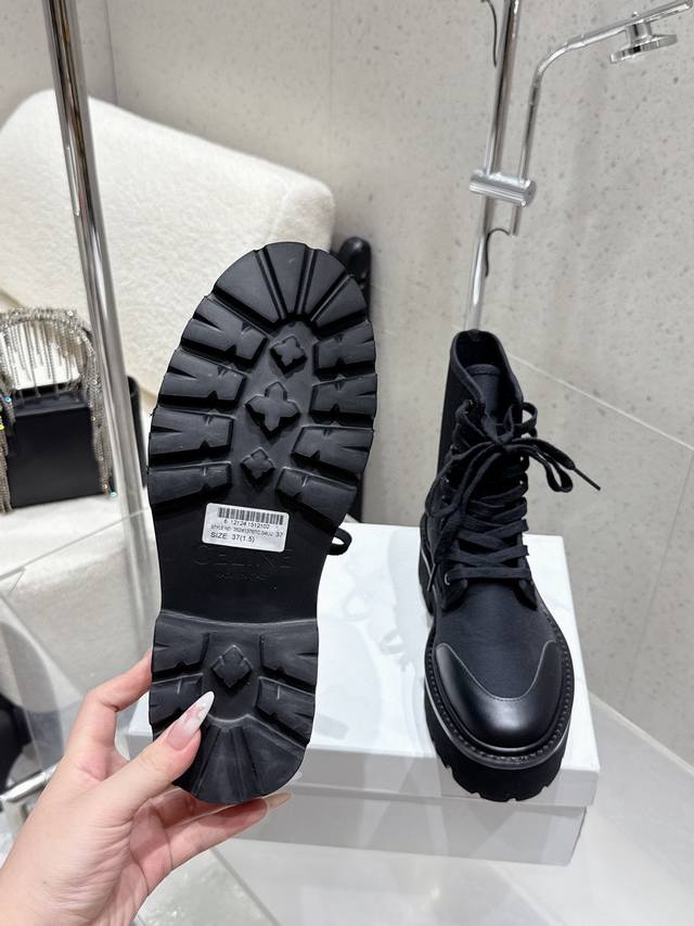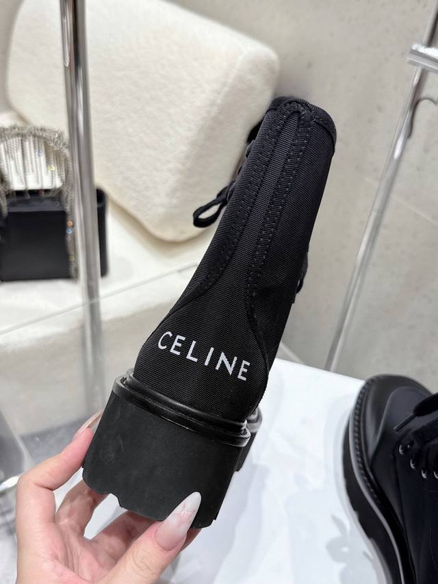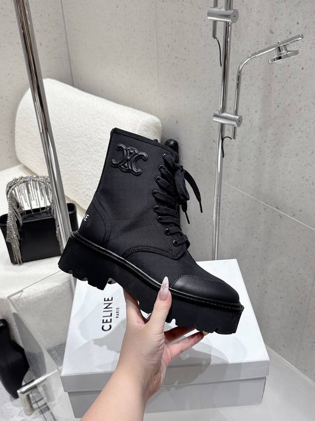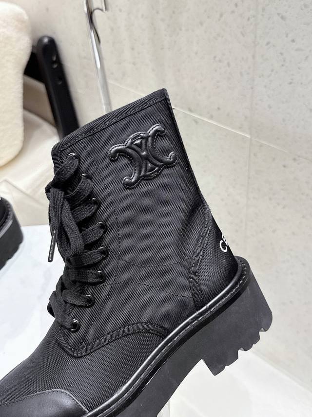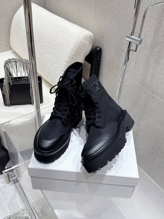 Celine2025年冬季新款 厚底帆布马丁靴|酷飒与质感的双向奔赴 黑色款是暗黑系的心头好,帆布与皮革拼接,厚底自带气场,标志性Triomphe标识彰显辨识度