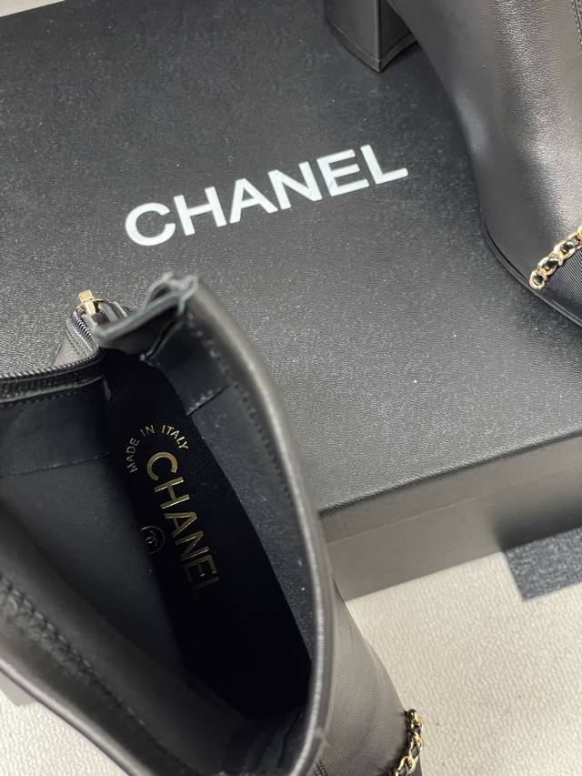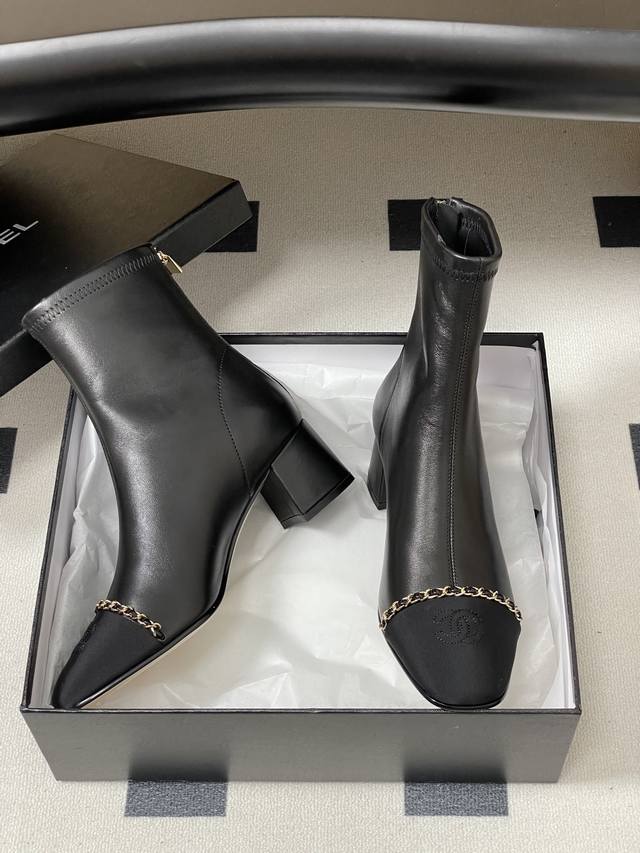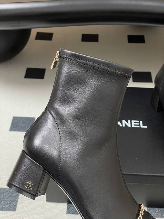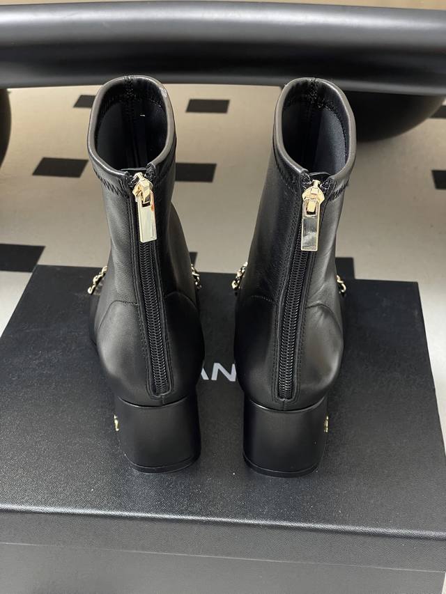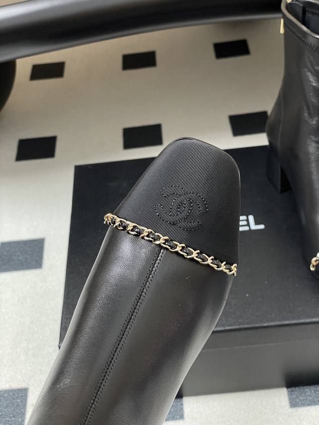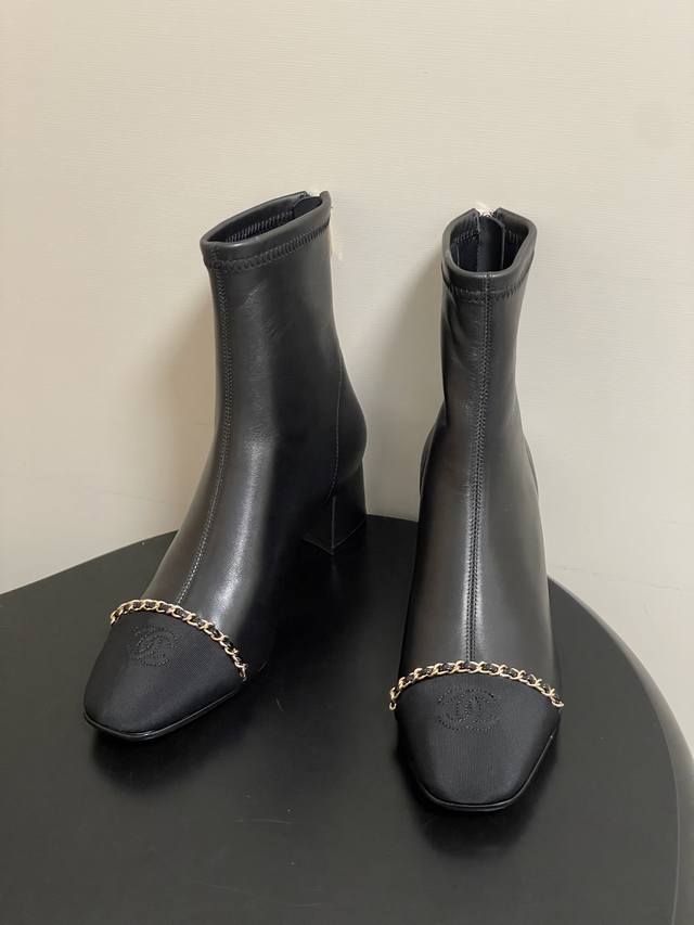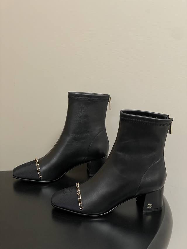 万年经典款 Chanel 小香经典链条方头粗跟短靴后拉链及踝靴高跟弹力短靴 香家气质高奢风延续。把品牌经典的穿皮链条元素运用到了鞋头上,真是完全长在香粉的审美上