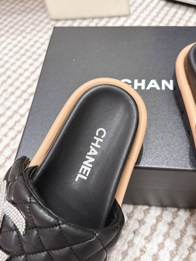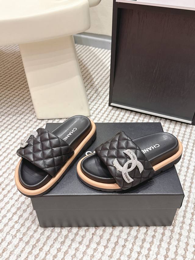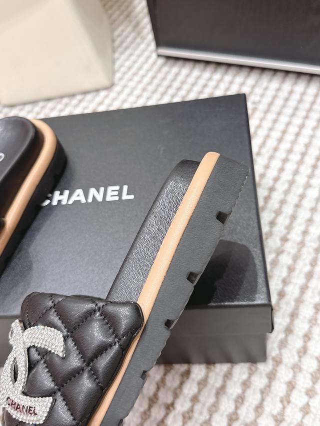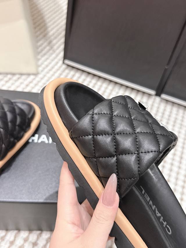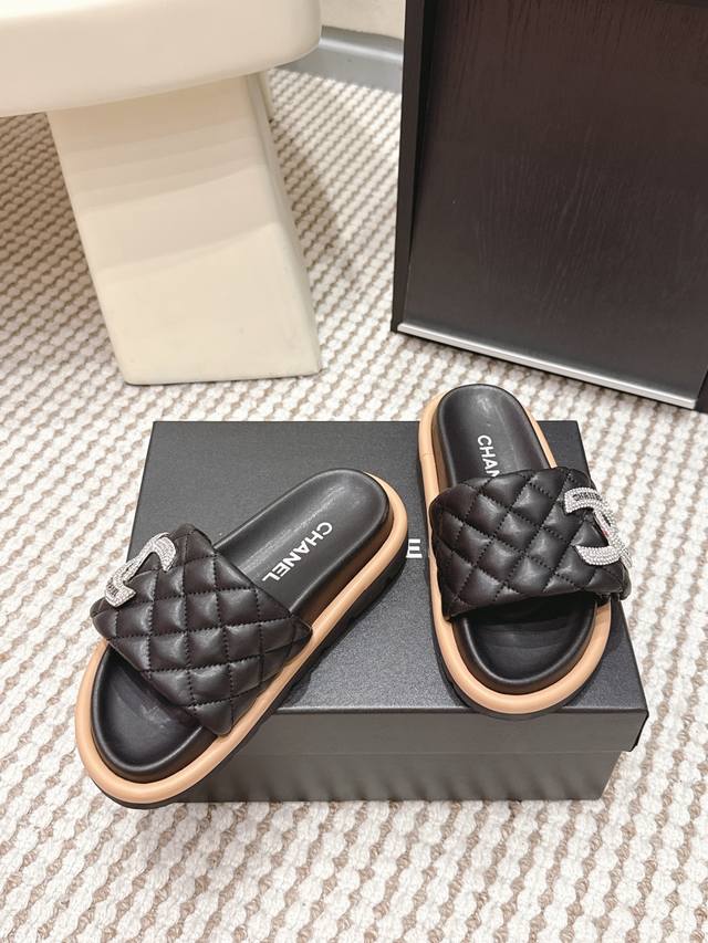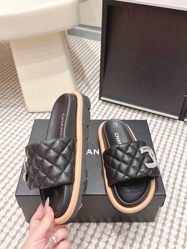 FFF 代购级 DDD Chanel香奈儿 2026春夏新款 菱格 水钻 拖鞋 DDD 香奈儿2026初春系列菱格水钻拖鞋,经典菱格纹+水钻双C Logo,品牌辨识度超高!Pu革鞋垫柔软舒适,橡胶鞋底防滑,日常穿超安心 DDD 黑色款低调奢华,裙装休闲都能搭,慵懒又精致。轻便易携,夏季出街或度假都很适合,时尚实用兼备。 DDD Size :35-39 40.41订做不退换 DDD