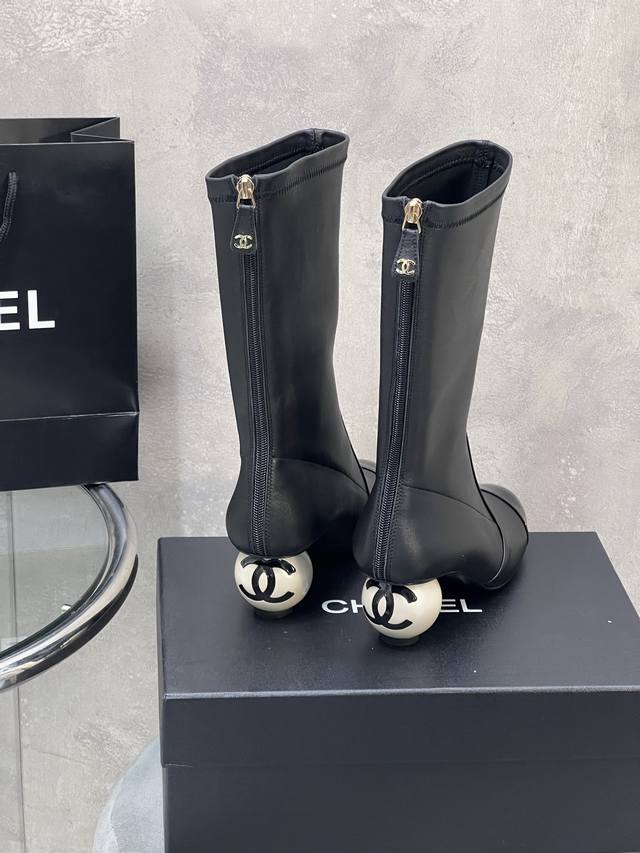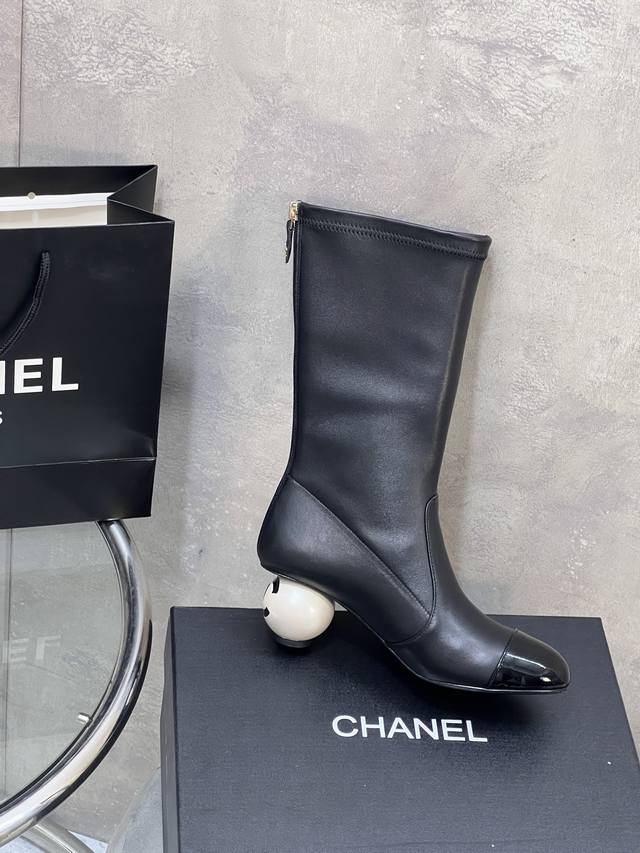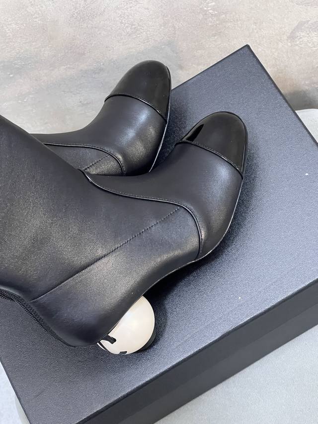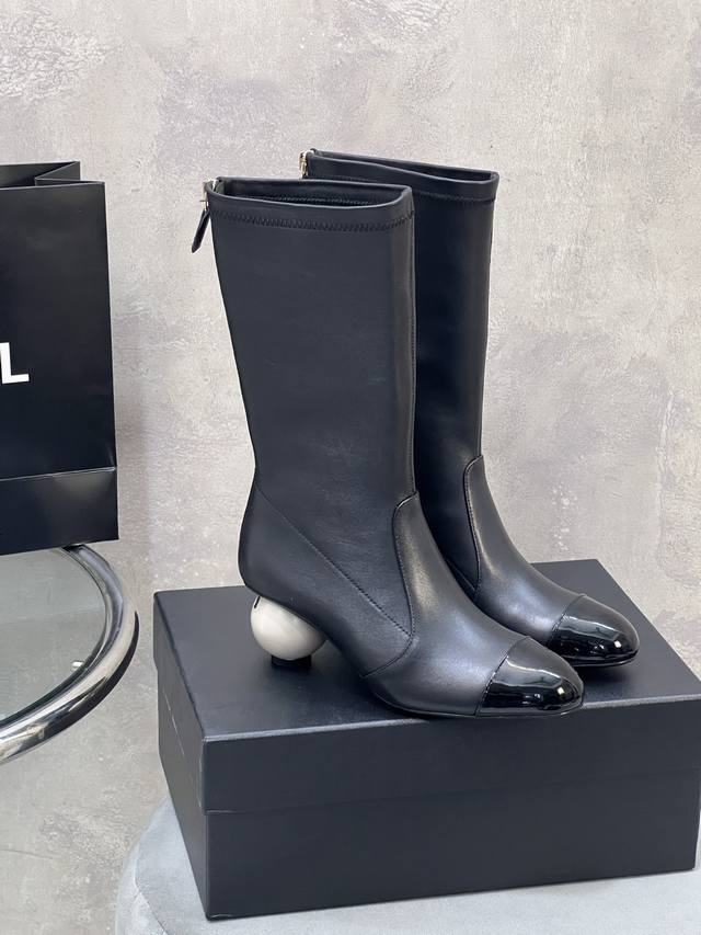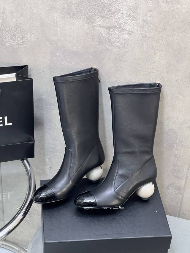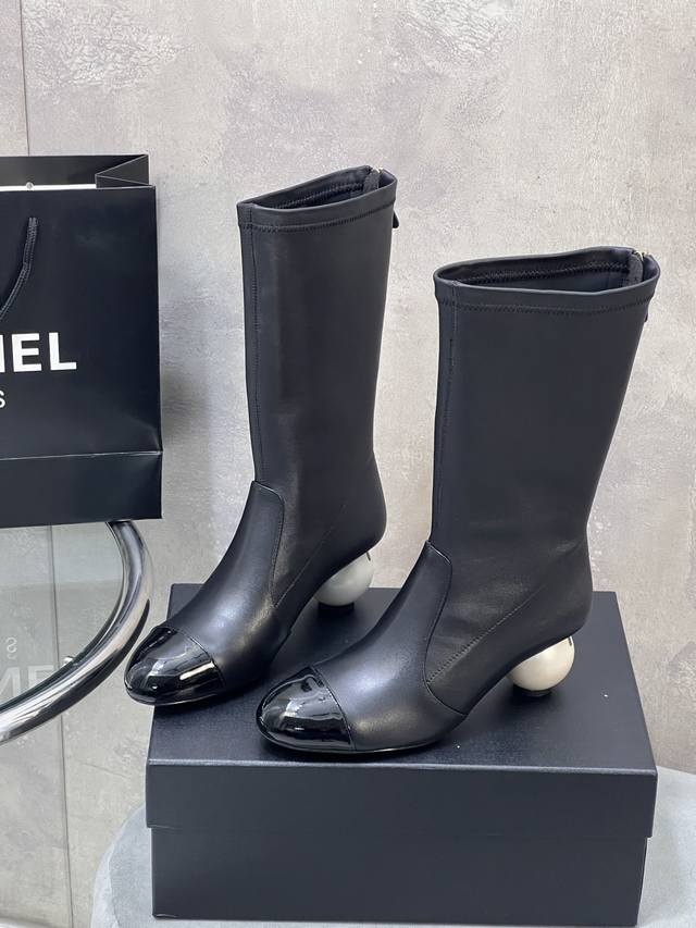 出厂 Chanel 小香秋冬新款大珍珠弹力靴中筒靴女 精彩亮点 巨型珍珠 定制羊皮 羊猄+漆皮 羊皮内里 垫脚 原版开模珍珠 真皮大底 跟高:5.5Cm Siz