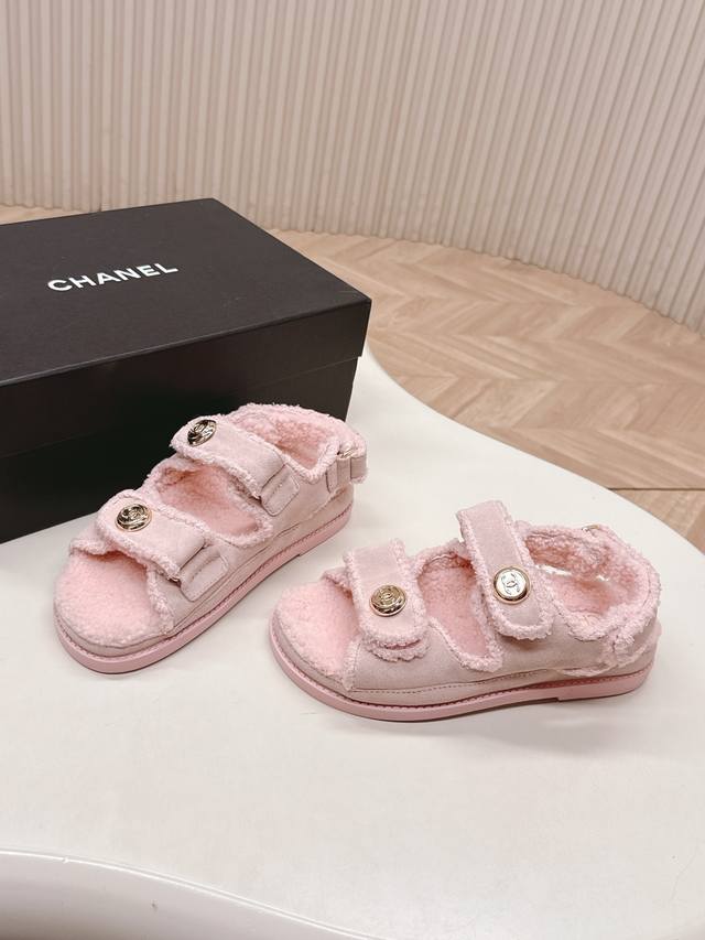 出 Chanel 香奈儿秋冬新款毛毛凉鞋 魔术贴凉鞋 超赞 随意 百搭 高级感满满 绒面 羊毛里 真皮大底 35-40码 DDD