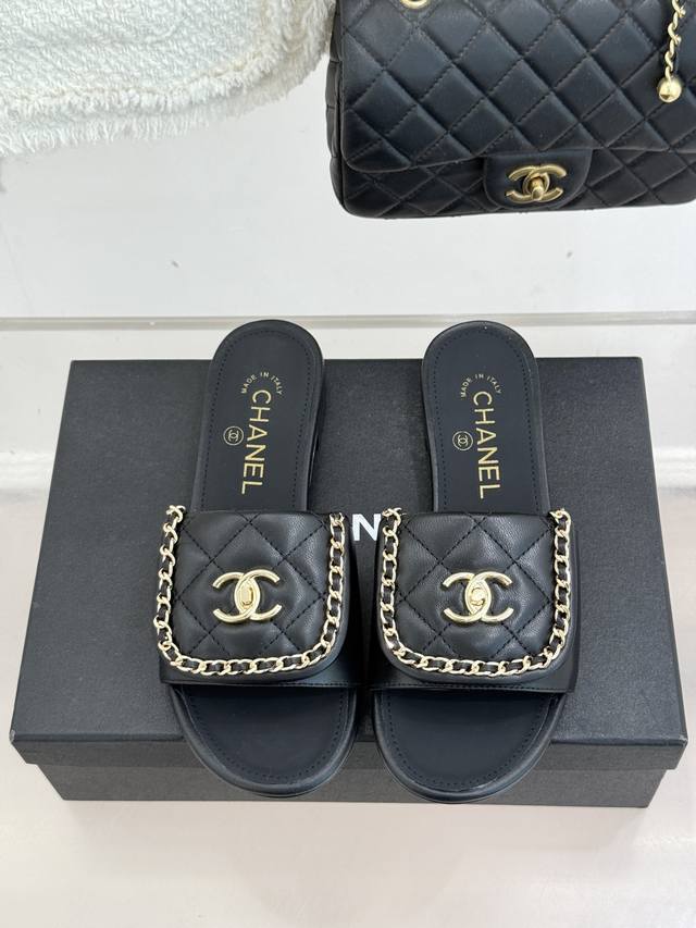 FFF 厂价 DDD Chane*|小香经典春夏翻盖 DDD 双C书包扣拖鞋 DDD 经典永不过时 简约大气 DDD 标志性翻盖双C书包扣搭配链条设计~ DDD 显瘦百搭~脚感非常舒适! DDD 凸显优雅的爆品 小香粉必入! DDD 鞋面采用原版定制材质 DDD 内里垫脚均为羊皮材质 DDD 意大利进口真皮大底 DDD Size:35-39 40 41定制 DDD