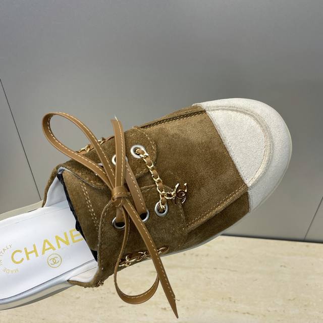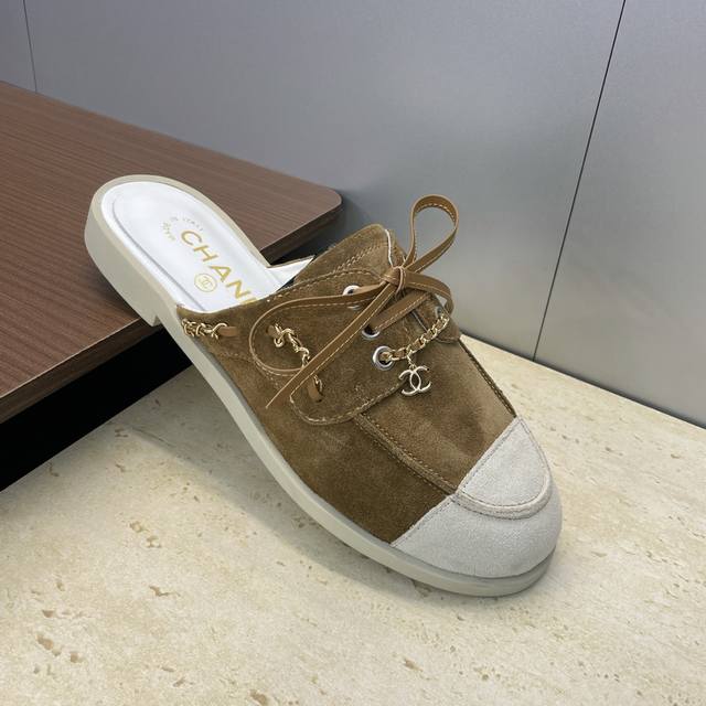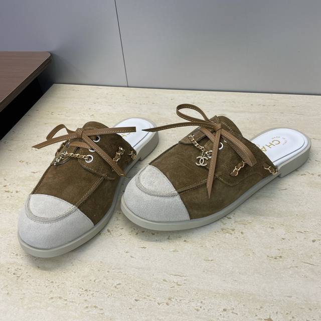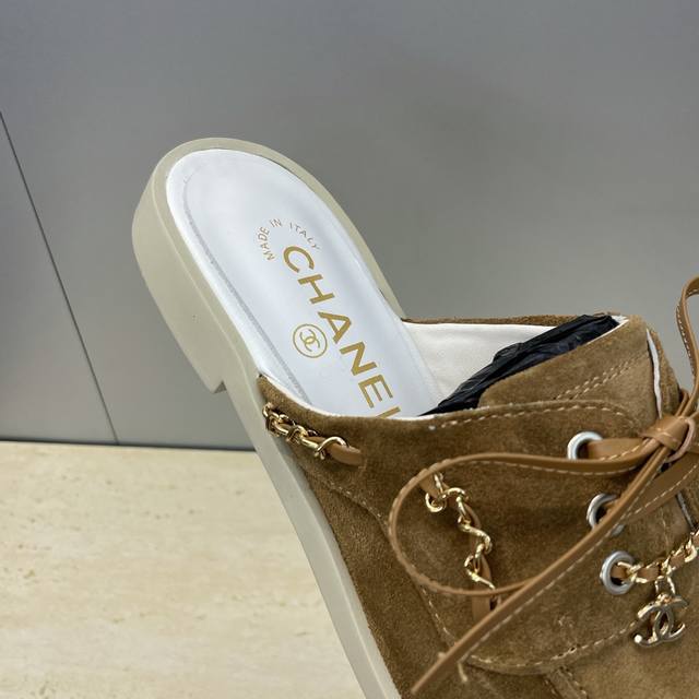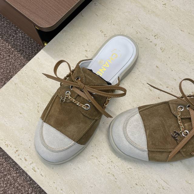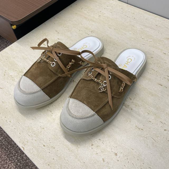 / 工厂p价p Chanel 香奈儿 2025早秋走秀新款朋克风格平底系带女鞋 小香字母Logo五金链条扣圆头拼色穆勒凉拖鞋 材质:鞋面进口小牛皮 进口羊猄皮+混种