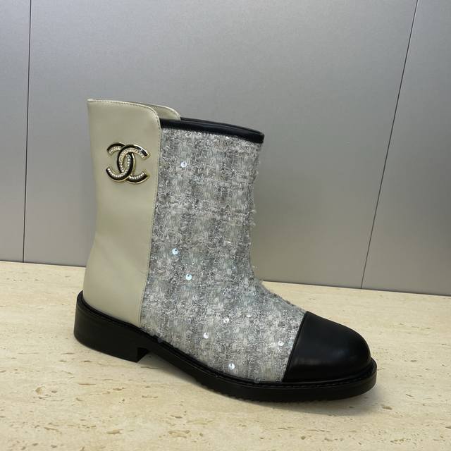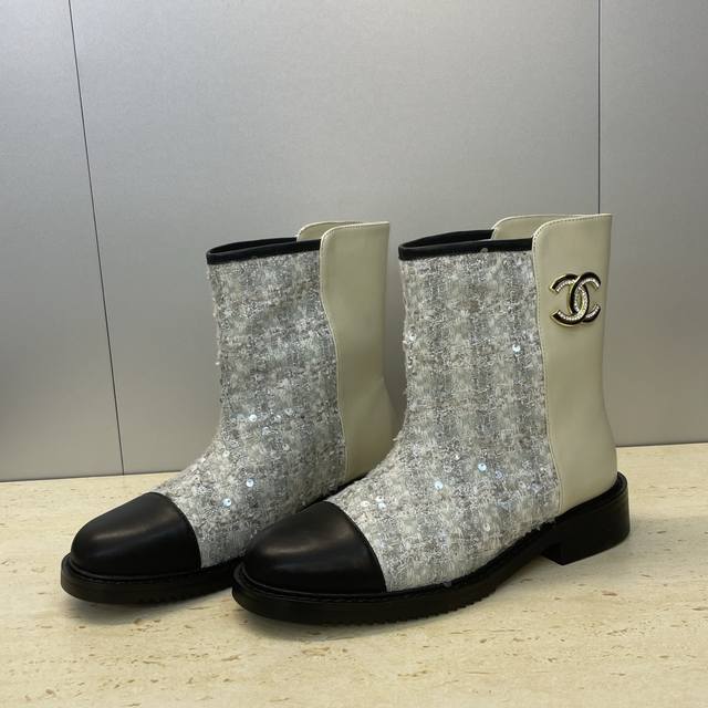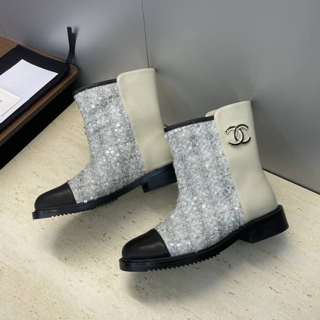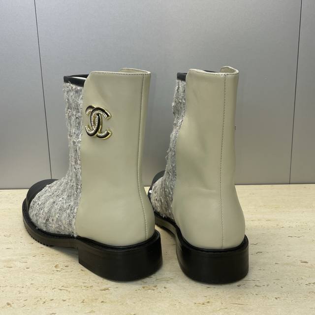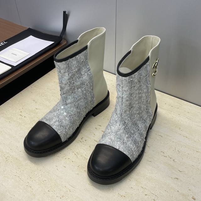 工厂p价p Chanel 香奈儿 2025秋冬新款及裸拼色女短靴 小香字母Logo水钻五金扣圆头低跟拼色机车骑士靴 材质:鞋面进口小牛皮 进口环保透气毛呢料+水
