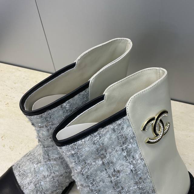 / 工厂p价p Chanel 香奈儿 2025秋冬新款及裸拼色女短靴 小香字母Logo水钻五金扣圆头低跟拼色机车骑士靴 材质:鞋面进口小牛皮 进口环保透气毛呢料+水