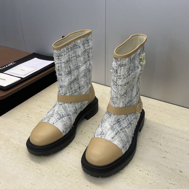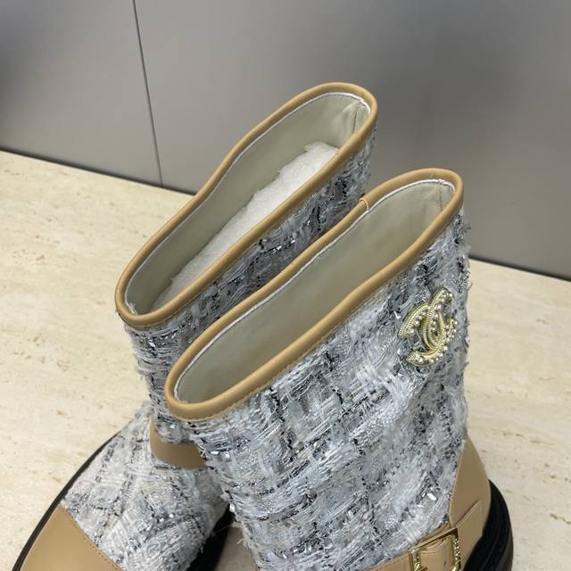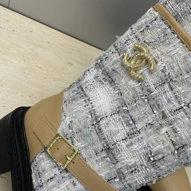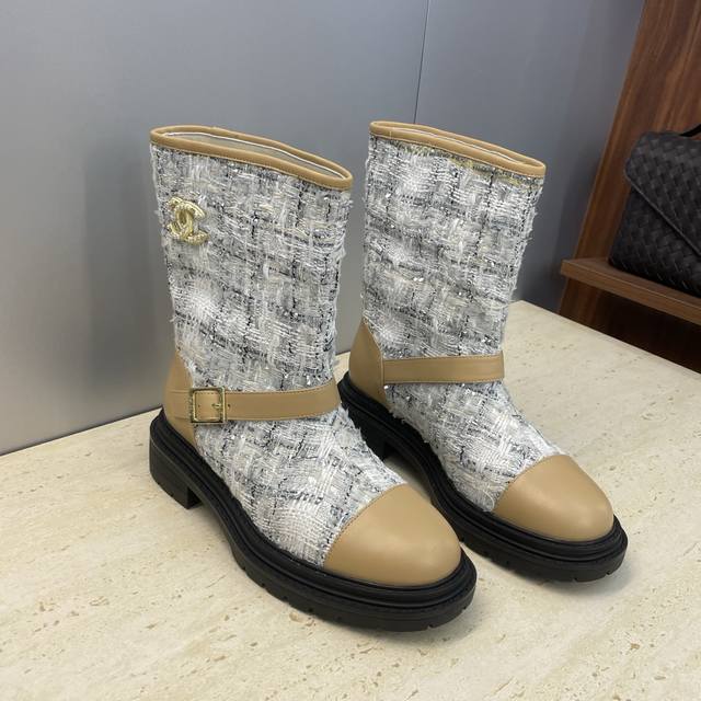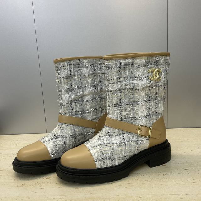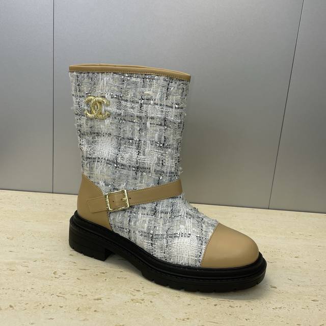 工厂p价p Chanel 香奈儿 2025秋冬新款及裸拼色女短靴 小香字母Logo水钻五金皮带扣圆头低跟拼色机车骑士靴 材质:鞋面进口小牛皮 进口环保透气毛呢料
