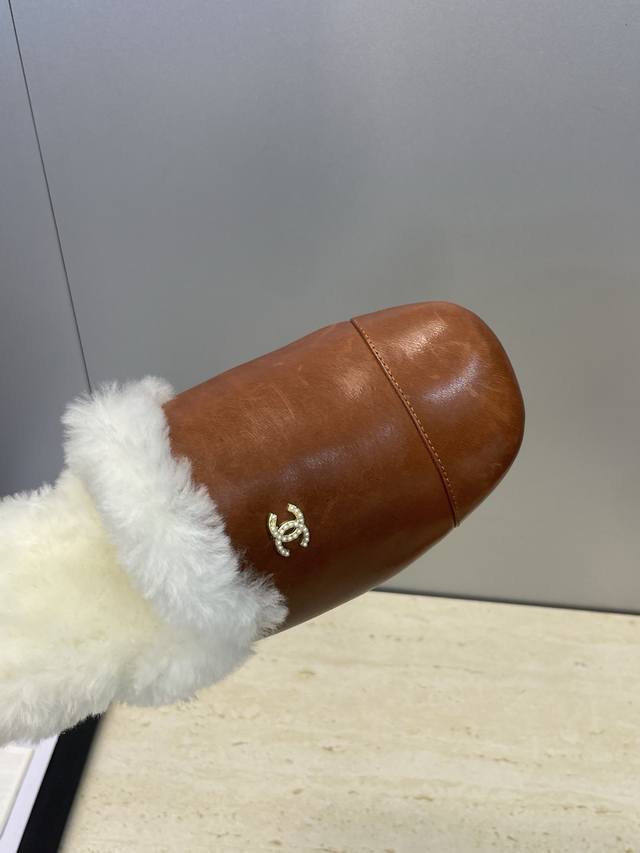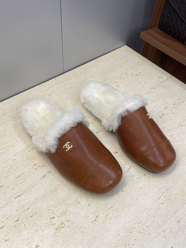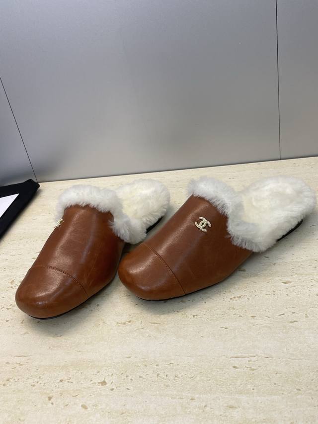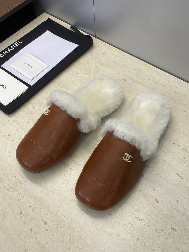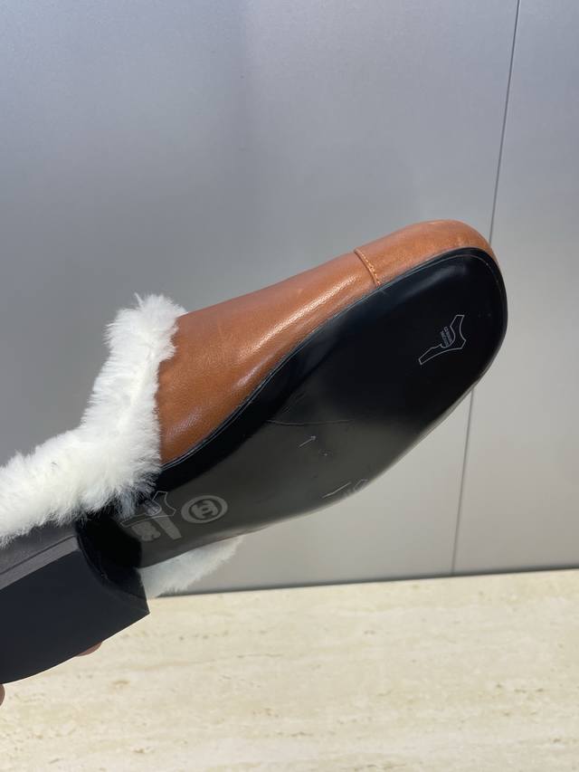 工厂p价p Chanel 香奈儿 2025秋冬新款时尚羊羔毛穆勒女鞋 小香字母Logo五金扣平底圆头拼色防寒保暖女拖鞋 材质:鞋面进口小牛皮+进口羊羔毛内里+意