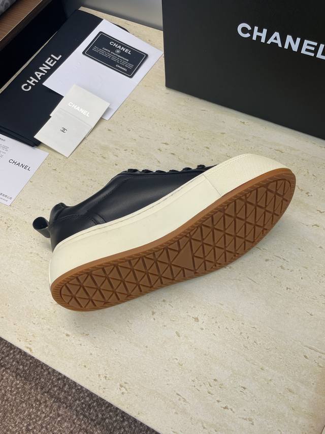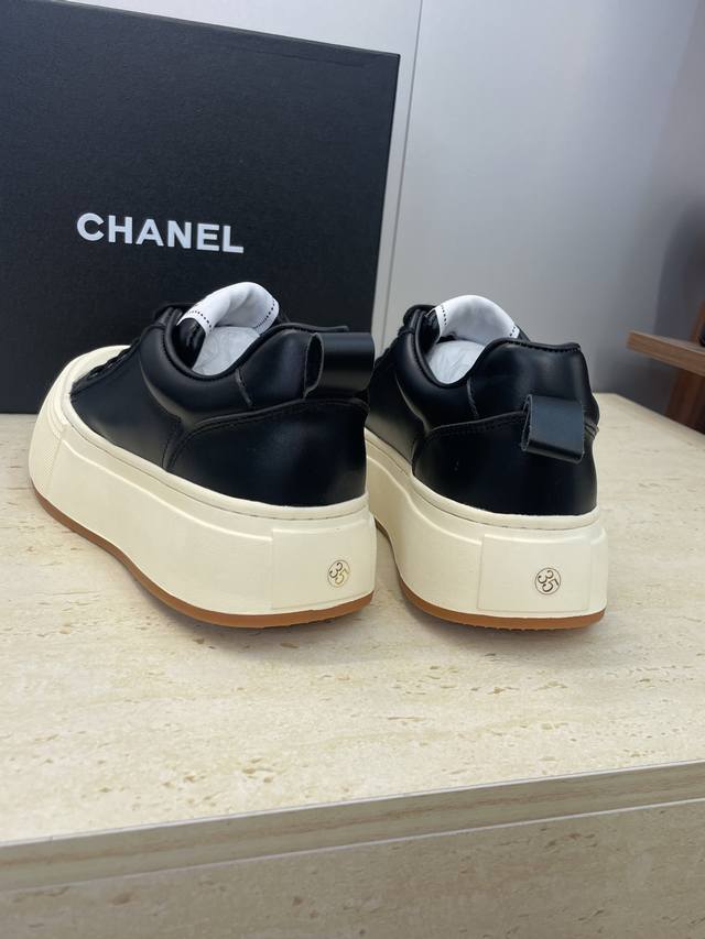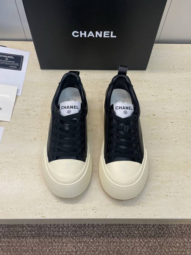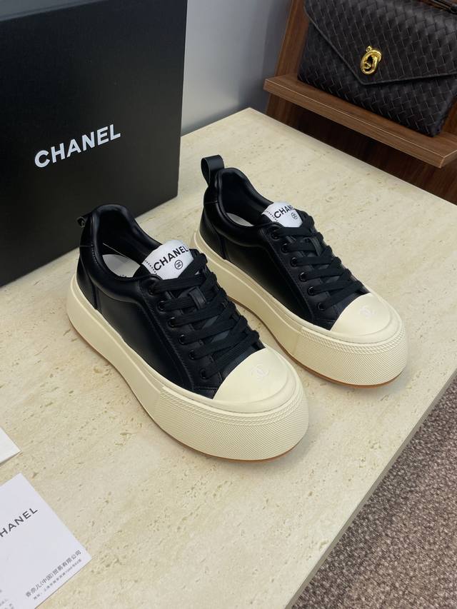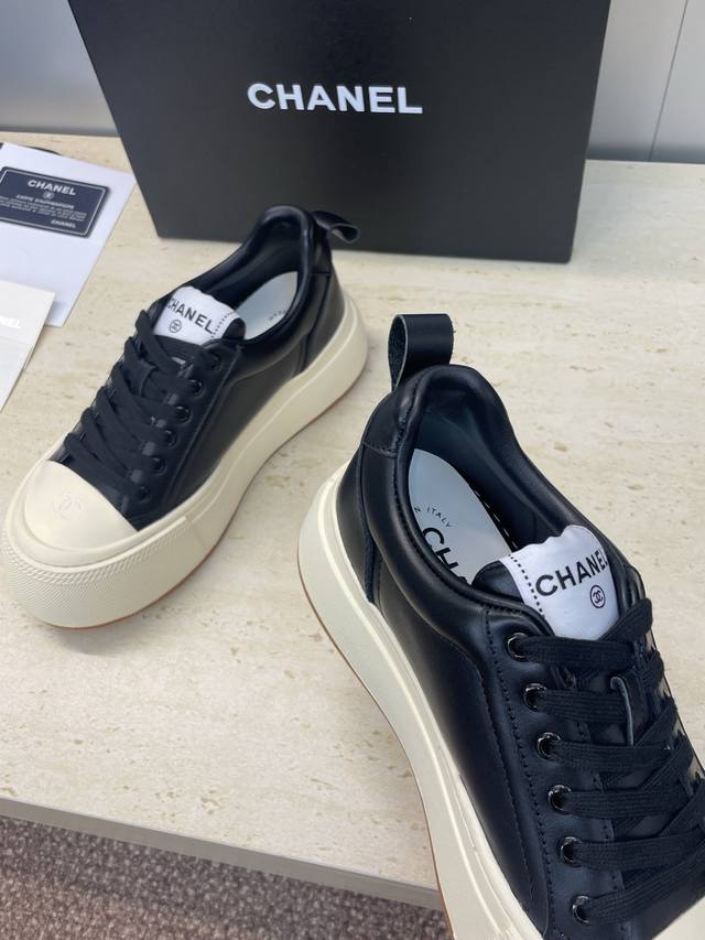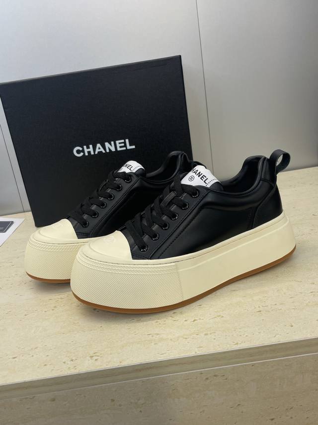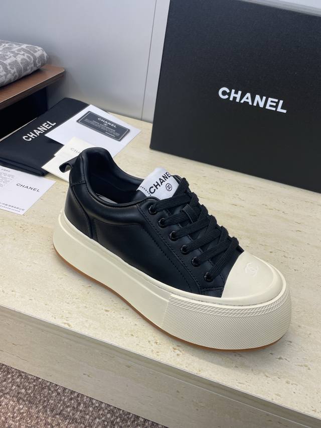 工厂p价p Chanel 香奈儿2025秋冬新款系带休闲小白鞋 小香字母Logo厚底圆头拼色运动滑板女鞋 材质:鞋面进口小牛皮+水染羊皮里+原版开模大底 底厚: