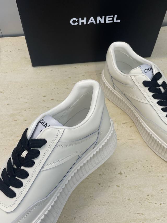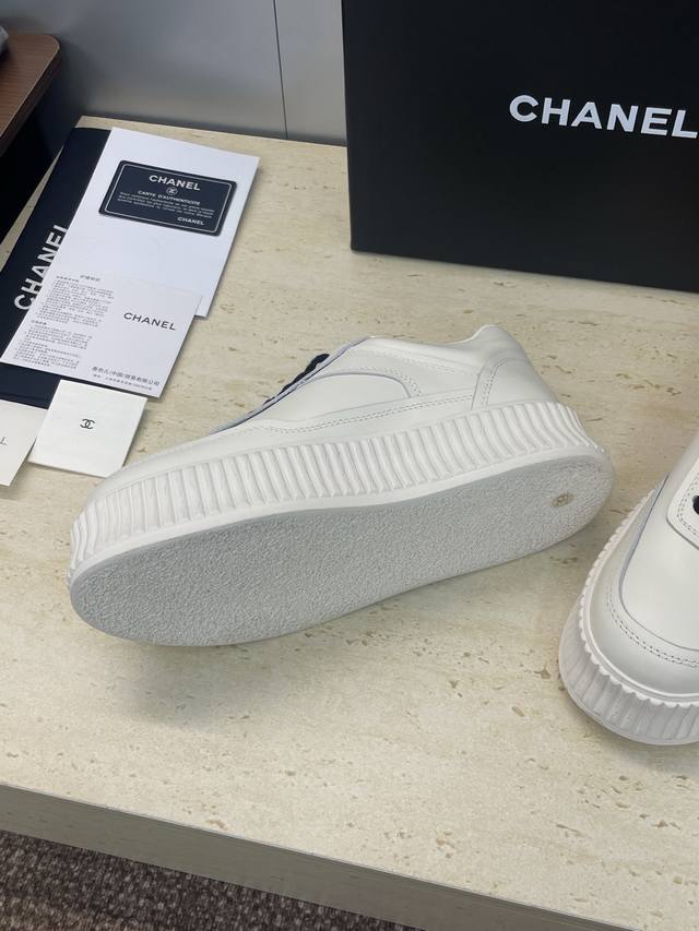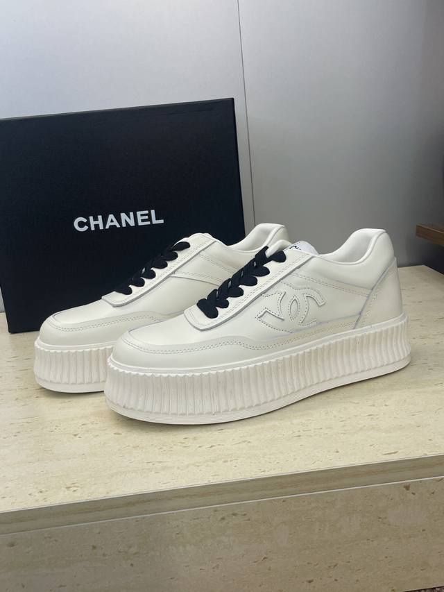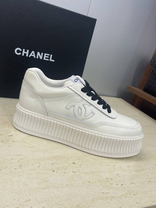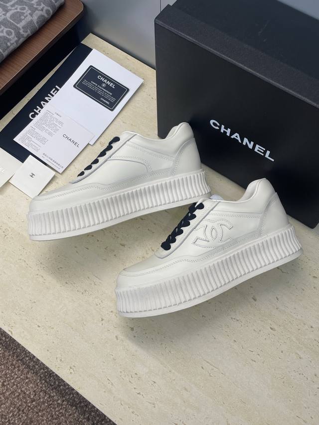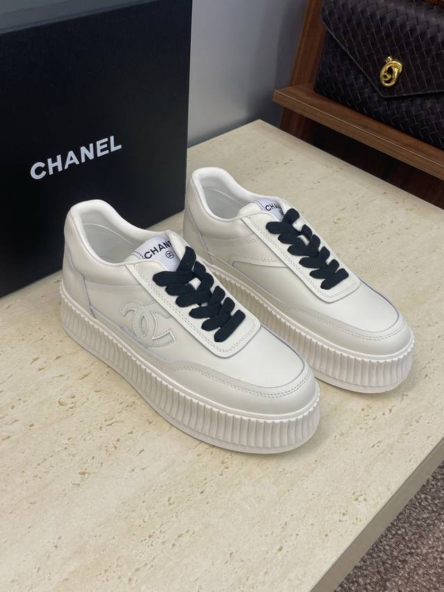 工厂p价p Chanel 香奈儿2025秋冬新款系带休闲松糕小白鞋 小香字母Logo厚底圆头拼色滑板运动女鞋 材质:鞋面进口小牛皮+水染羊皮内里+原版开模大底