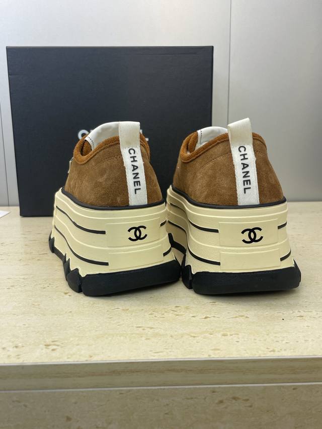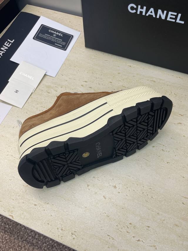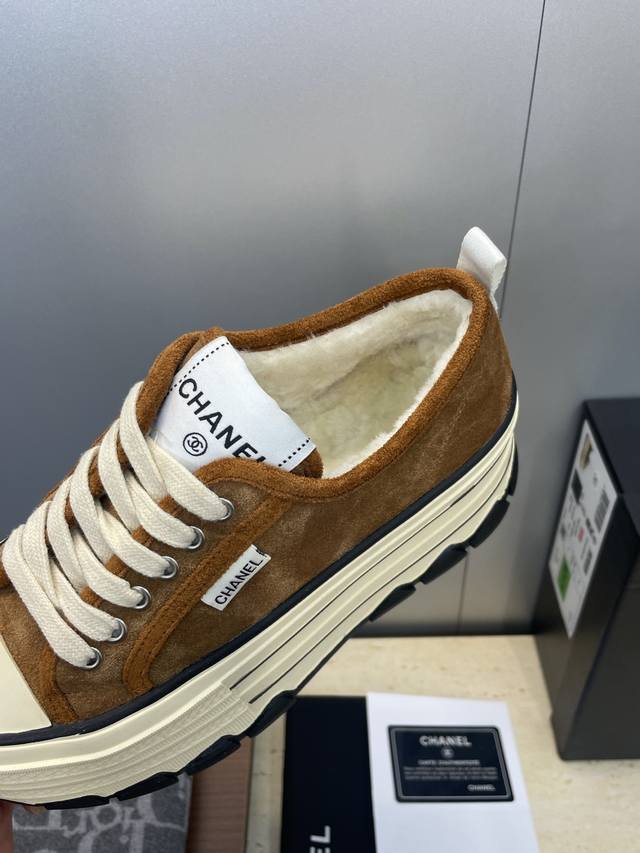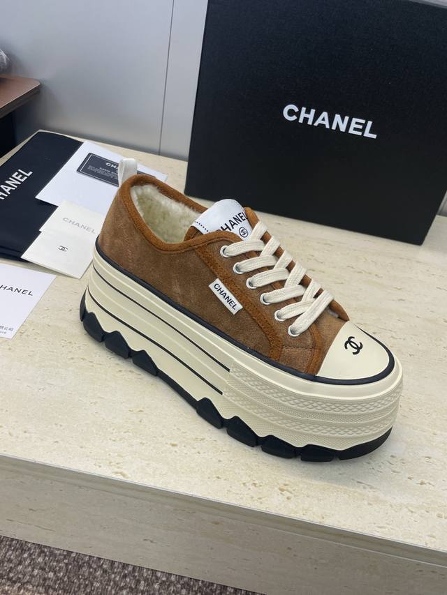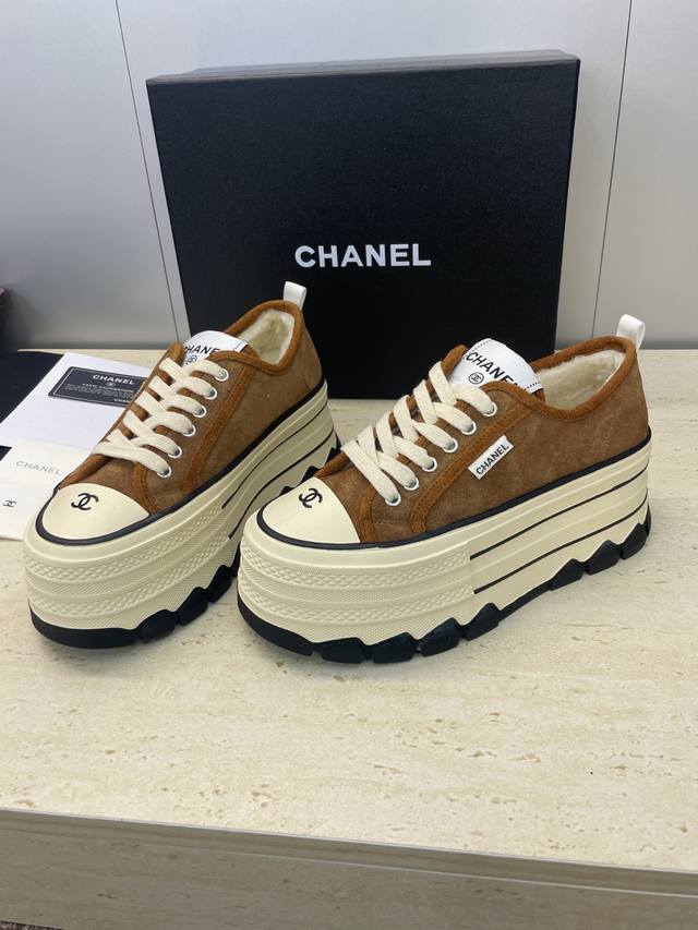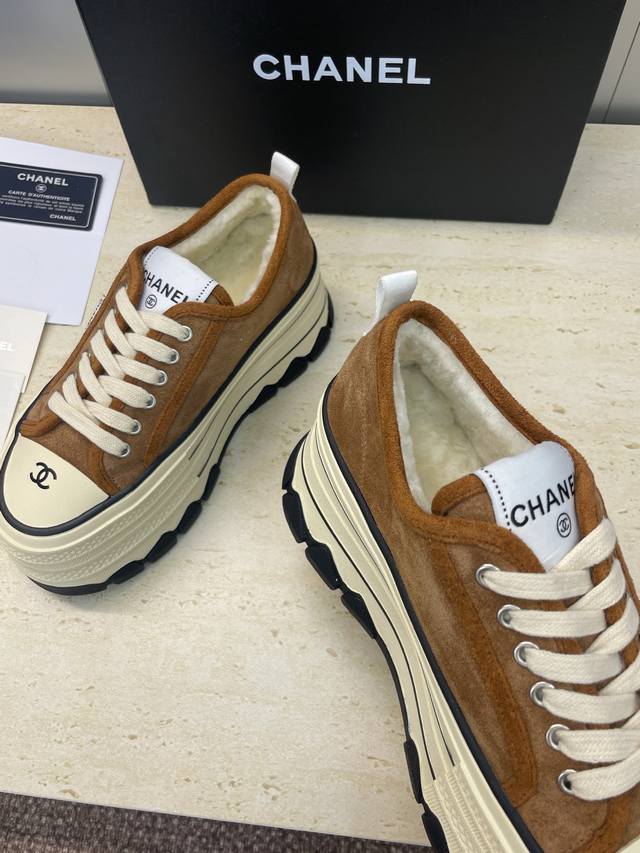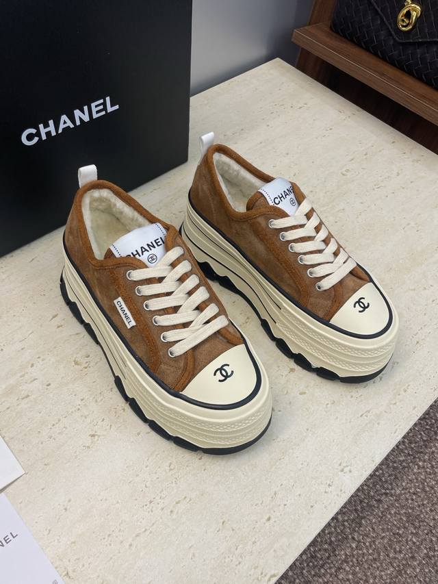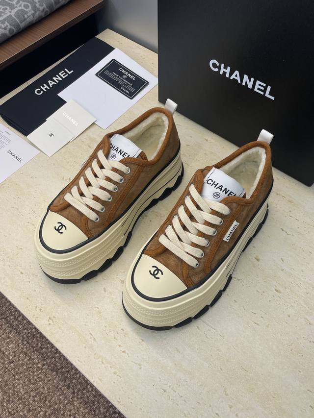 工厂p价p DDD Chanel 香奈儿2025秋冬新款系带休闲鞋 小香字母Logo厚底圆头拼色运动滑板防寒羊羔毛女鞋 DDD 材质:鞋面进口牛漆皮 进口羊猄皮+进口羊羔毛内里+原版开模大底 DDD 底厚:6Cm DDD Size:女码35-41 40.41定制不退换 DDD