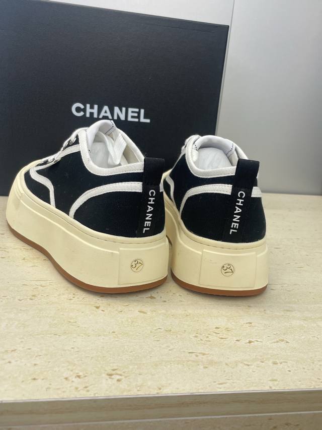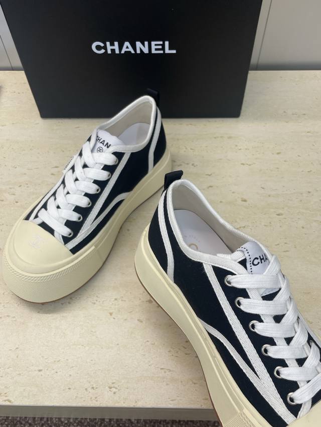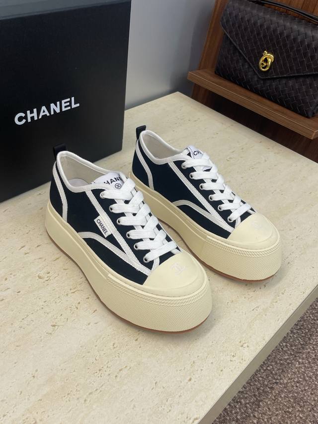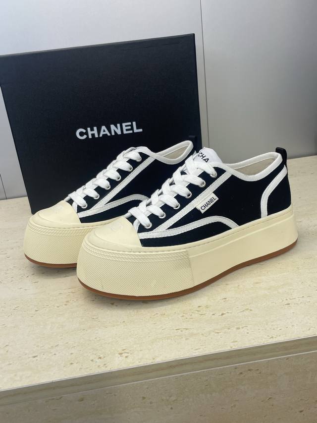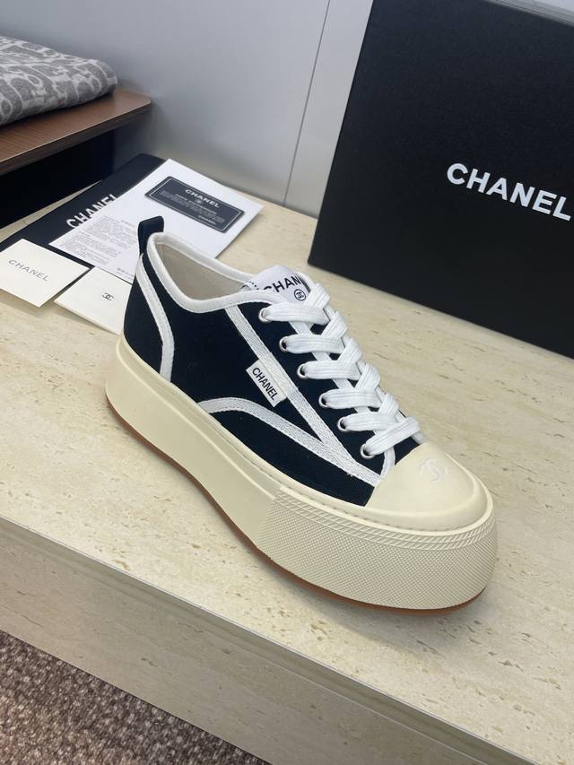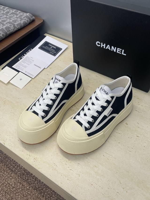 工厂p价p DDD Chanel 香奈儿2025秋冬新款系带帆布休闲鞋 小香字母Logo厚底圆头拼色运动滑板女鞋 DDD 材质:鞋面进口环保帆布+水染羊皮内里+原版开模大底 DDD 底厚:4Cm DDD Size:女码35-41 40.41定制不退换 DDD