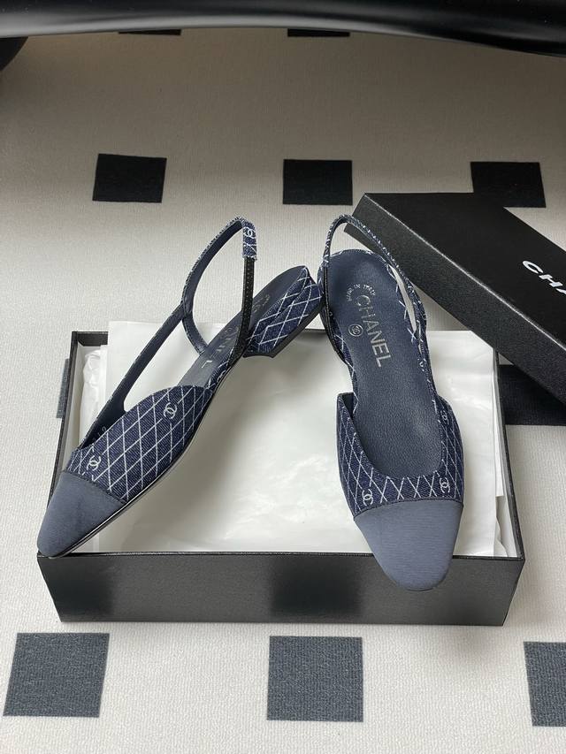 25p早春新款Chanel小香绝美牛仔布后空Sling-Back凉鞋平底 粗跟