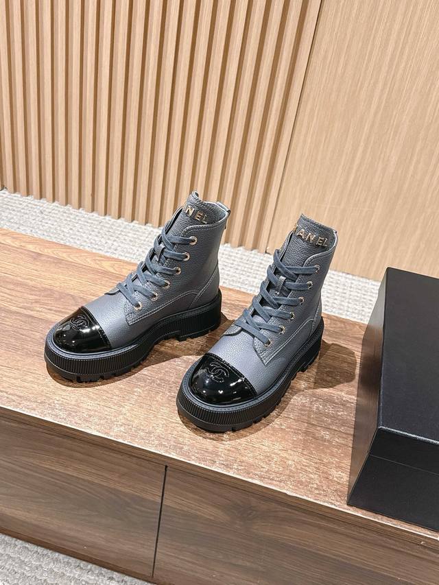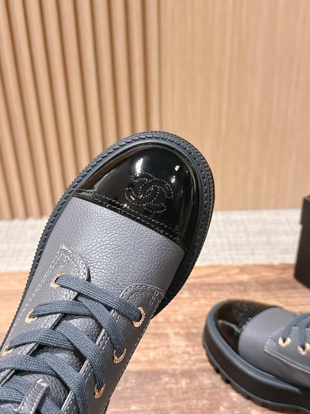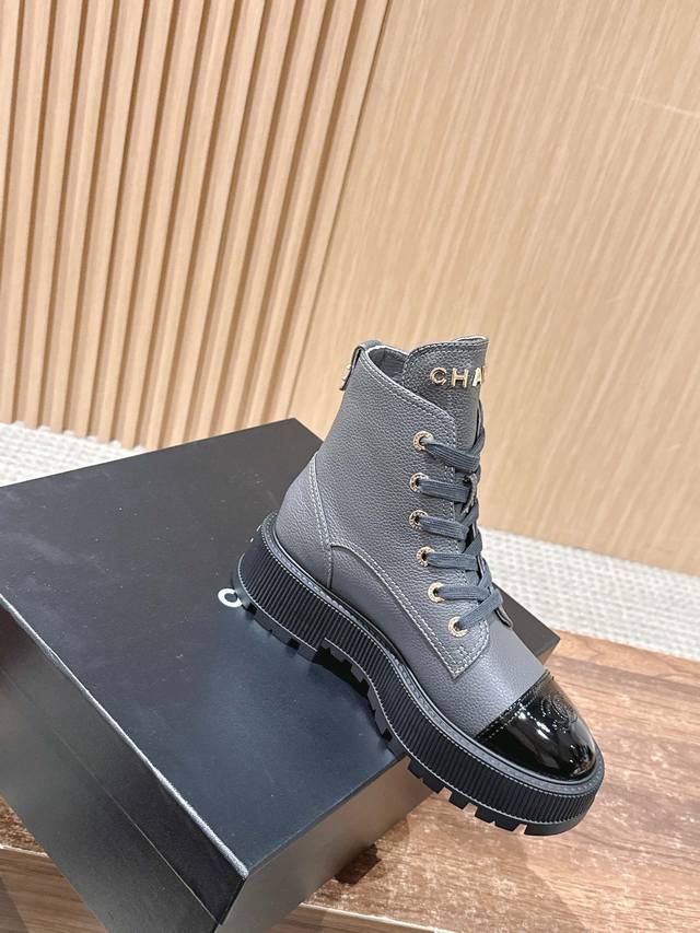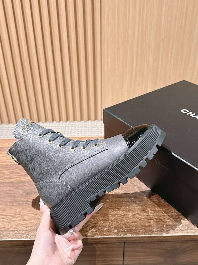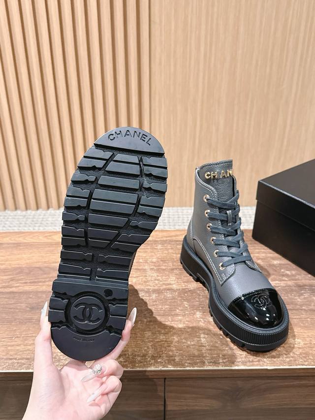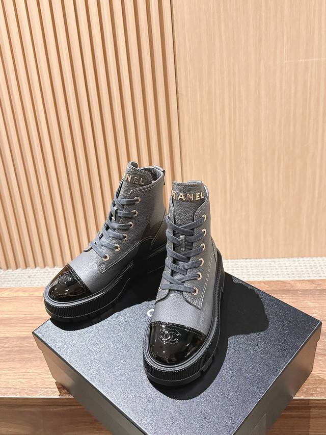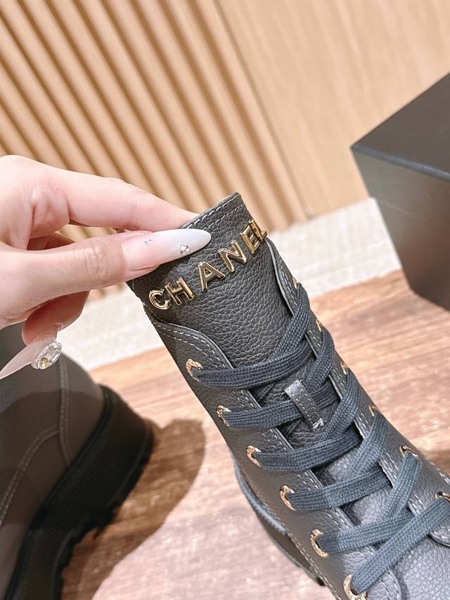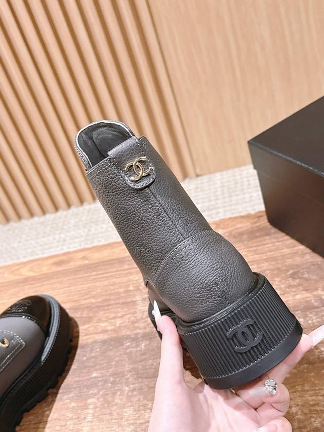 皮面 香奈儿厚底短靴 超显腿长,超级推荐 鞋舌Chanel金属字母,鞋头双C刺绣 鞋面定制原版一致 摔纹牛皮 内里定制进口混种小羊皮 请区别市场上便宜的羊皮喔