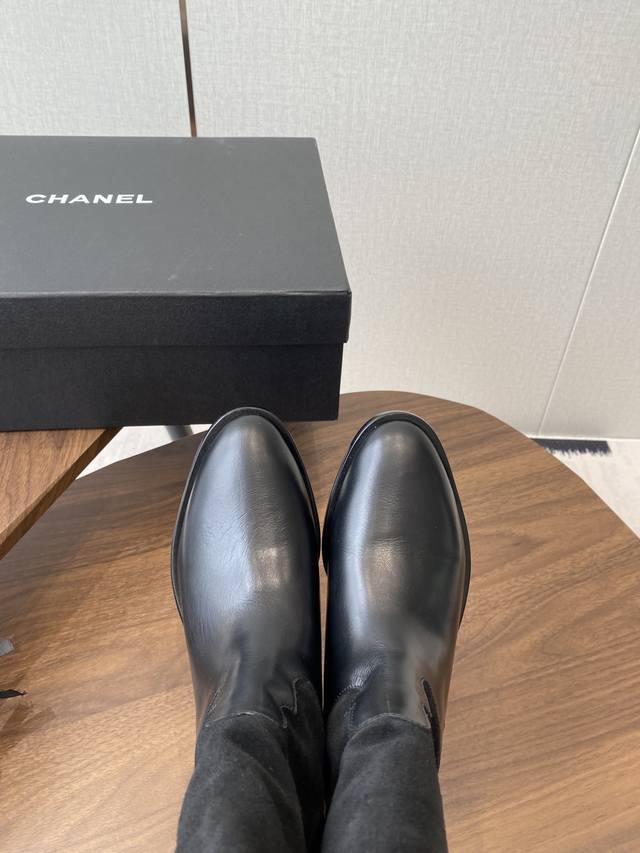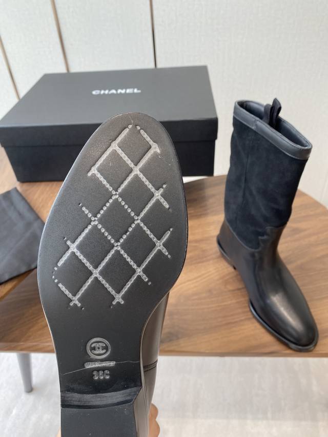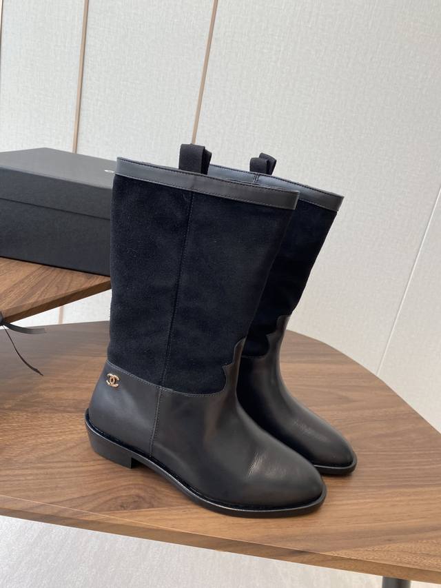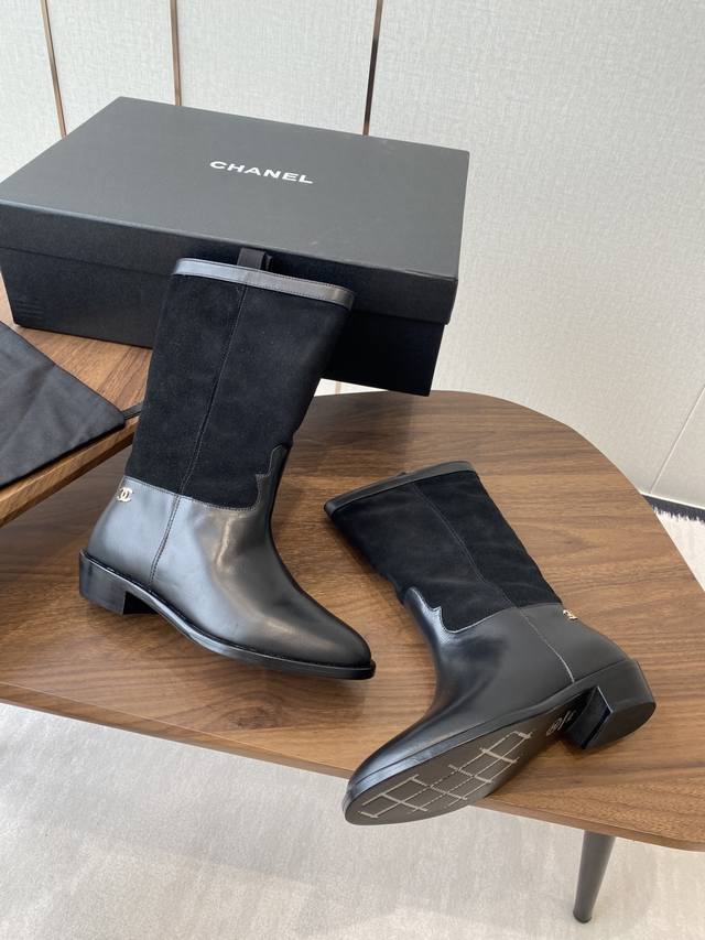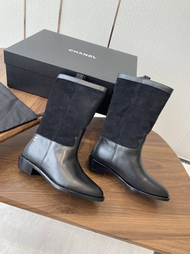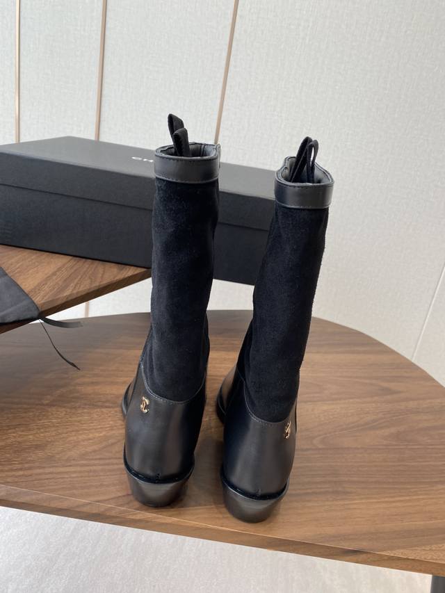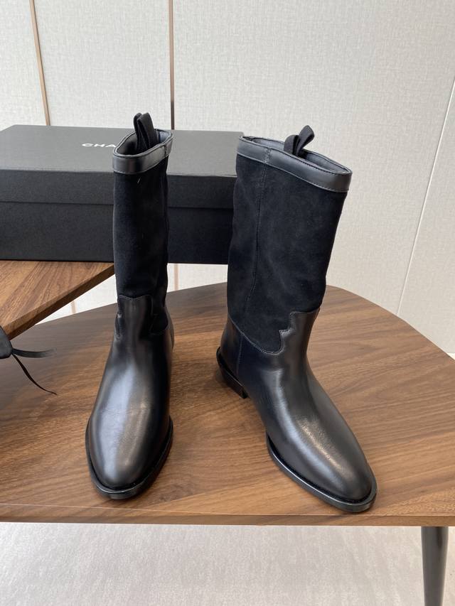 Chanel 香奈儿25秋冬小香麂皮拼色一脚蹬骑士中靴高靴!复古风靴子西部牛仔靴!