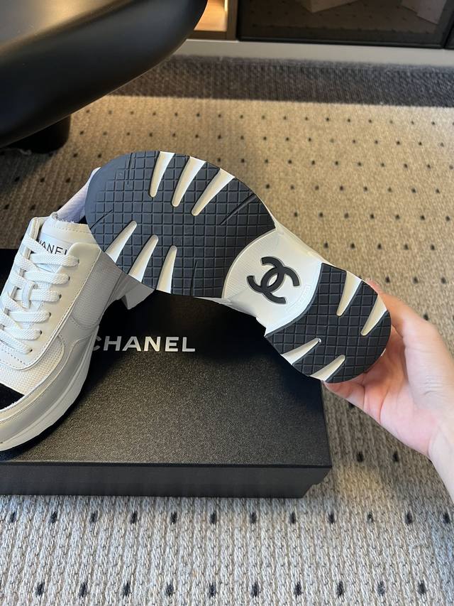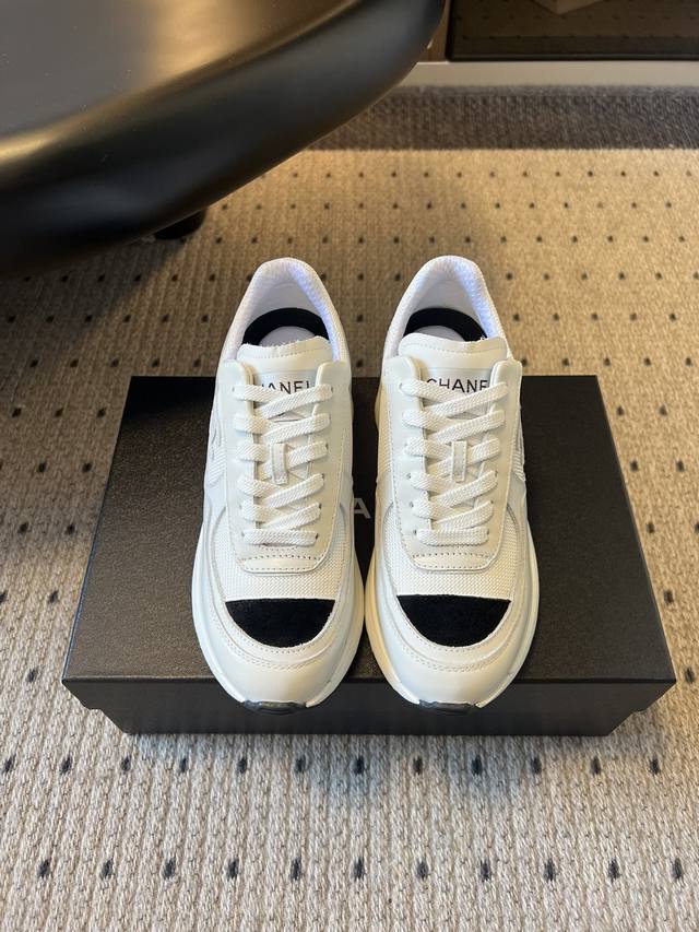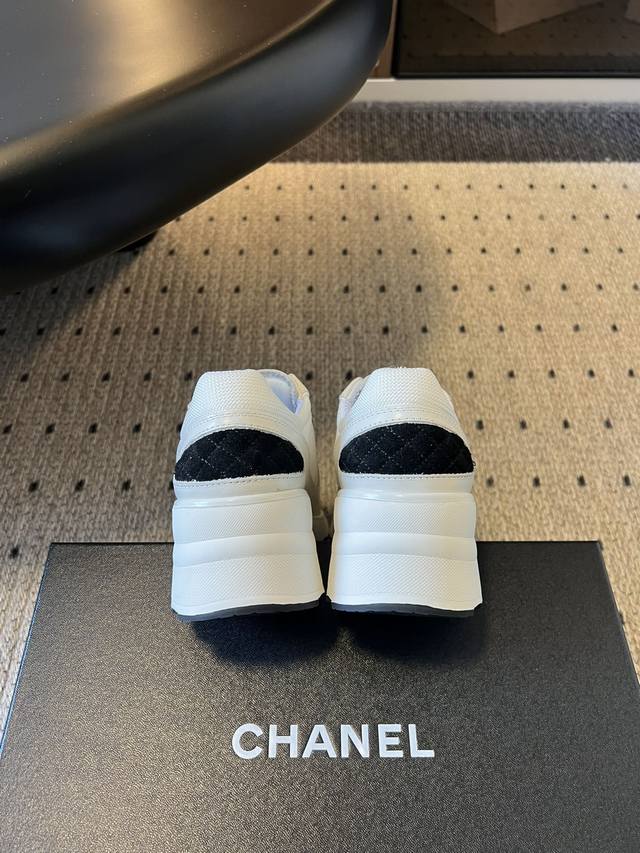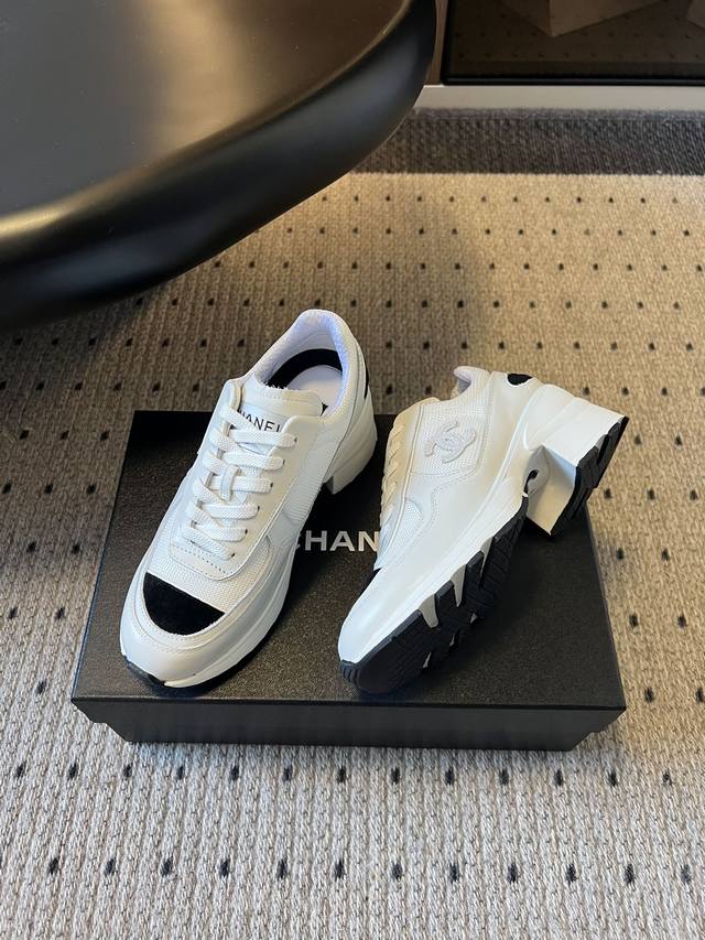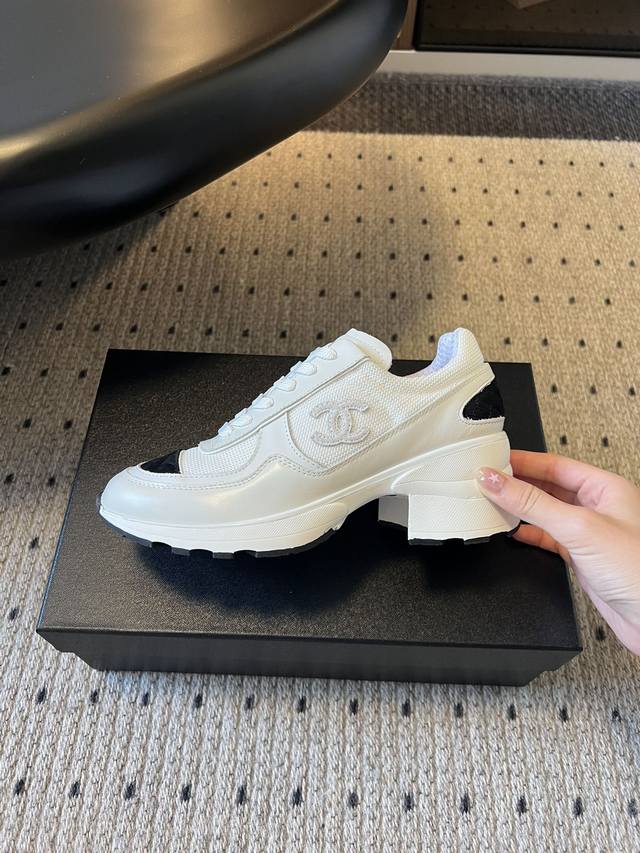 顶级品质 Chane* 25Ss 香奈儿高跟运动鞋 采用皮革与网面拼接的材质,兼具质感与透气性。鞋身带有品牌标志性的双C Logo,辨识度极高,有白色、黑色、粉白拼接三种配色,风格涵盖简约、酷感与甜美。 厚底款式,在提升时尚感的同时,还能起到一定的增高效果;系带设计贴合脚型,穿着舒适且便于调节松紧。融合了运动风与奢华感,既适合日常休闲,又能为造型增添高级感。 鞋面:牛皮 网布 内里:羊皮 棉网 大底:Tpu大底 Size:35~40 40定制不退换