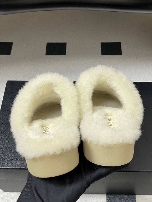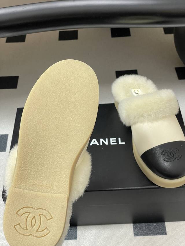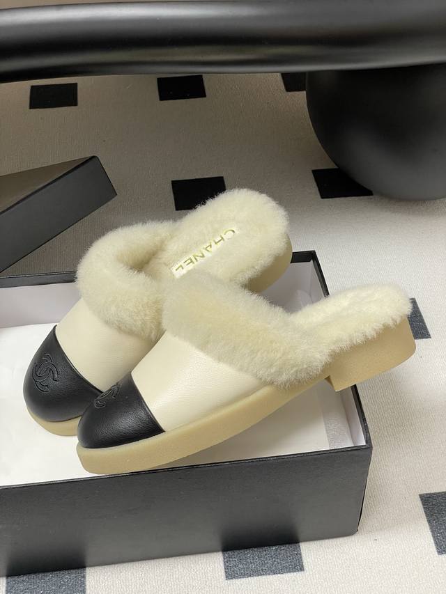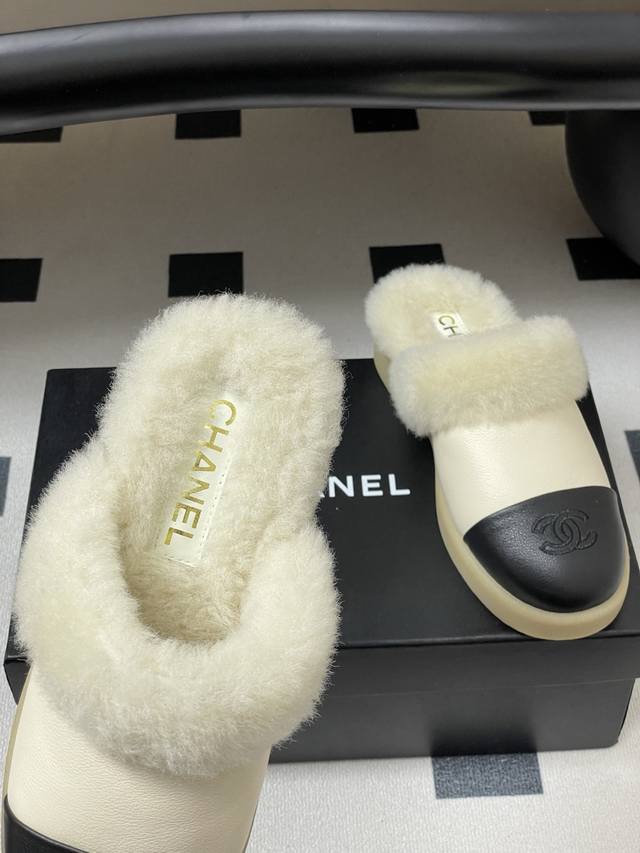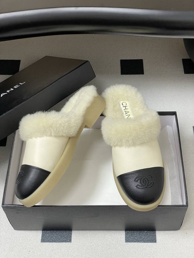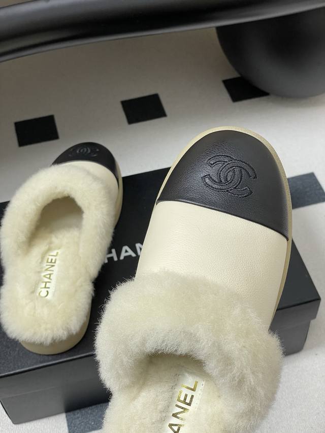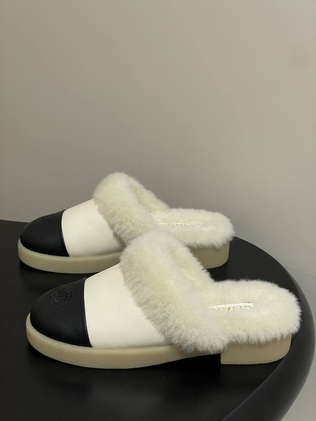 顶级品质 Chanel香奈儿 小香25K秋冬新款麂皮绒面羊毛包头穆勒拖鞋 鞋面采用牛反绒 牛皮革材质,质感细腻高级; 鞋口环绕厚实毛绒,紧密锁温,秋冬季节能为脚