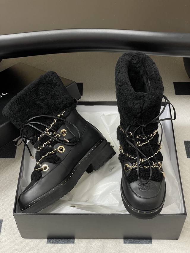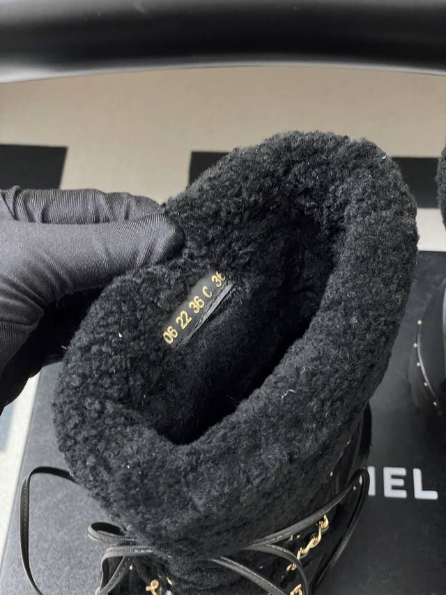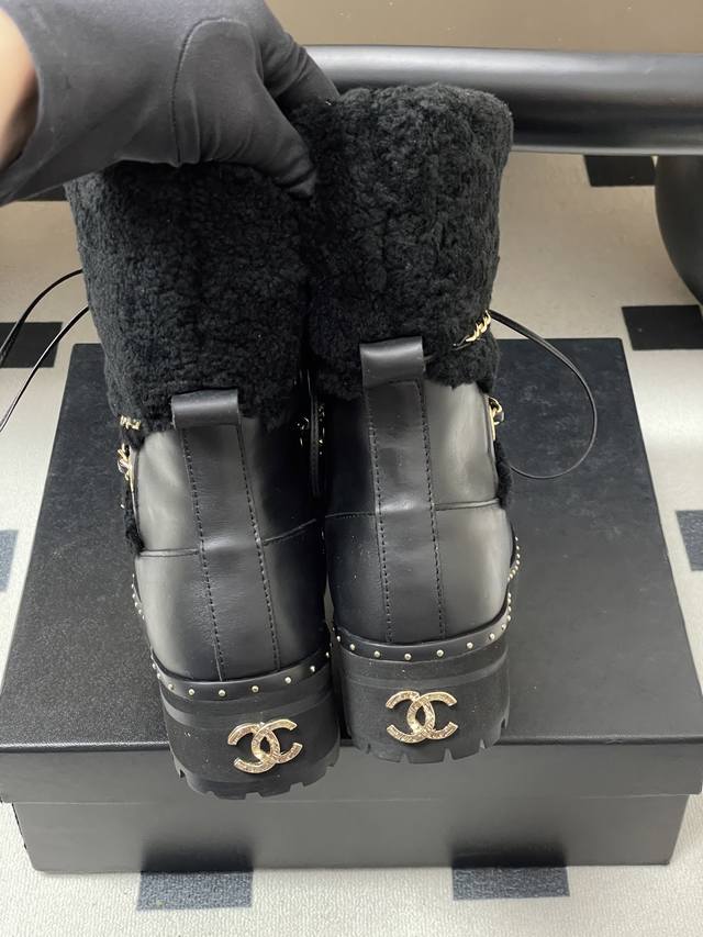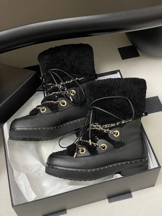 顶级品质 DDD Chanel香奈儿 秋冬经典款 小香链条羊羔毛短靴短筒厚底雪地靴 DDD 可帅气可温柔的小香靴子 ,链条也是它家的一个很经典的元素 。搭配羊毛靴筒 设计真的绝绝子 ,看起来就是不一般的短靴靴筒笔直有型且不失柔软度 也不挑人,加上精致Logo点缀 高级大气 不俗气。上脚酷酷的特有范儿 还特显腿长哦 DDD 鞋面:定制小牛皮 羊毛 DDD 内里垫脚:羊羔毛 DDD 鞋底:橡胶 Eva 5层组合大底 柳钉沿条点缀 DDD 码数:35-39 40.41定做不退换 DDD