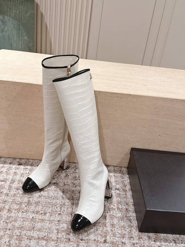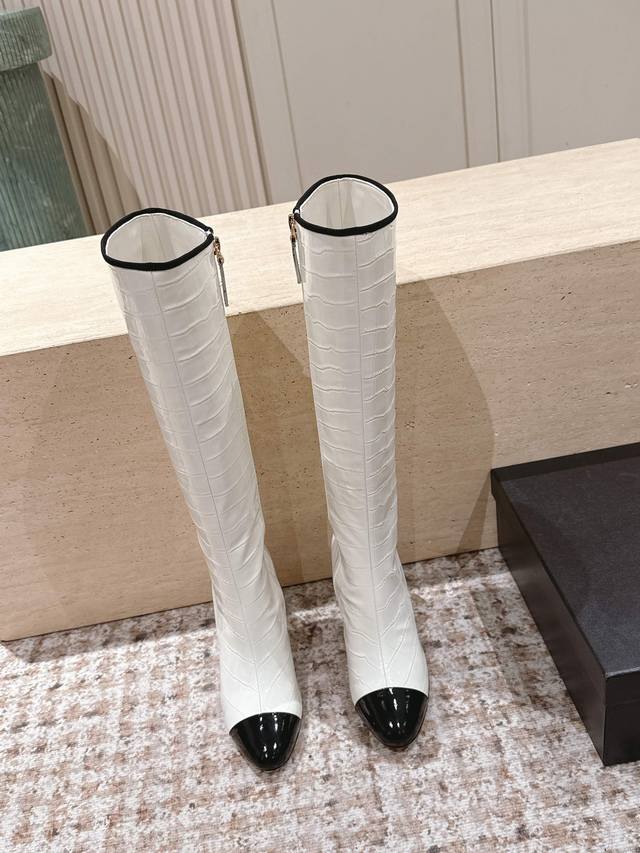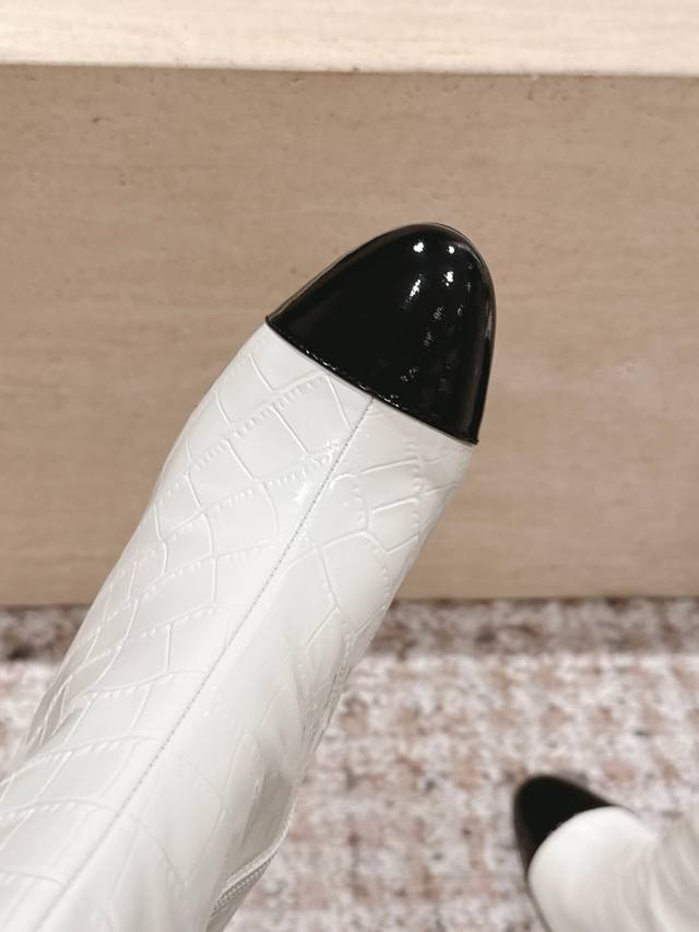 / 顶级版本: :Chanel双色拼接高跟短靴,米白漆皮+黑色拼接,菱格纹+珍珠点缀,优雅又高级计。粗跟设计,舒适又显腿长,秋冬穿搭超加分无论烟管裤还是裙装都能轻松