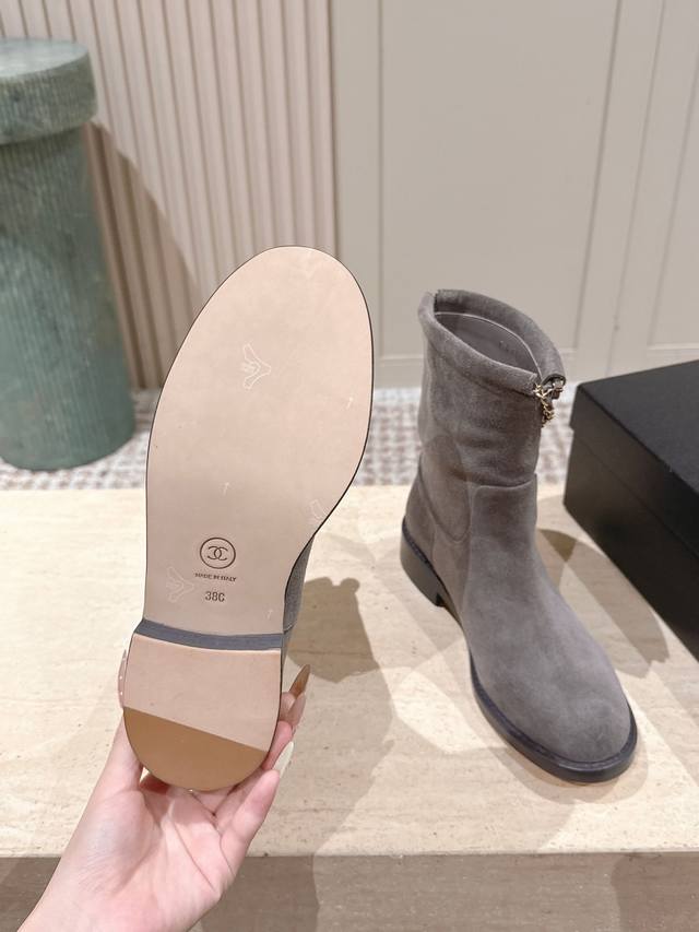 / 顶级版本: Chanel 香奈儿 2025秋冬新款朋克风格链条女短靴 小香字母Logo五金扣圆头低跟机车骑士靴 材质:鞋面进口小牛皮 进口羊猄皮+水染牛皮内里+