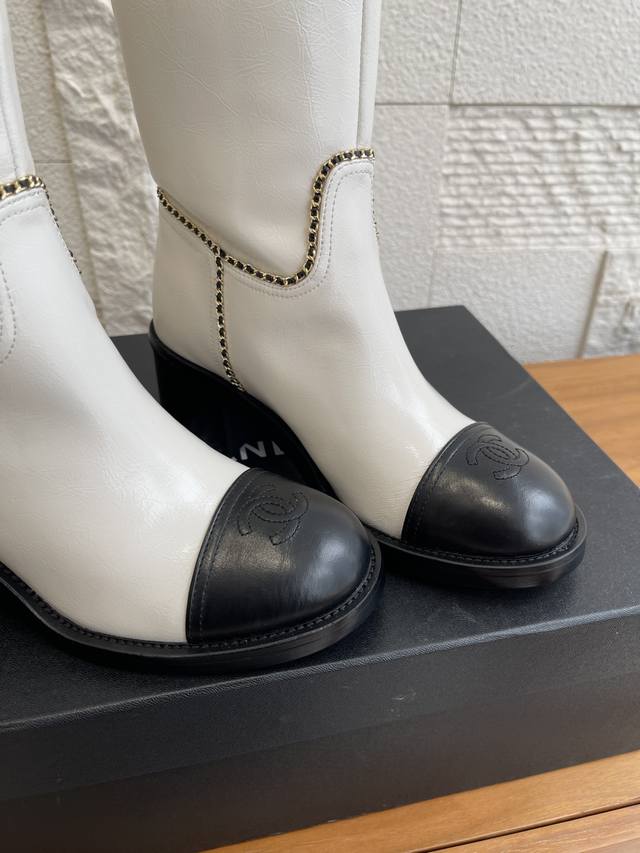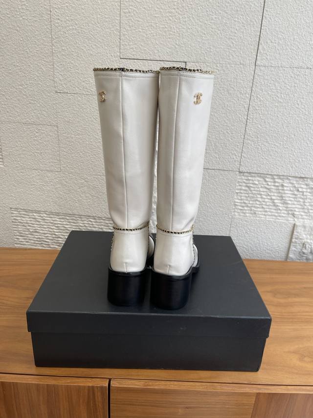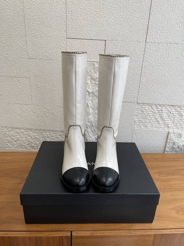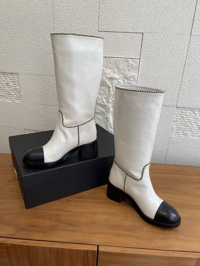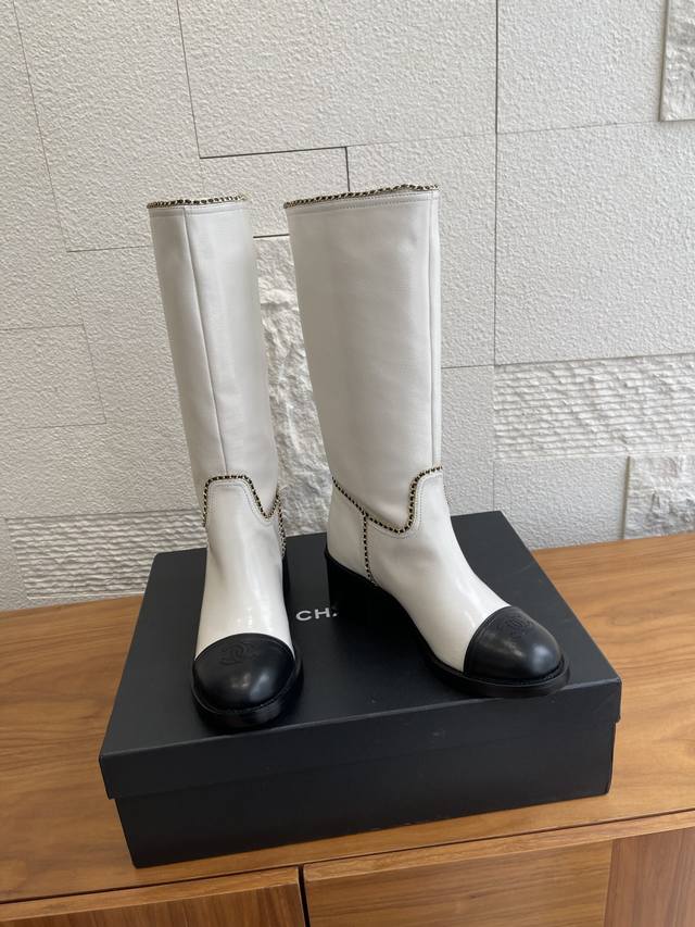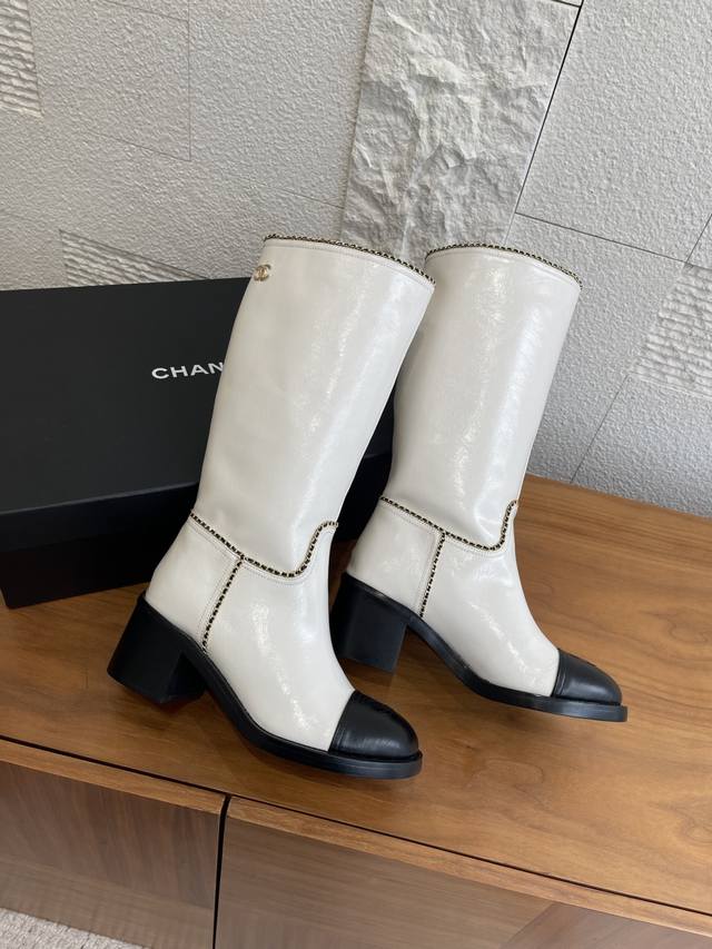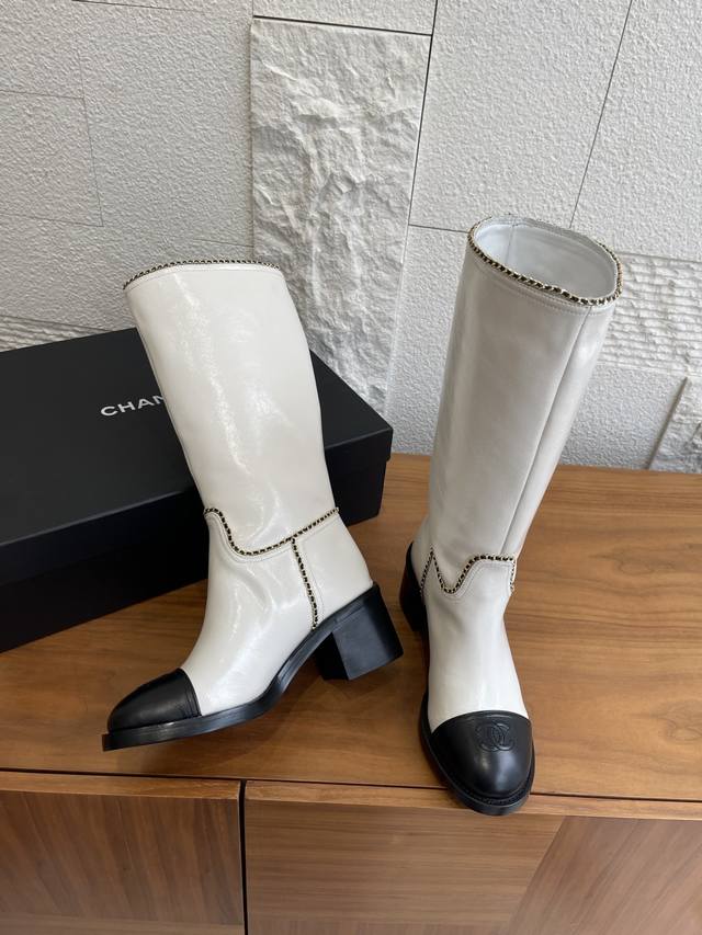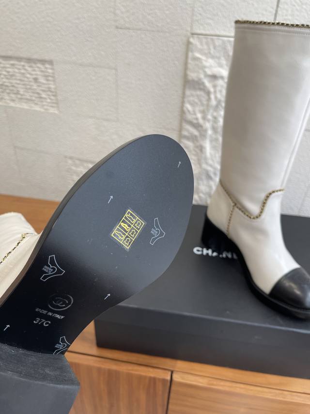 顶级版本: DDD Chanel 香奈儿 2025 秋冬新款 双C标 链条 骑士靴 DDD Chanel香奈儿链条骑士靴,小牛皮+羊皮内里,质感细腻又挺括。金属链条+双C标识,品牌感满满。粗跟设计,舒适又显腿长,后侧拉链方便穿脱。靴筒贴合腿部线条,搭配大衣、直筒裤或针织裙都超有型,秋冬通勤休闲都能驾驭!优雅与酷感兼具,是香奈儿经典美学的时尚宣言人。 DDD 面料:进口小牛皮 DDD 内里:进口羊皮 DDD 大底:意大利进口真皮大底 DDD Size:35-41 40 41定做不退换 DDD