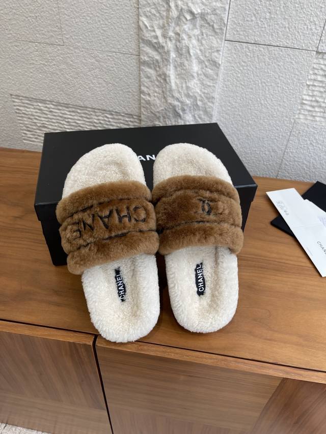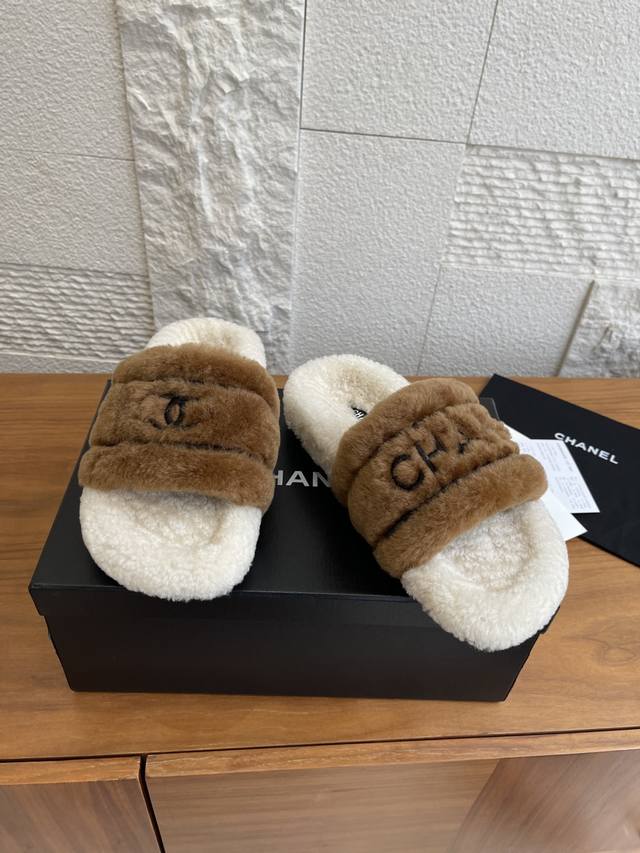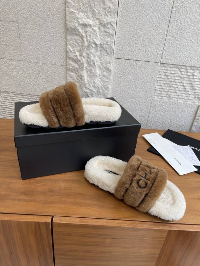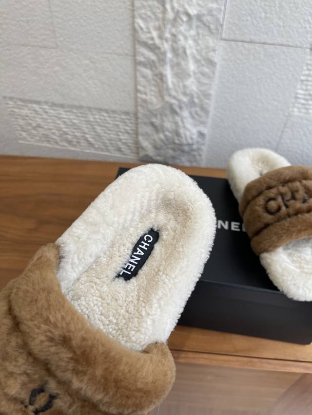 / 顶级版本: Chanel 香奈儿 2025 秋冬新款 双C 毛毛拖鞋 Chanel秋冬新款羊羔毛拖鞋,选用高品质羊毛,柔软又保暖,秋冬穿超舒服!鞋面有经典双Cl