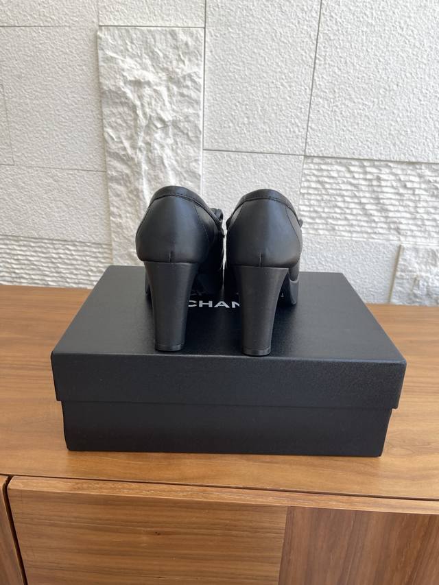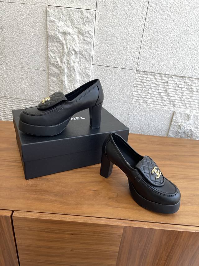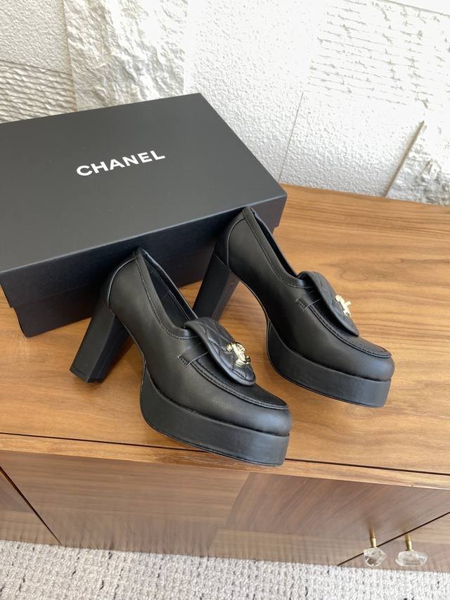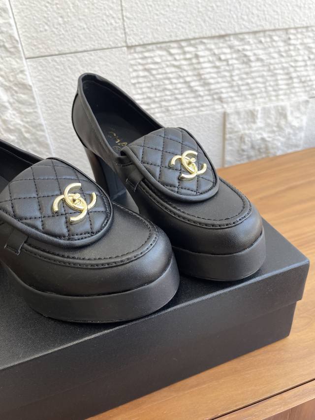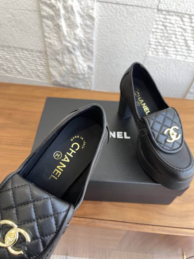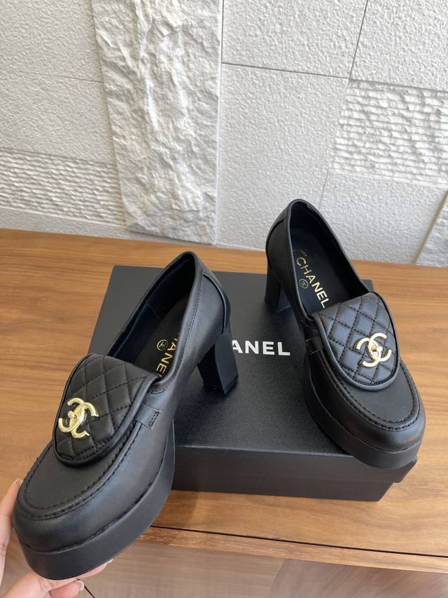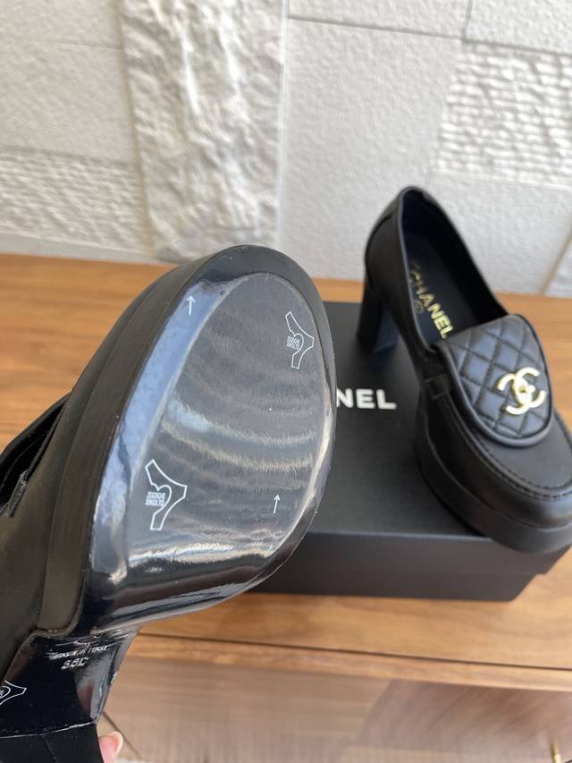顶级版本: Chanel 香奈儿 25B 秋装新品 翻盖 双C扣 防水台 高跟 乐福鞋 单鞋 高跟鞋 Chanel香奈儿这双复古乐福鞋一眼看到就很喜欢,鞋面的菱格设计很特别 点缀小香经典五金扣超有Chanel的格調高級感十足,圆形的高跟配搭防水台组合,上脚特别舒服柔软 脚宽也不怕好看又舒适 搭配中筒袜裙子裤子都是无敌美,看起来款式简约 但上脚马上自带拉长腿效果简单不失个性 又增添一抹帅气感 面料:进口小牛皮 内里 垫脚:进口羊皮 大底:意大利进口真皮大底 跟高:9Cm,防水台3Cm Size:35.-41