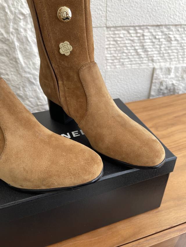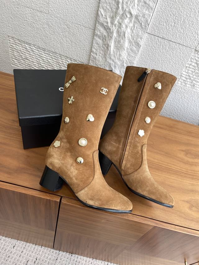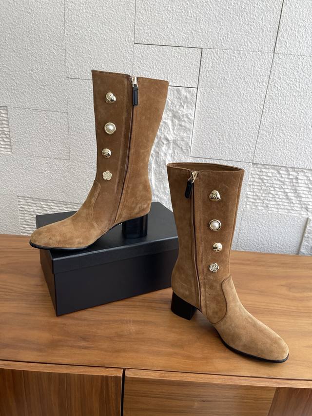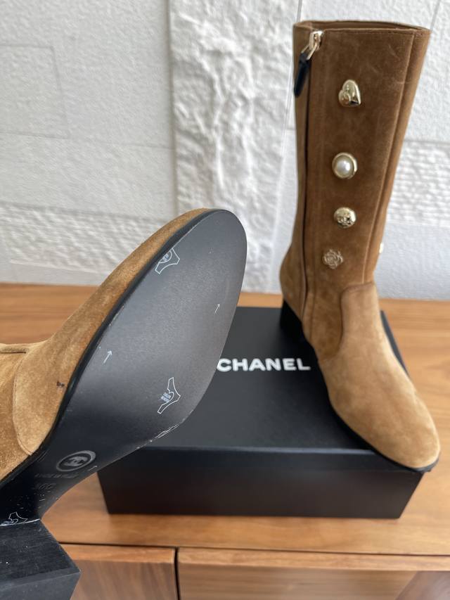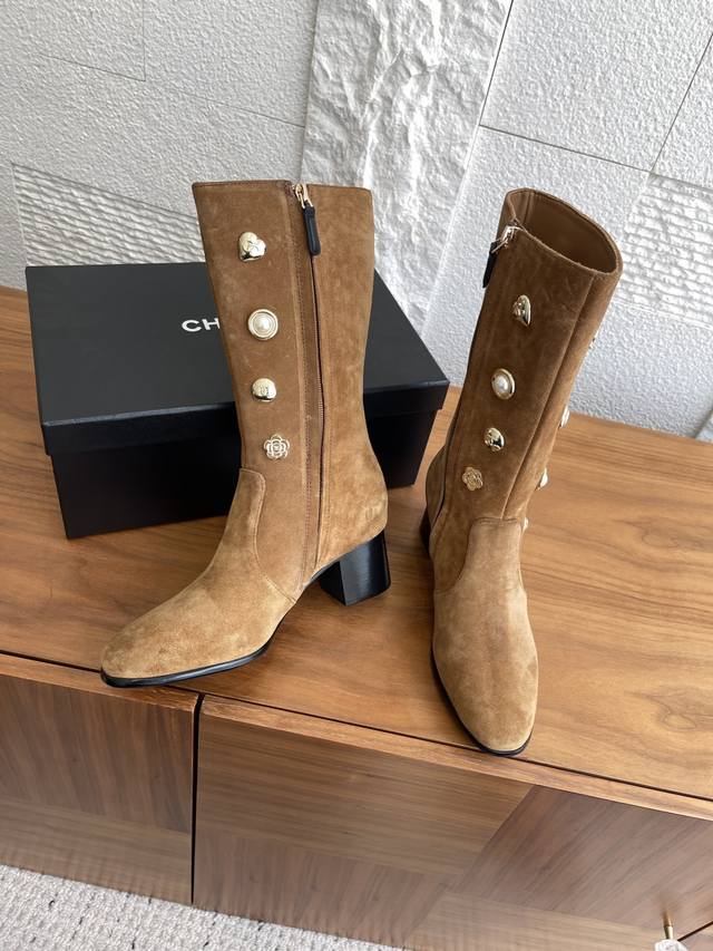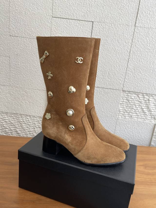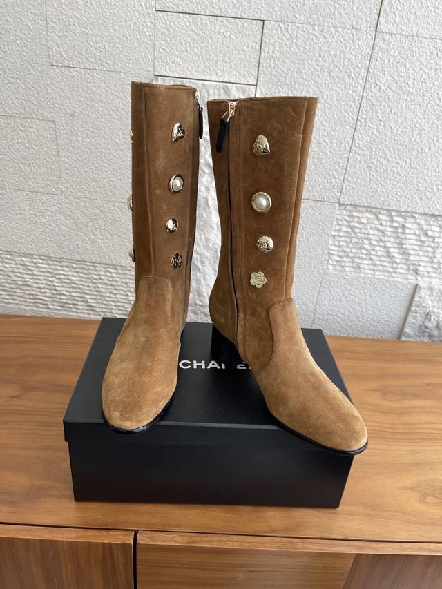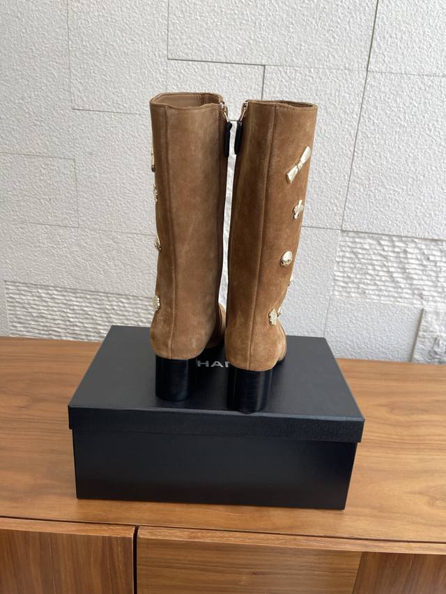 顶级版本: Chanel 香奈儿 25K 秋冬新款 金属饰扣 珍珠 内侧拉链 高跟 中筒靴 Chanel25K巴黎上新首发,金属扣、蝴蝶结、花朵等经典元素点缀,细节满分!粗跟显腿长,上脚超级显气质,修饰腿部线条,时髦精必备单品带专柜盒子,秋冬必备单品,上脚效果极佳! 面料:进口麂皮 牛皮 内里:进口羊皮 大底:意大利进口真皮大底 Sizr:35-41 40 41定做不退换