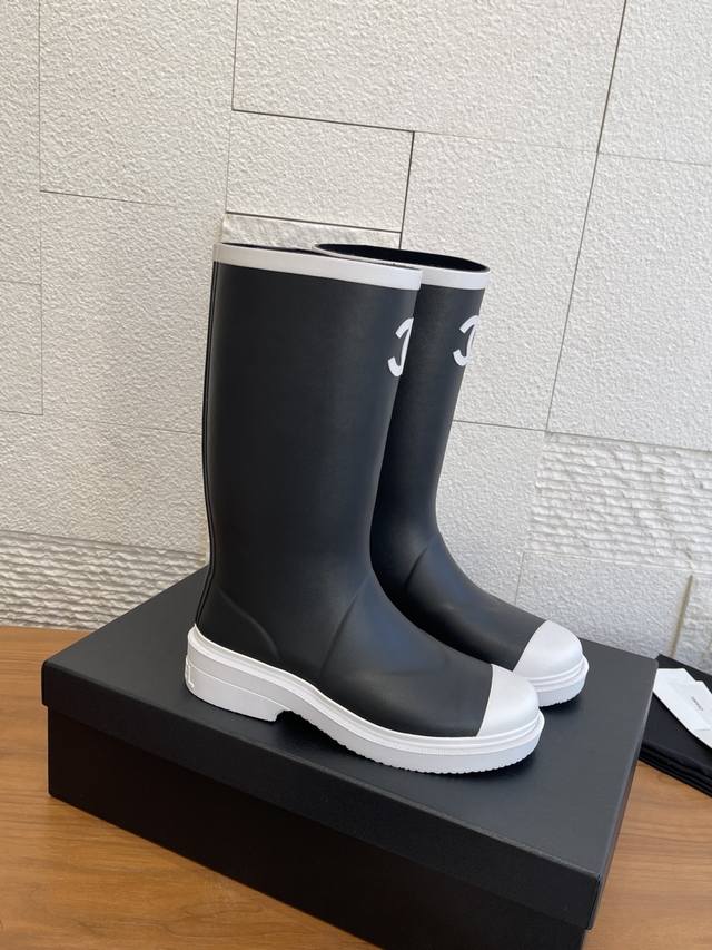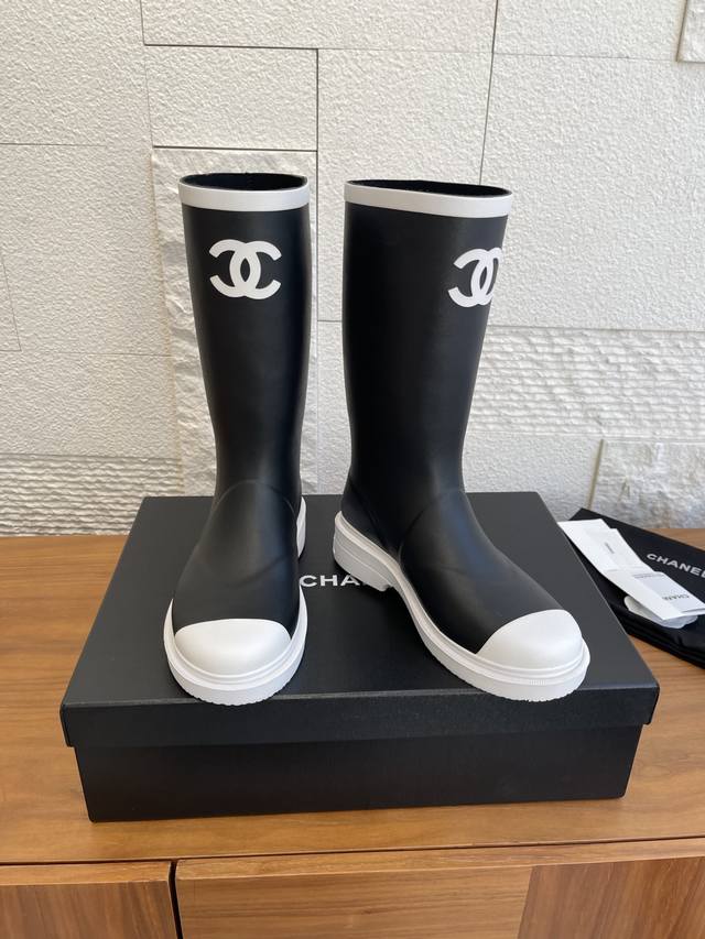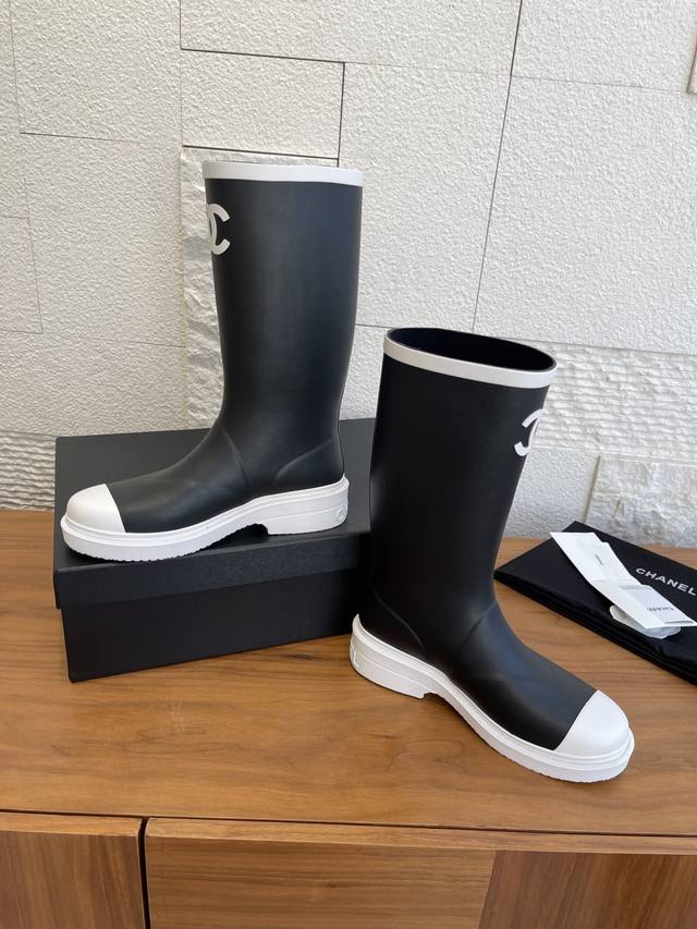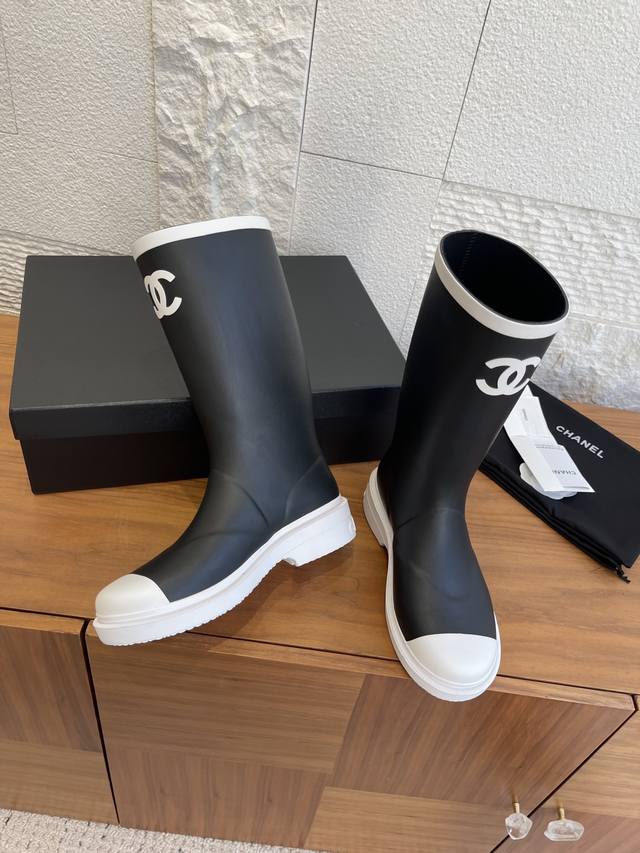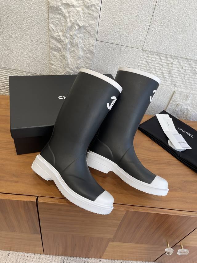 顶级版本: DDD Chanel 香奈儿 26C 黑白拼色 无缝不过膝 长筒雨鞋 DDD 原版购入开模做货。Chanel 26C长筒雨靴,黑白配色超经典,鞋面是光滑橡胶,印有双Clogo,时髦又有辨识度。厚底设计,穿着舒适还能悄悄增高,防水力满分,雨天出街也不怕湿脚!搭配裙装或牛仔裤都很出彩,轻松打造时尚造型 DDD Size:35-41 40 41定做不退换 DDD