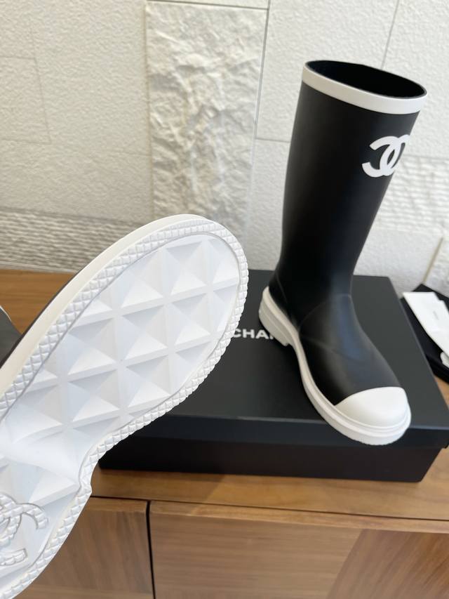 / 顶级版本: Chanel 香奈儿 26C 黑白拼色 无缝不过膝 长筒雨鞋 原版购入开模做货。Chanel 26C长筒雨靴,黑白配色超经典,鞋面是光滑橡胶,印有双