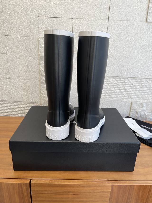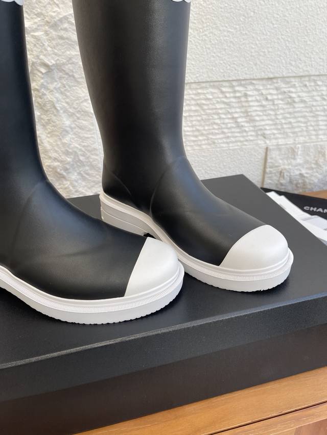 顶级版本: Chanel 香奈儿 26C 黑白拼色 无缝不过膝 长筒雨鞋 原版购入开模做货。Chanel 26C长筒雨靴,黑白配色超经典,鞋面是光滑橡胶,印有双