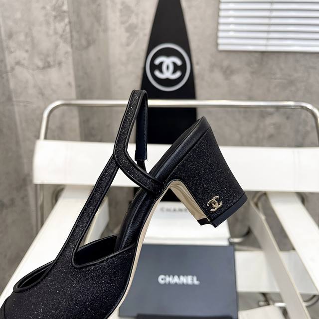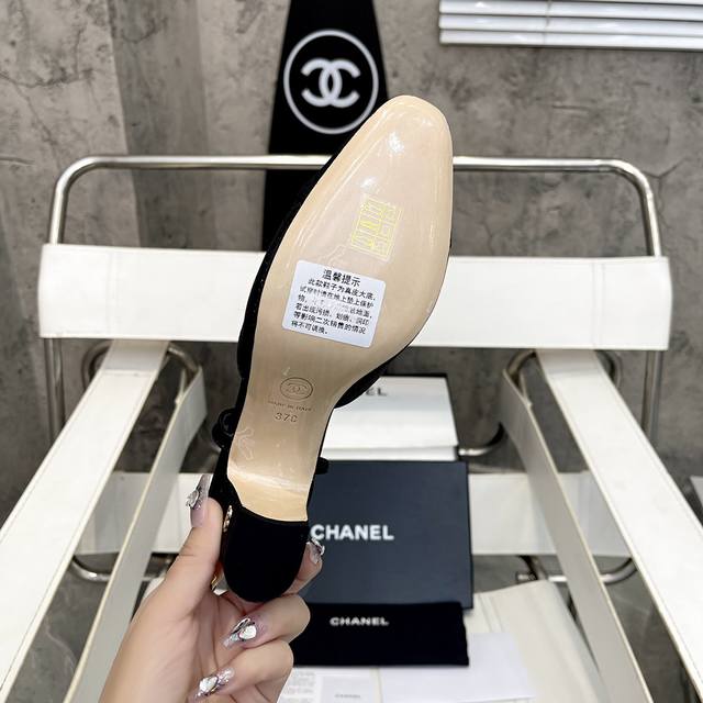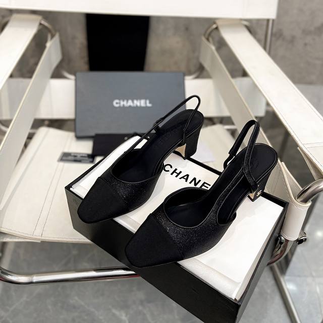 / 香奈儿最新系列,出厂价p 粗跟方头拼色百搭高跟后空女凉鞋 材质:鞋面采用进口全粒面混种羊皮拼接真丝绸缎+内里混种羊皮+意大利进口牛皮底Size:35–39 跟高