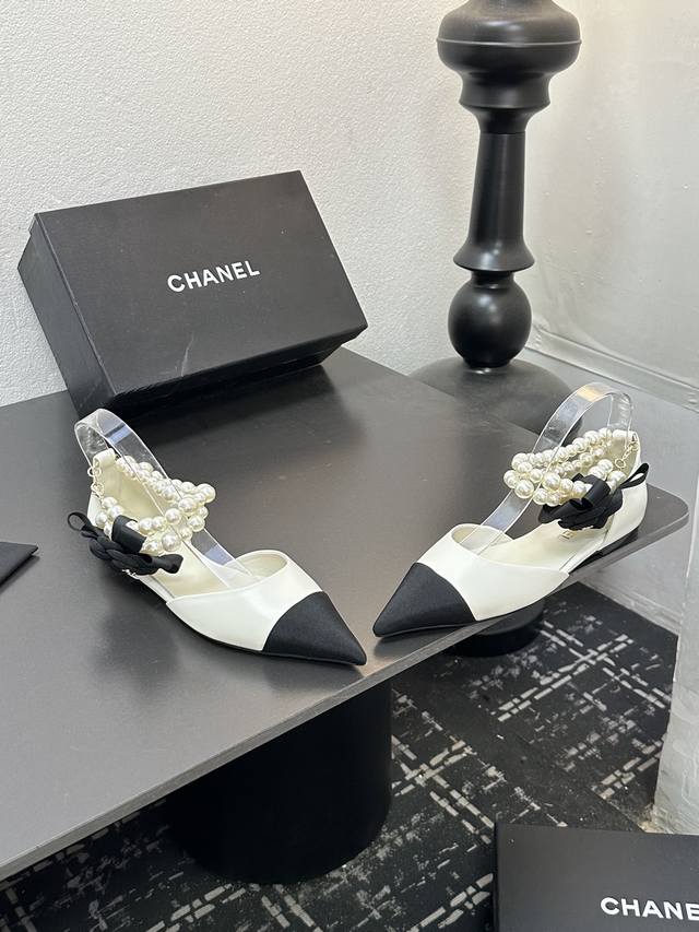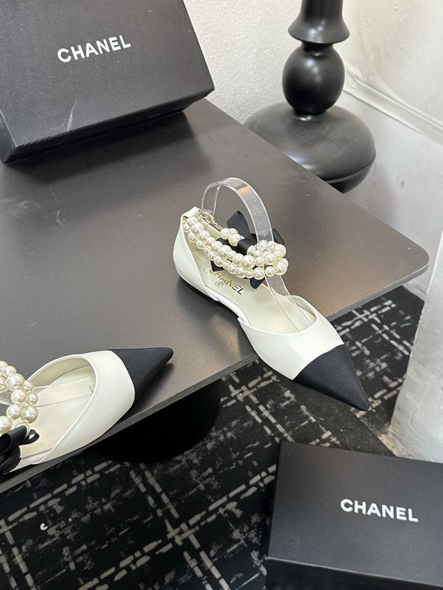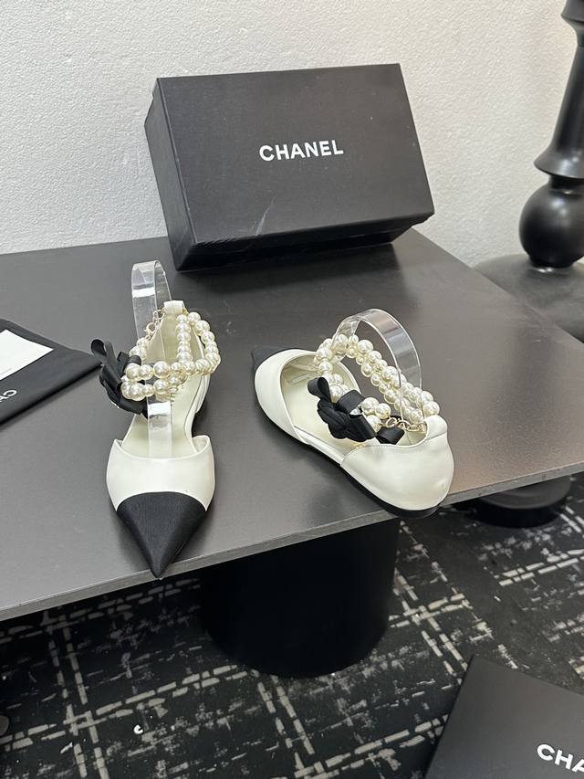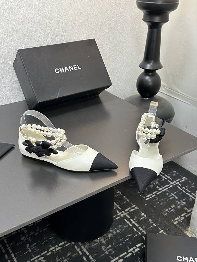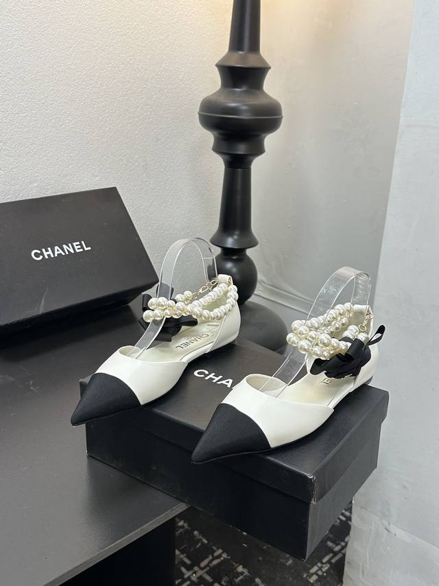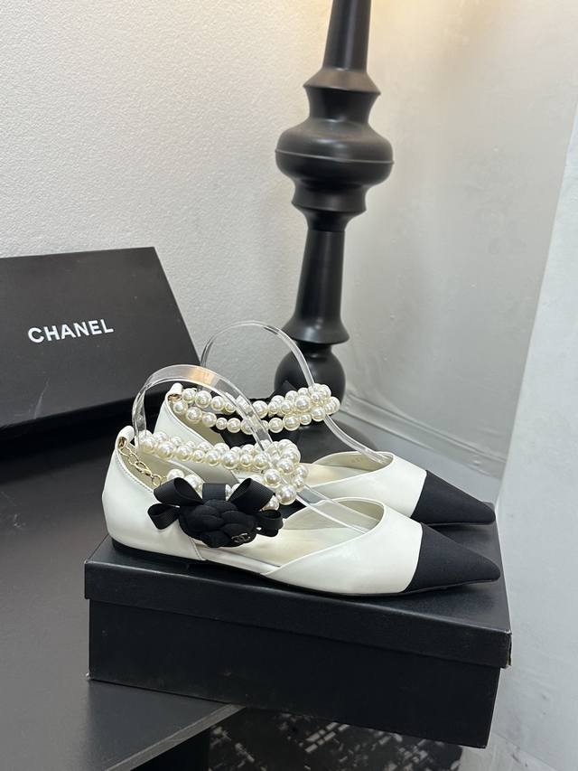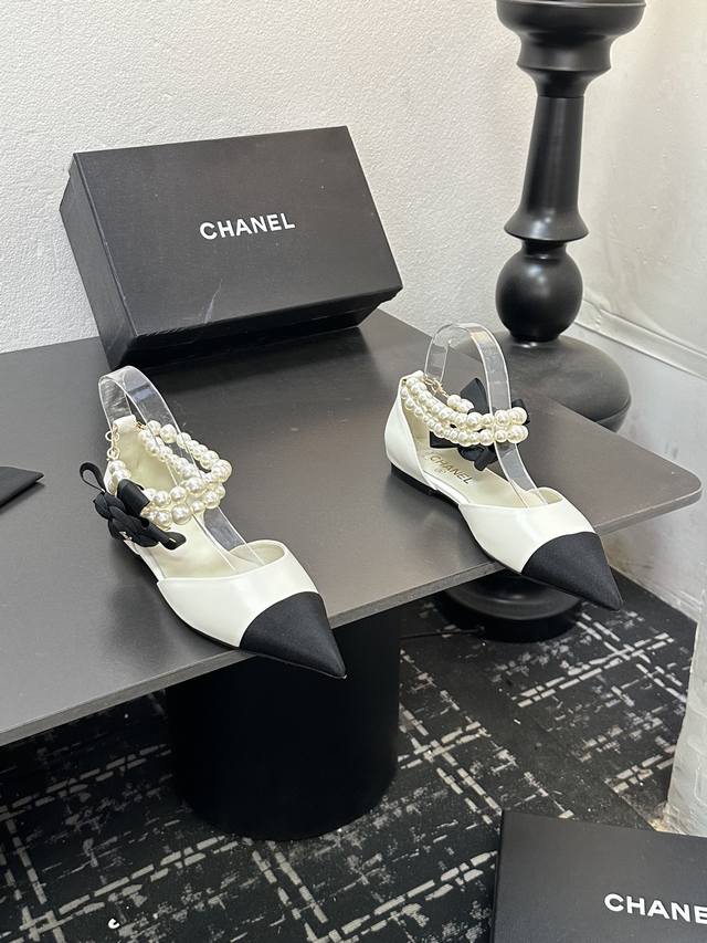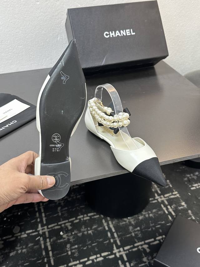 2026春夏新款 Chanel小香26C 尖头脚环大珍珠凉鞋双C扣山茶花平底玛丽珍经典双拼色中空单鞋 DDD 这款凉鞋以利落剪裁开启春夏序章,拼色设计碰撞出鲜活灵感,中空版型让肌肤与微风自在相拥,每一步都踩着轻盈韵律 。脚踝间的宽幅脚环是点睛之笔,硕大珍珠串饰随步履轻颤,延续着小香珍珠成为柔美元素的初心,打破华贵与日常的边界 让精致无需浮夸。 DDD 尖头设计巧妙延伸腿部线条 视觉上拉长比例 DDD 轻松打造“大长腿”既视感! DDD 鞋面:小羊皮 DDD 内里垫脚:羊皮 DDD 鞋底:意大利真皮大底 D