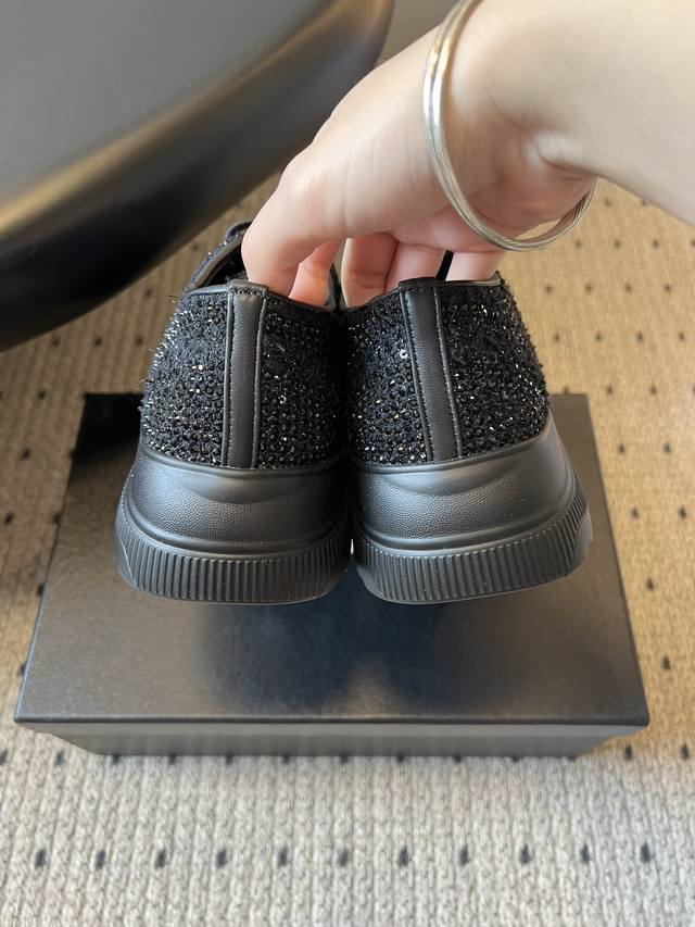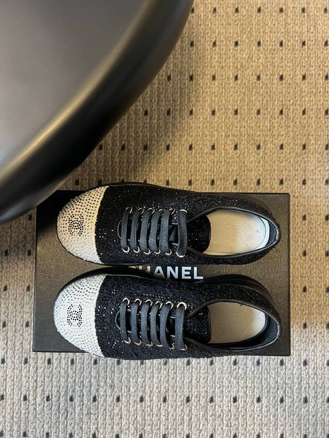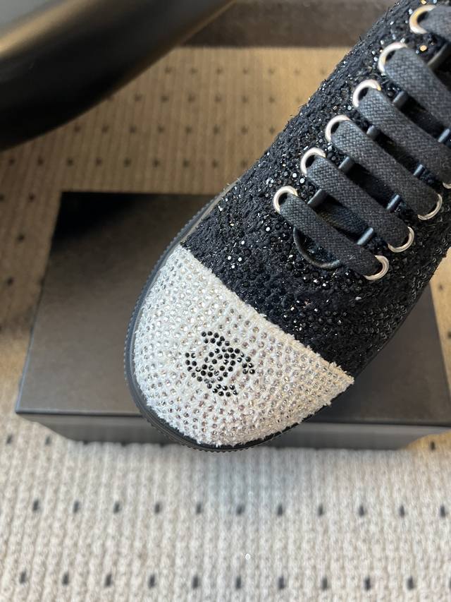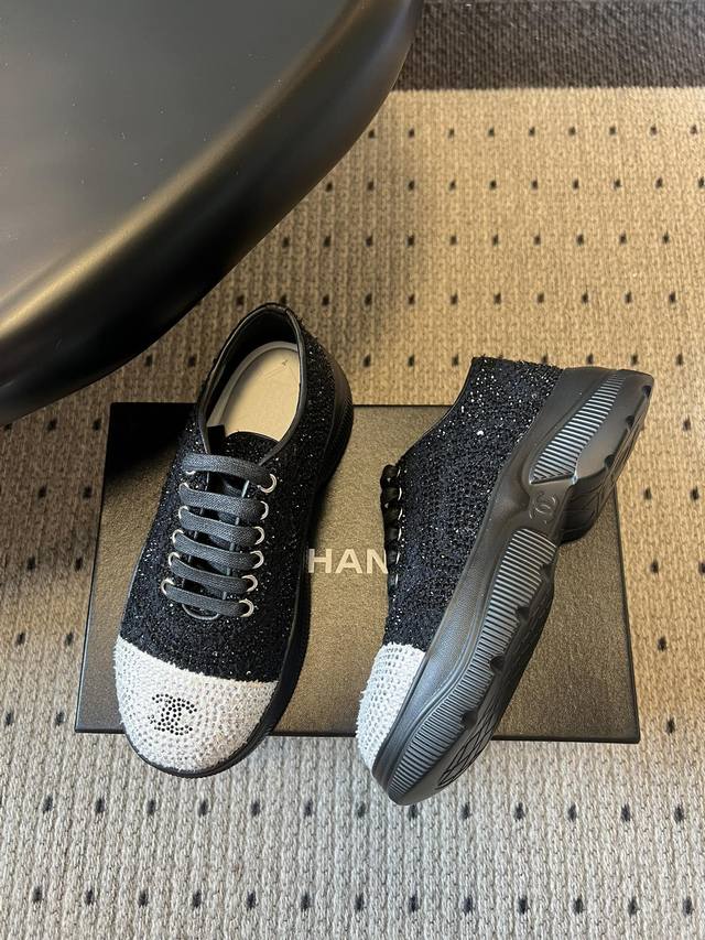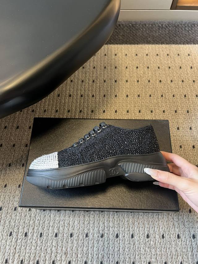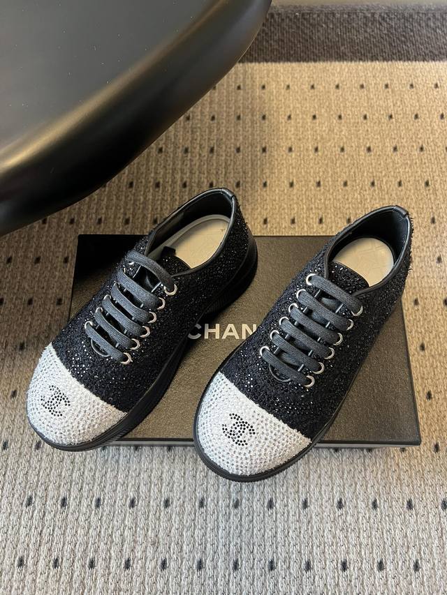 Chane*厚底烫钻拼色绑带运动鞋休闲鞋 DDD 鞋面大面积采用水钻镶嵌工艺,钻面排列紧密且闪耀,鞋头与鞋身的拼色部分通过水钻分区打造,工艺精细。延续品牌经典的黑白撞色风格,两款分别为“白身黑头”与“黑头白身”的反向拼色设计,鞋头处嵌有双C金属Logo,低调凸显品牌标识; DDD 低帮的经典板鞋轮廓,鞋型简约利落,鞋头圆润,上脚贴合脚型,兼顾日常穿着的舒适度与搭配性。将休闲板鞋的随性与水钻的奢华感结合,打破了轻奢配饰与休闲鞋履的风格边界,既适合日常出街也能搭配精致造型。 DDD 鞋面:牛皮 Ddd 内里: