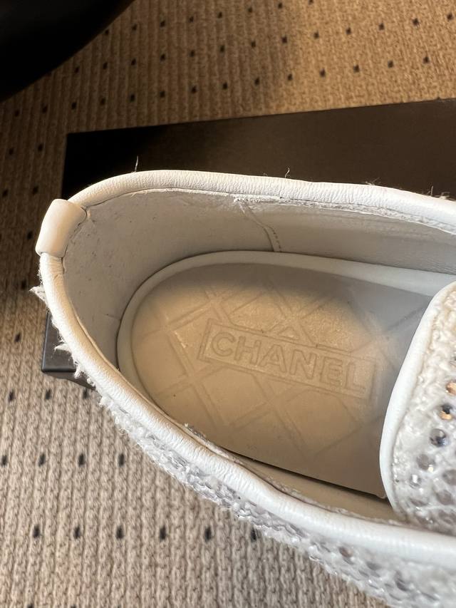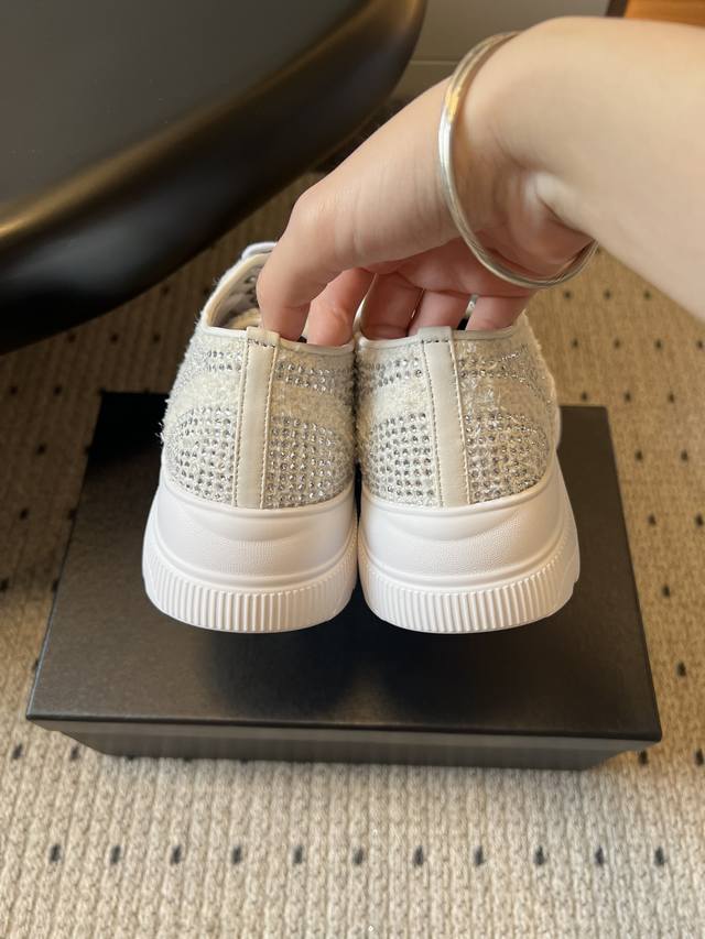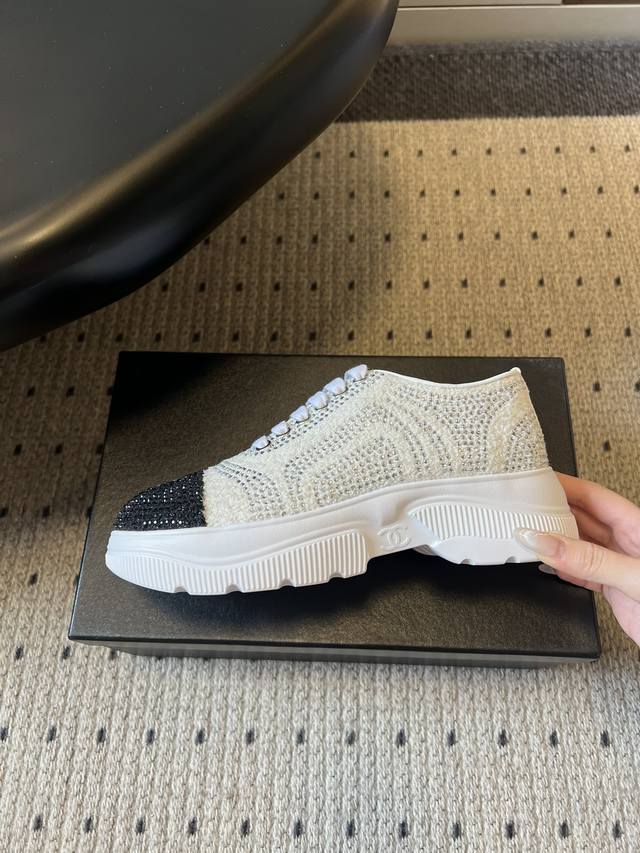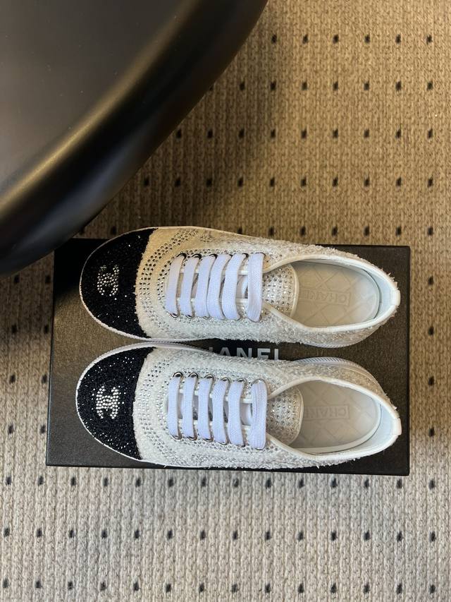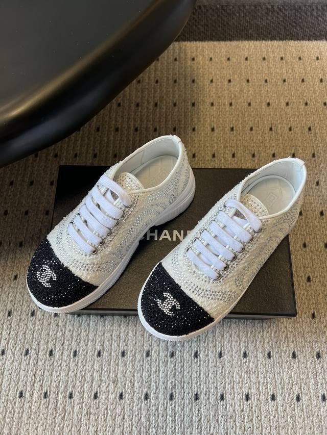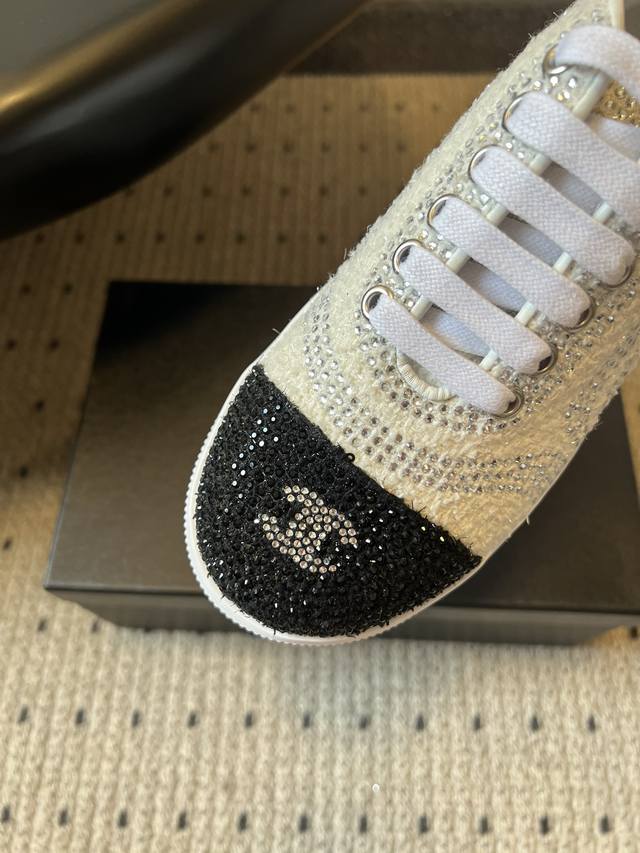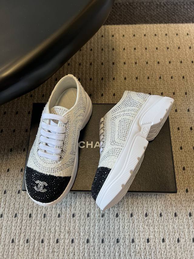 Chane*厚底烫钻拼色绑带运动鞋休闲鞋 DDD 鞋面大面积采用水钻镶嵌工艺,钻面排列紧密且闪耀,鞋头与鞋身的拼色部分通过水钻分区打造,工艺精细。延续品牌经典的黑白撞色风格,两款分别为“白身黑头”与“黑头白身”的反向拼色设计,鞋头处嵌有双C金属Logo,低调凸显品牌标识; DDD 低帮的经典板鞋轮廓,鞋型简约利落,鞋头圆润,上脚贴合脚型,兼顾日常穿着的舒适度与搭配性。将休闲板鞋的随性与水钻的奢华感结合,打破了轻奢配饰与休闲鞋履的风格边界,既适合日常出街也能搭配精致造型。 DDD 鞋面:牛皮 Ddd 内里: