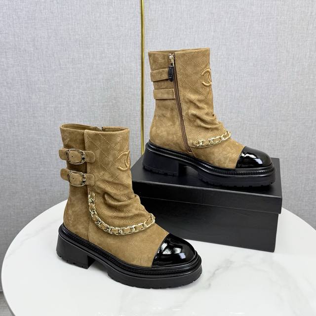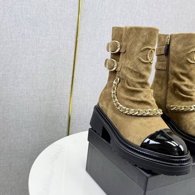 Chane*|小香25B秋冬新品双C 链条靴子系列 链条的装饰为靴子增添了一份随性与不羁 在行走间 散发着独特的魅力。 短靴的设计简洁大方 恰到好处的靴筒 内里
