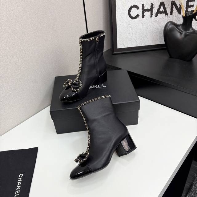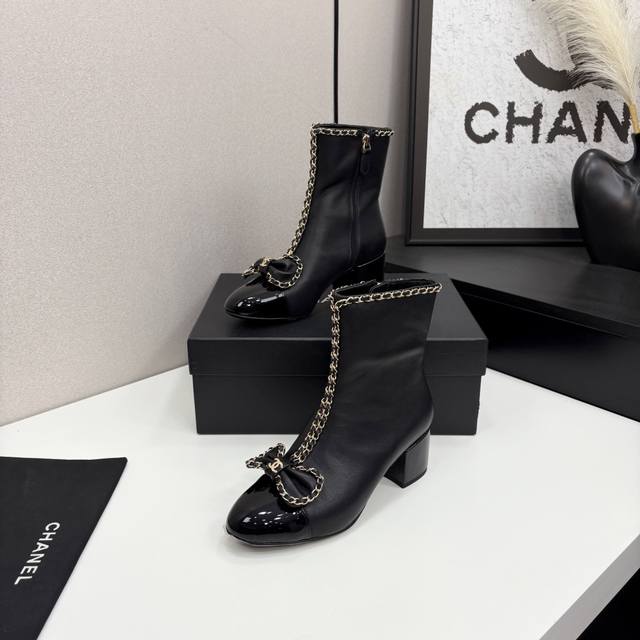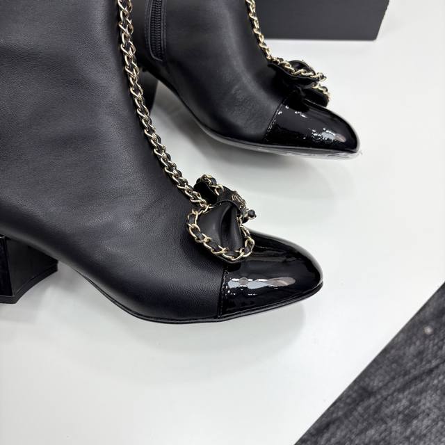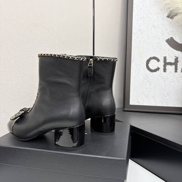 Chane*|小香25P链条蝴蝶结粗跟短靴 本季王炸神款香家经典蝴蝶结链条元素,时髦感十足的单品!造型立体饱满,帅气十足!谁穿谁爱上!真的值得入手! 面料采用进