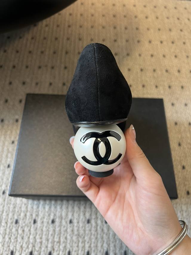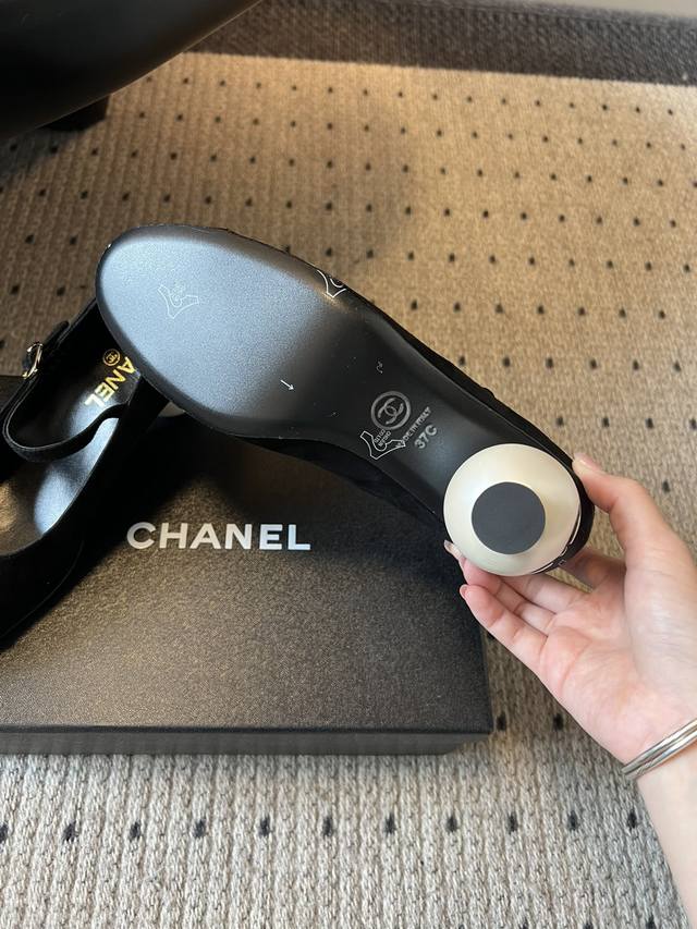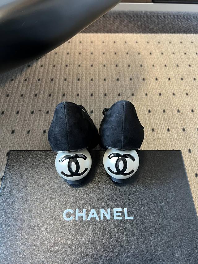 / Chane* 小香创意珍珠跟玛丽珍单鞋 鞋跟采用标志性的双C Logo球形设计,极具辨识度,打破了传统鞋跟的形态,充满艺术感与品牌特色。 鞋面为黑色皮革,质感细