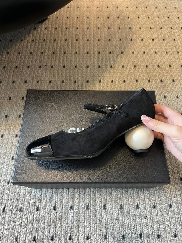 Chane* 小香创意珍珠跟玛丽珍单鞋 鞋跟采用标志性的双C Logo球形设计,极具辨识度,打破了传统鞋跟的形态,充满艺术感与品牌特色。 鞋面为黑色皮革,质感细