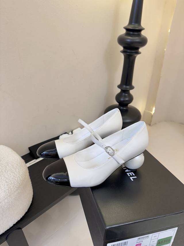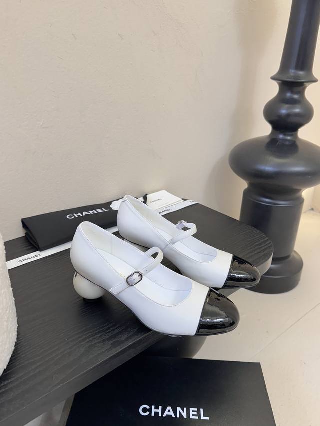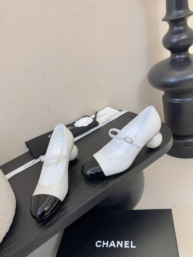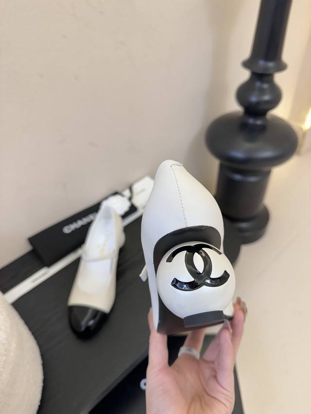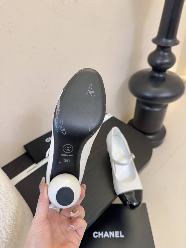 / Chane* 小香创意珍珠跟玛丽珍单鞋 鞋跟采用标志性的双C Logo球形设计,极具辨识度,打破了传统鞋跟的形态,充满艺术感与品牌特色。 鞋面为黑色皮革,质感细