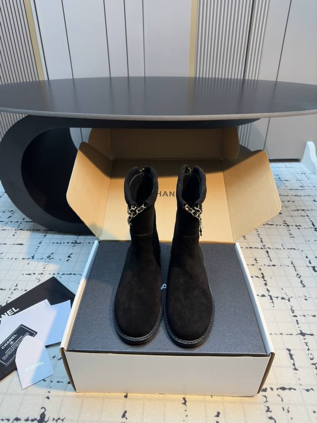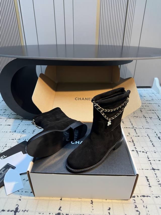 Chane* 小香双链条短靴 DDD 靴筒处搭配小香标志性的双C金属链条,同时链条上还悬挂着四叶草造型的金属吊坠,为整体增添了奢华感与精致细节,同时四叶草元素也带有幸运的寓意。 DDD 这款鞋融合了复古、轻奢的风格,既可以为日常穿搭增添亮点,也能在一些稍正式的场合展现独特品味,是一双兼具美观与实穿性的靴子。 DDD 鞋面:牛皮 牛反绒 DDD 内里:羊皮 DDD 大底:真皮大底 DDD 码数:35 40 40定做不退不换 DDD 绒面 皮面 DDD