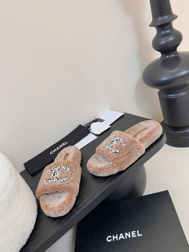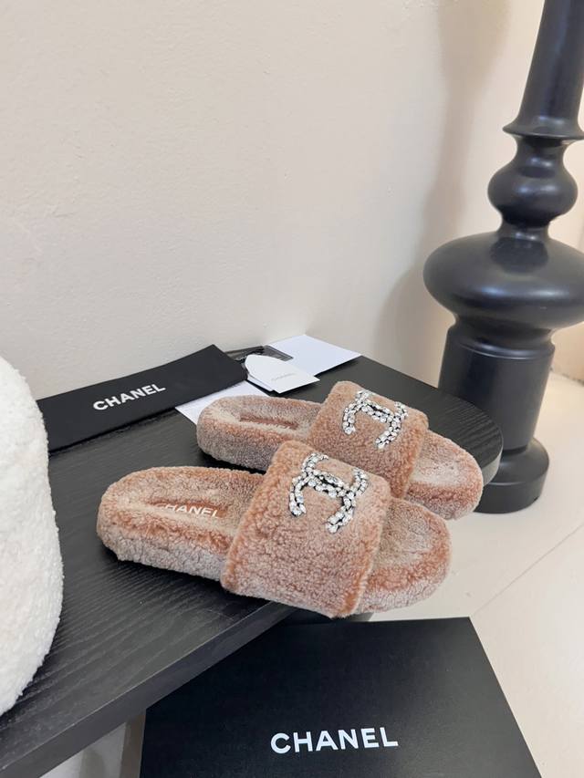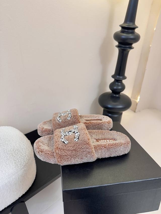 Chane* |小香经典双C水钻毛毛拖鞋 “抢先穿”系列 行走的羊咩咩毛茸茸的实在是太可爱太舒服啦!简洁、精美风格的小香是很多女孩的心头好羊毛鞋面镶嵌水钻双C大