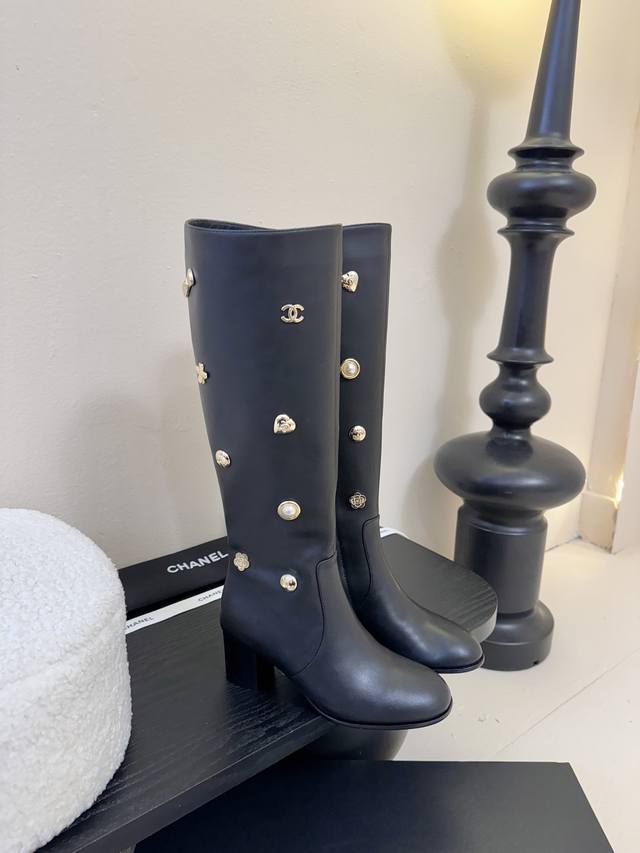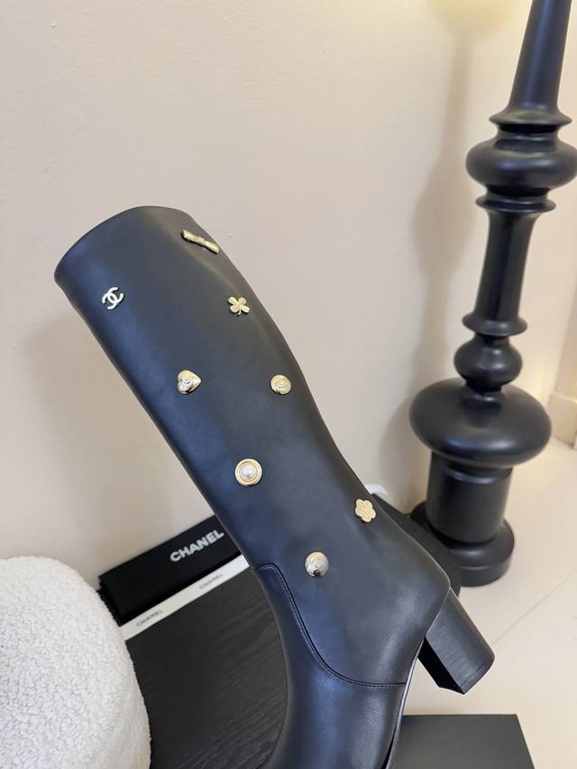 中靴 -长靴 - Chanel 小香25A 秋冬新款双C菱格坡跟弹力靴过膝长靴后拉链长靴 鞋头标志性电绣双C标志低调闪耀,不仅是身份象征...