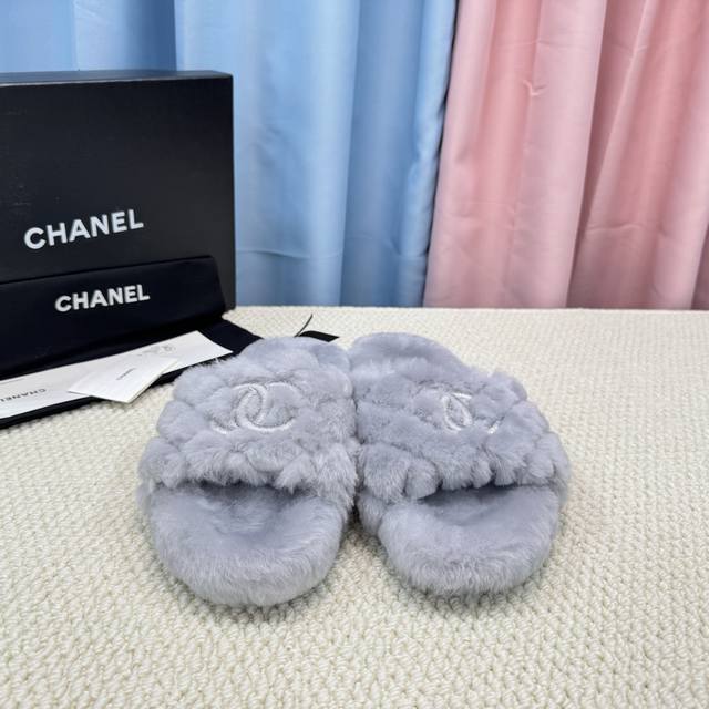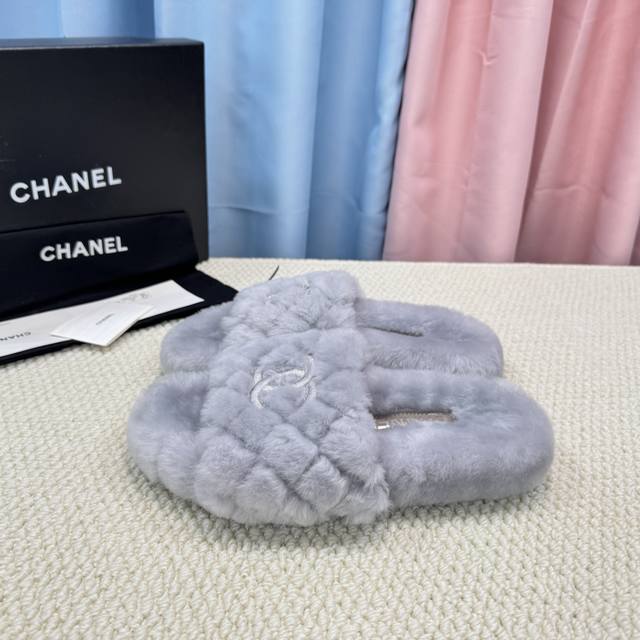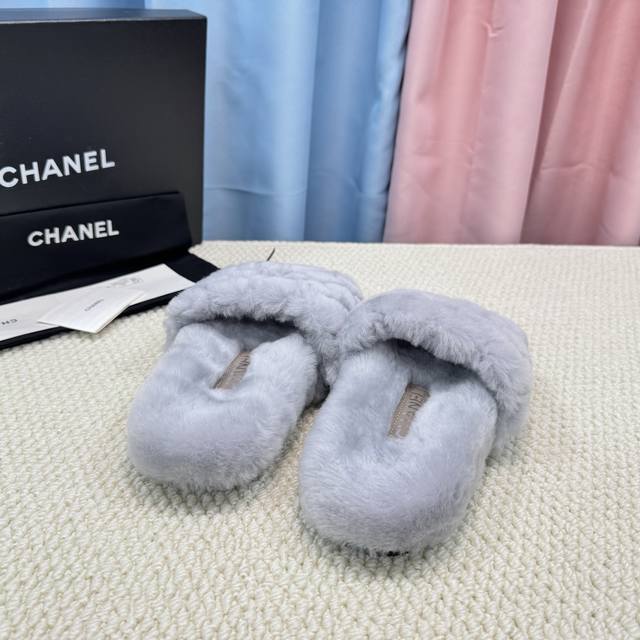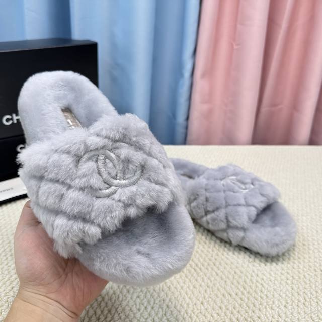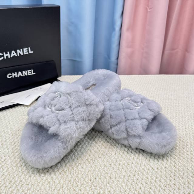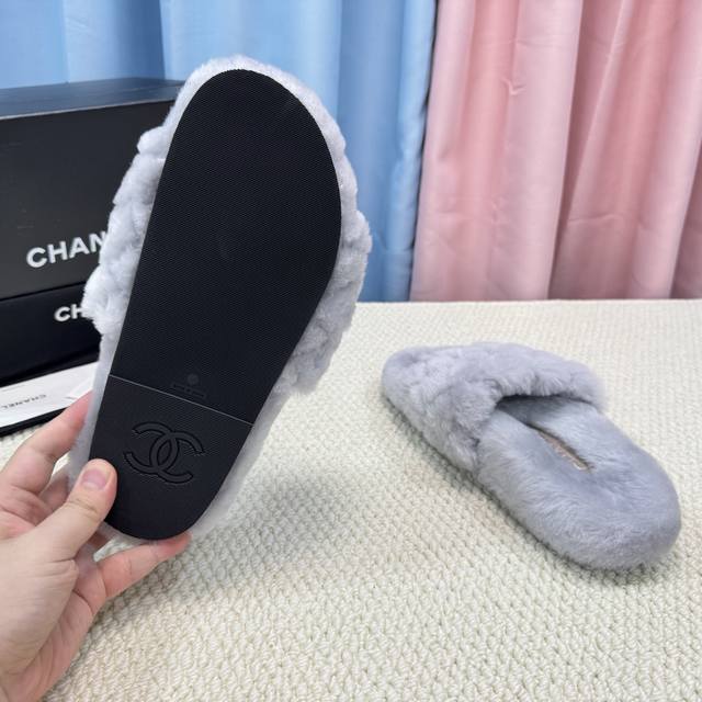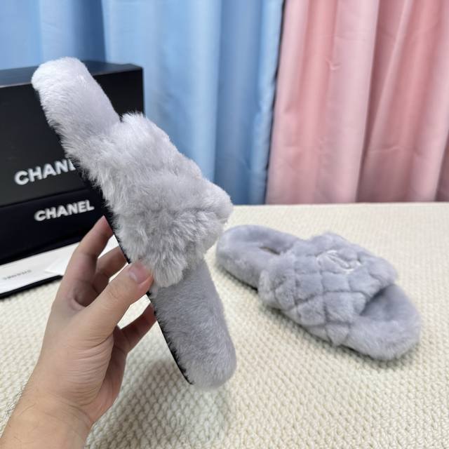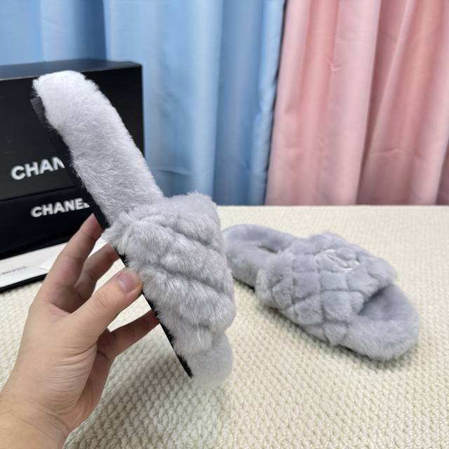 Chanel新色羊毛拖鞋頂级品质纯皮毛一体羔羊毛打造!米超温暖的感觉,穿上仿佛踩在云朵上经典老花装饰,精致高级!让这双毛拖身价陡增!鞋底是原版开模的防滑橡胶大底,非常好穿不打滑,而且鞋底有一定厚度,舒适度极佳!码数35-40 DDD