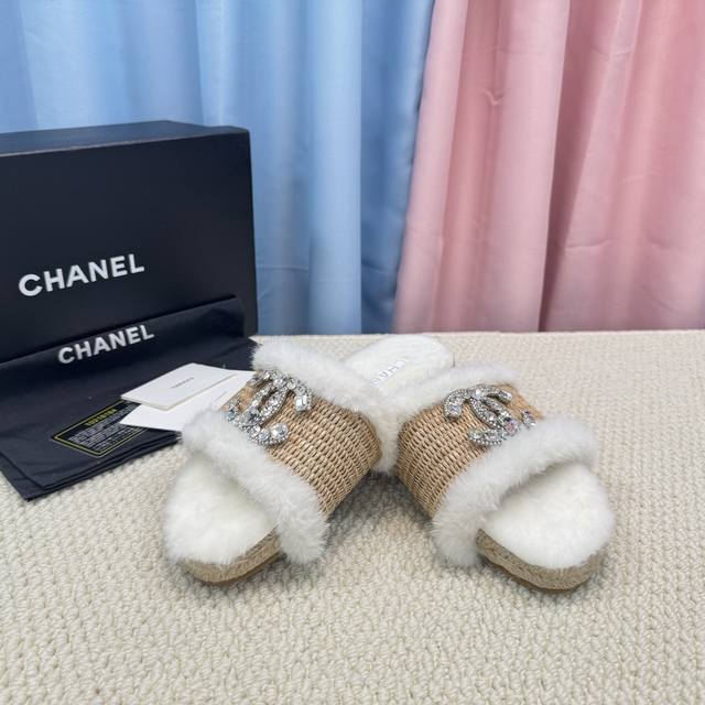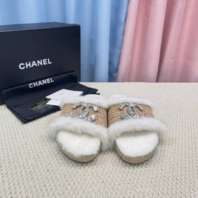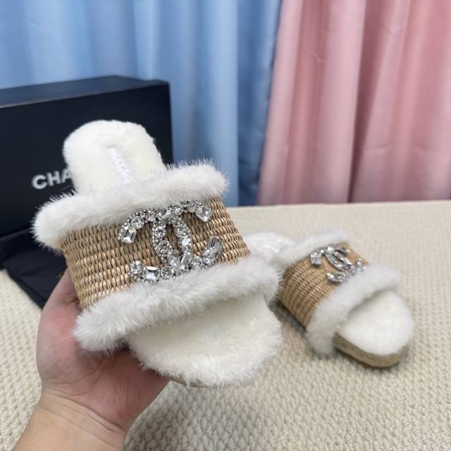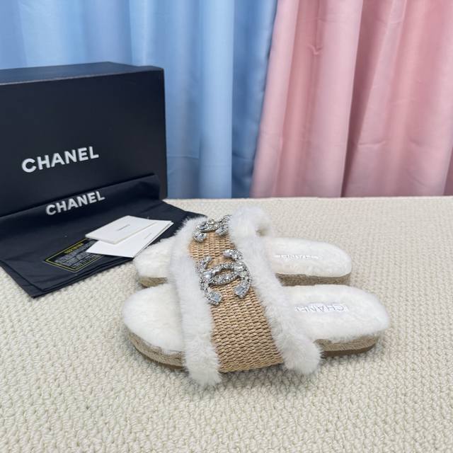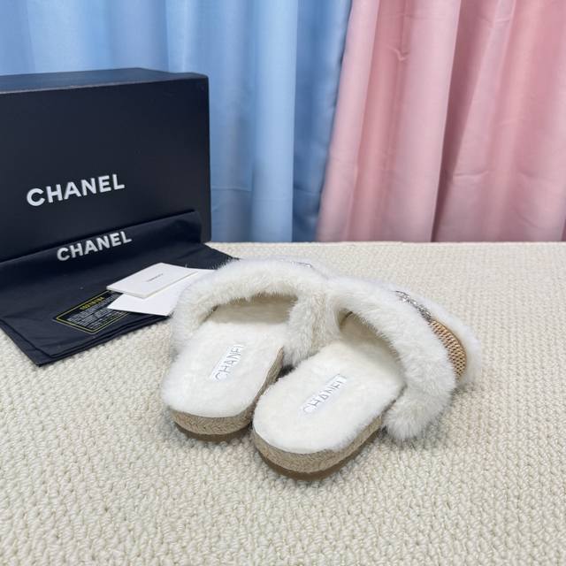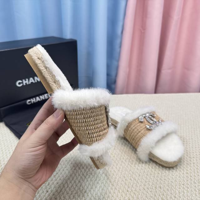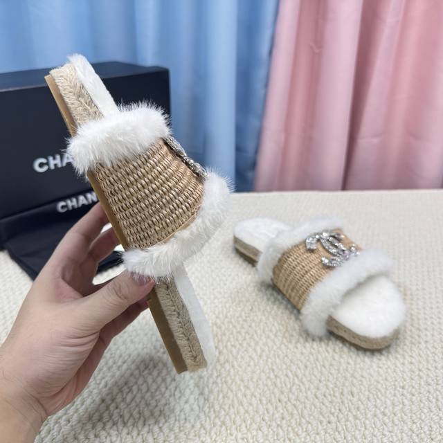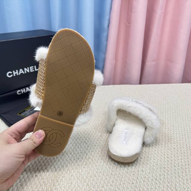 Chanel新色羊毛拖鞋頂级品质纯皮毛一体羔羊毛打造!米超温暖的感觉,穿上仿佛踩在云朵上经典老花装饰,精致高级!让这双毛拖身价陡增!鞋底是原版开模的防滑橡胶大底,非常好穿不打滑,而且鞋底有一定厚度,舒适度极佳!码数35-40, 40一43定做 DDD