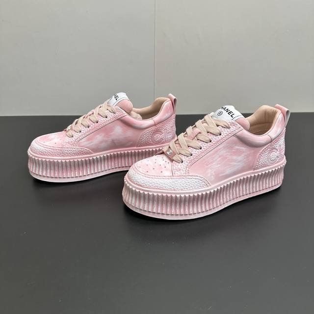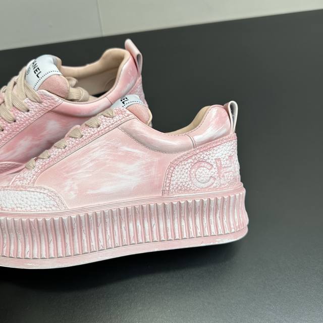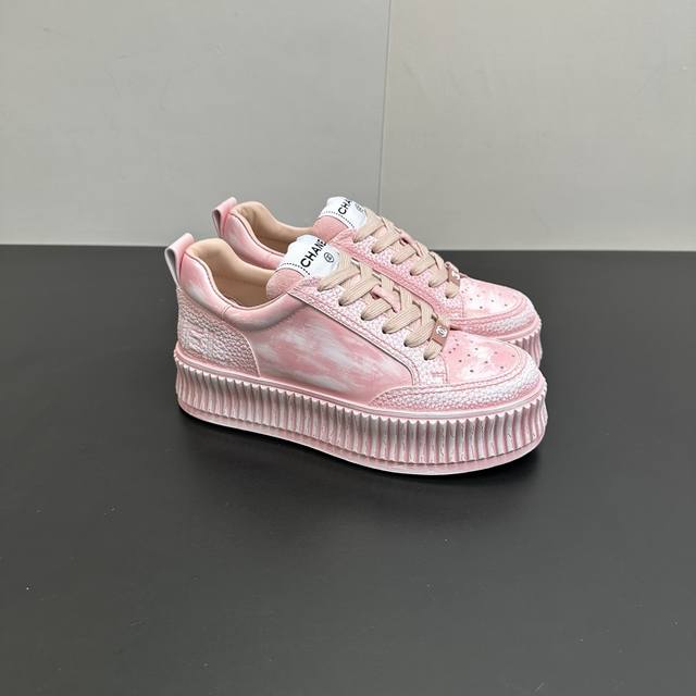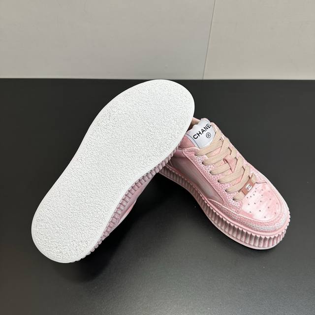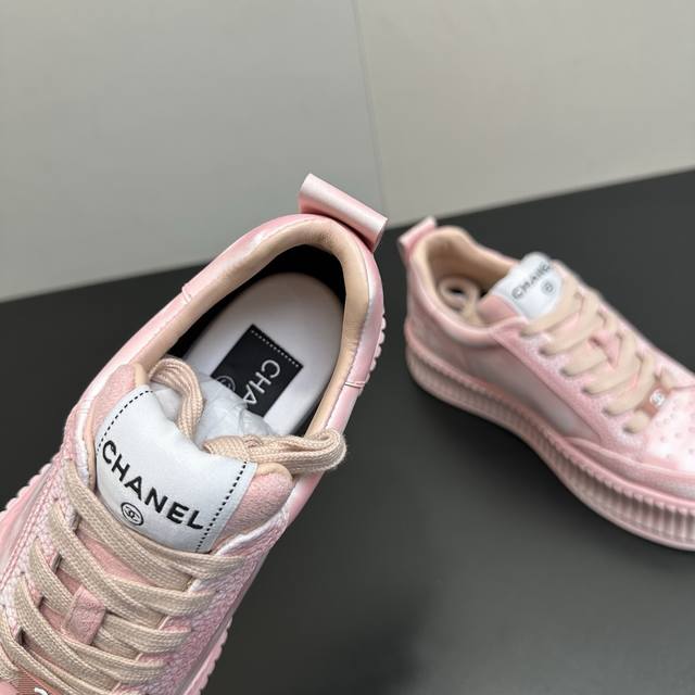 Chanel香奈儿厚底做旧脏脏鞋休闲鞋运动小白鞋,也太戳少女心了!粉、蓝、白三色都美到骨子里,做旧工艺让鞋面自带复古氛围感,一点不刻意的斑驳感超有腔调。标志性双