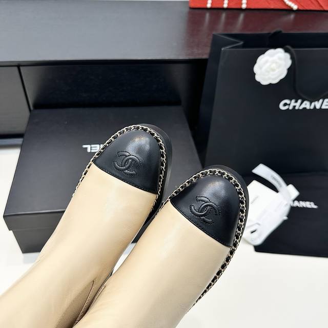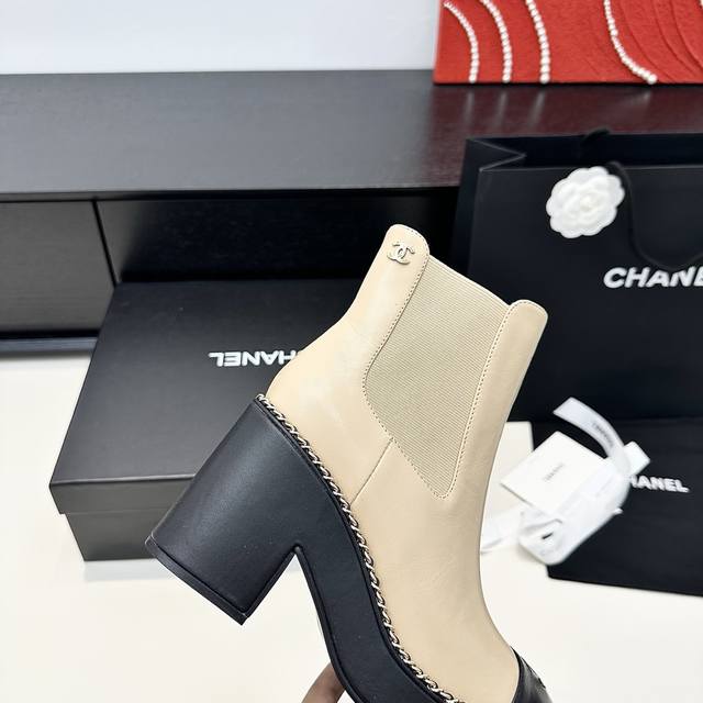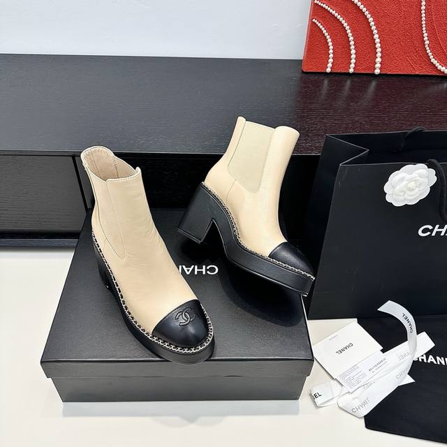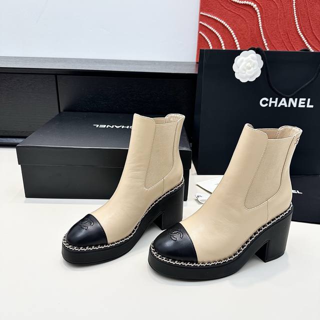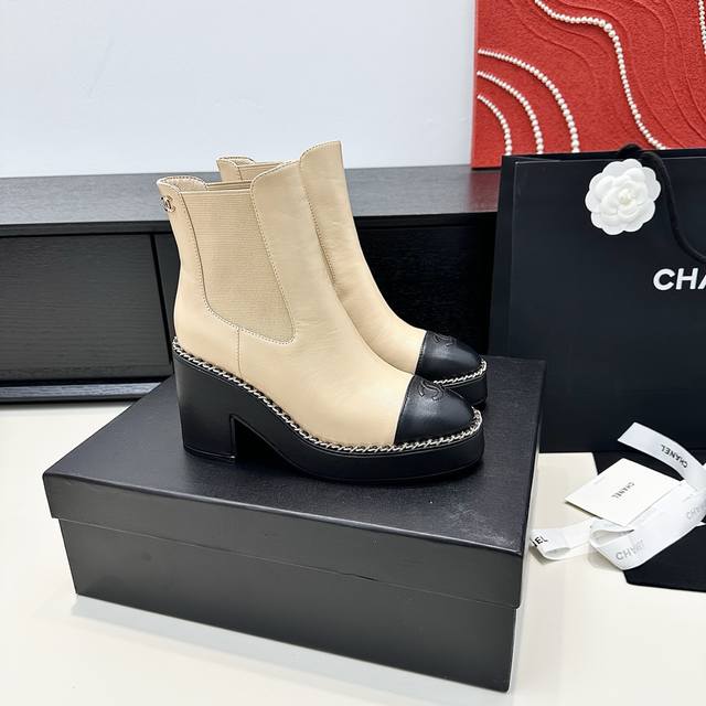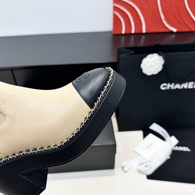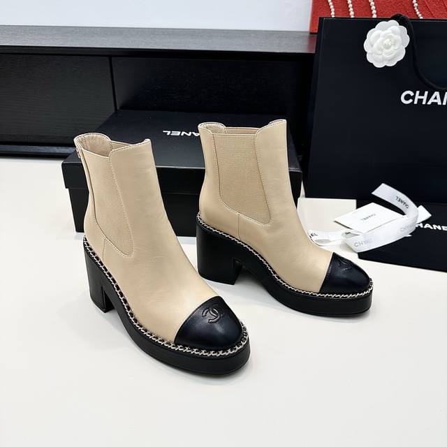 Chanel香奈儿25年早秋新款 小香家粗跟拼色链条裸靴 厚底短靴子 鞋面:牛皮 麂皮 原版大底 跟高:约9Cm左右 正码:35-39订做40.41