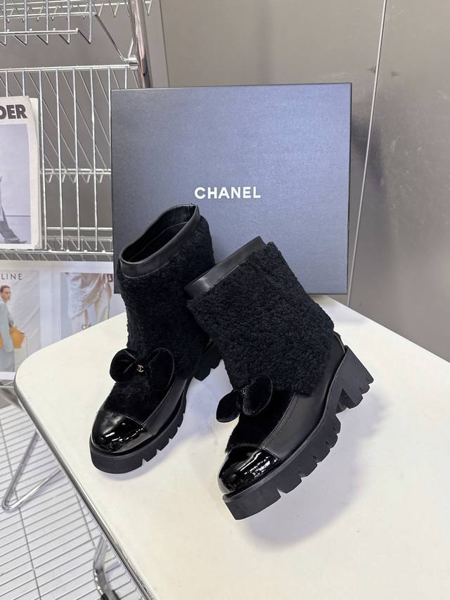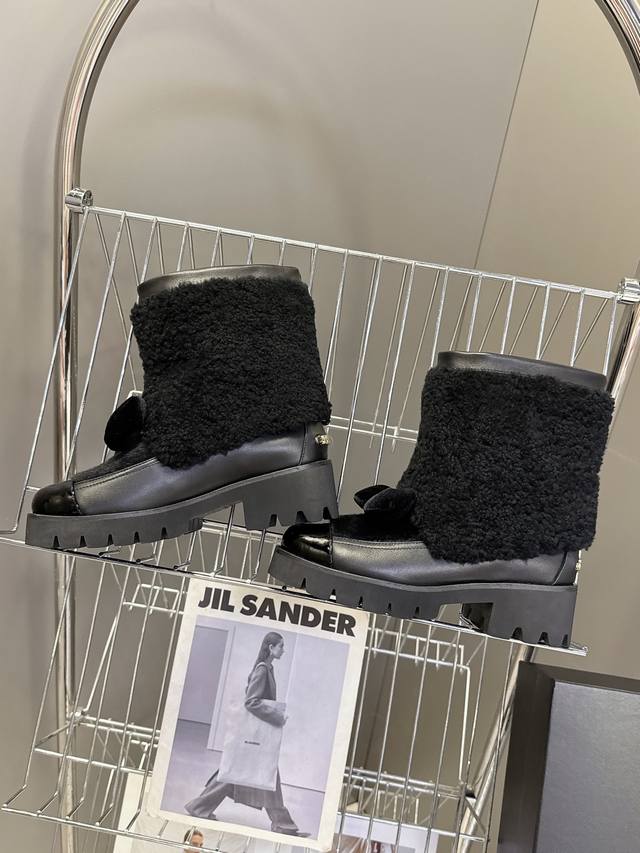 Chanel香奈儿25N滑雪系列蝴蝶结 羊羔毛短靴 超多明星网红种草 可帅气可温柔的小香靴子 蝴蝶结也是它家的一个很经典的元素 搭配羊毛靴筒 设计真的绝绝子 ,