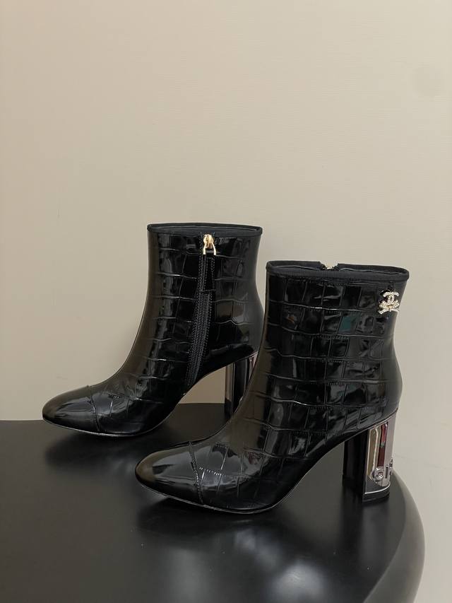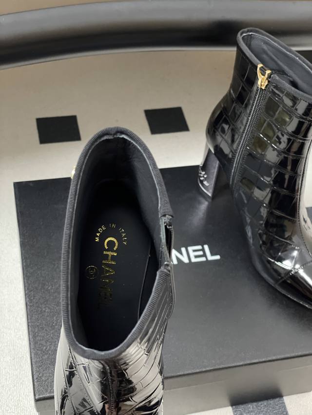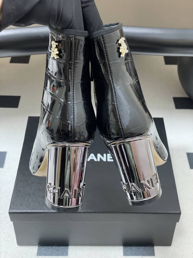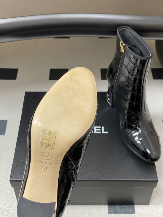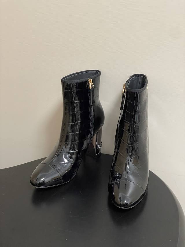 Chanel 小香双色拼接高跟短靴经典双C钻扣侧拉链长靴金属字母粗跟靴子 DDD 米白漆皮+黑色拼接,菱格纹+珍珠点缀,优雅又高级计。粗跟设计,舒适又显腿长,秋冬穿搭超加分无论烟管裤还是裙装都能轻松驾驭,通勤或正式场合都很适合。经典小香风,实用又时髦,是鞋柜里的百搭神器,怎么搭都好看~ DDD 鞋面:石头纹小牛皮 DDD 内里垫脚:羊皮 DDD 跟高:8.5Cm DDD 鞋底:意大利真皮大底 DDD 码数:35-39 34.40.41.42定做不退换 DDD
